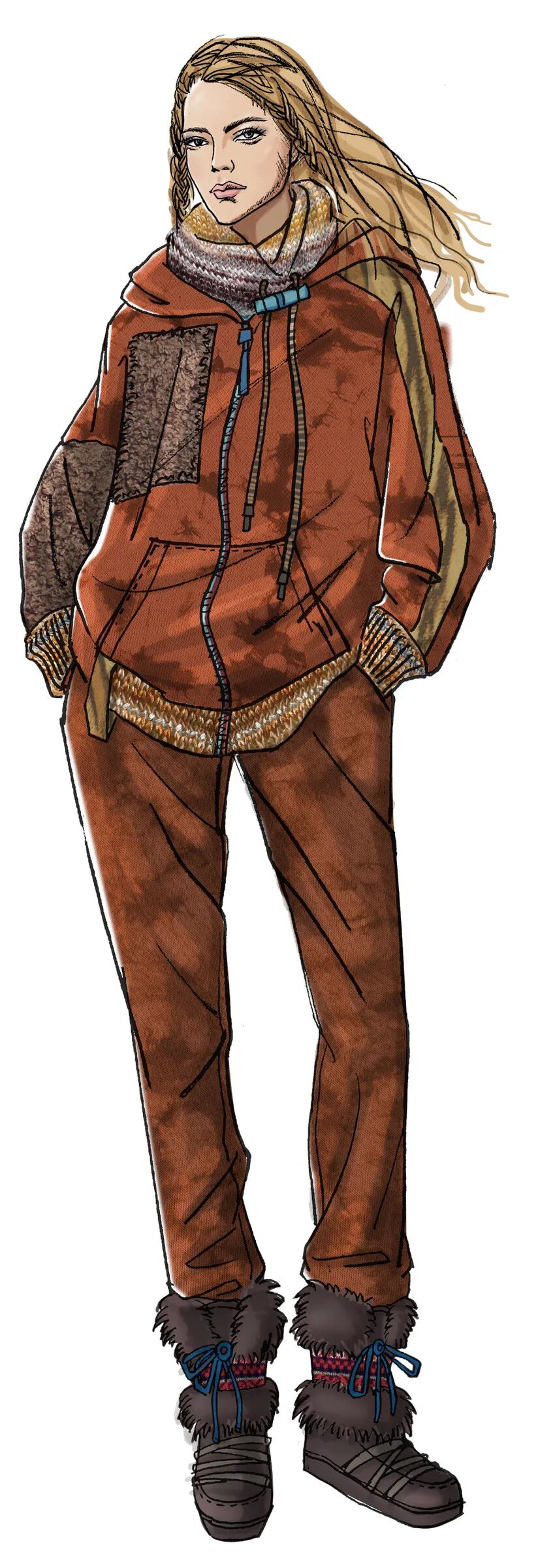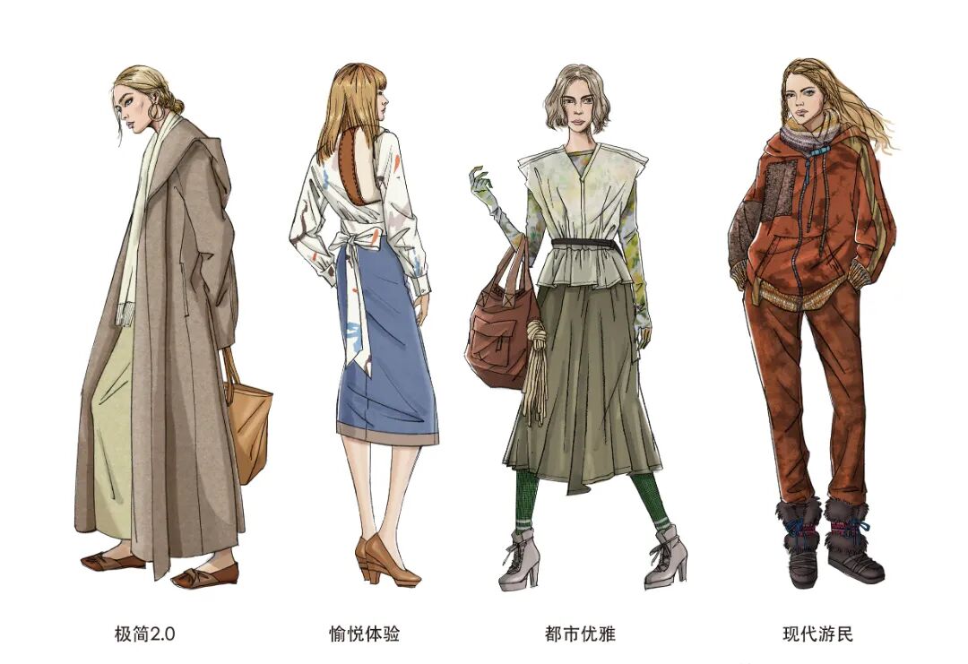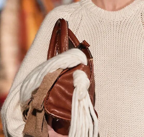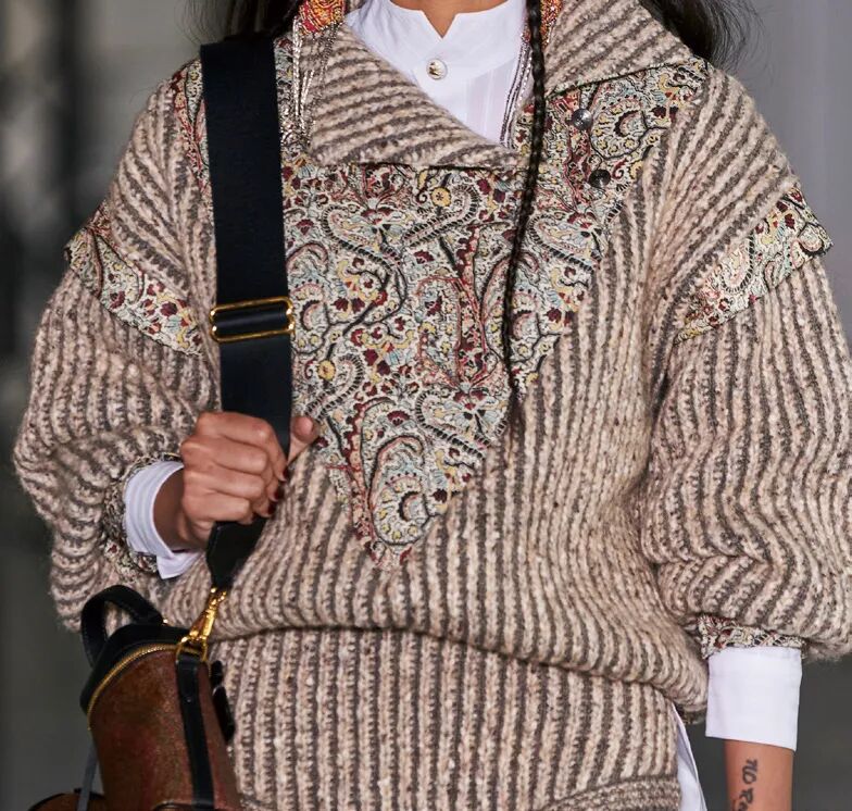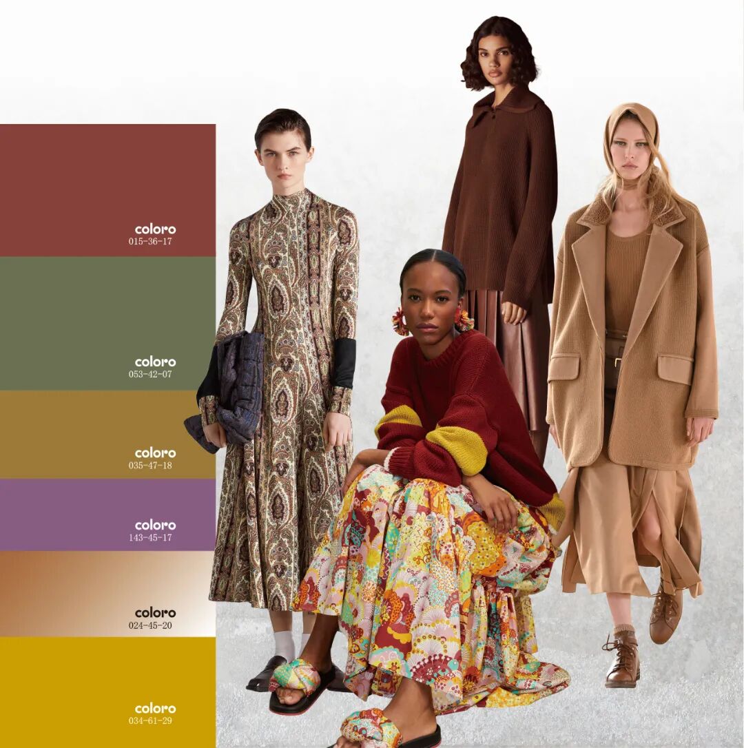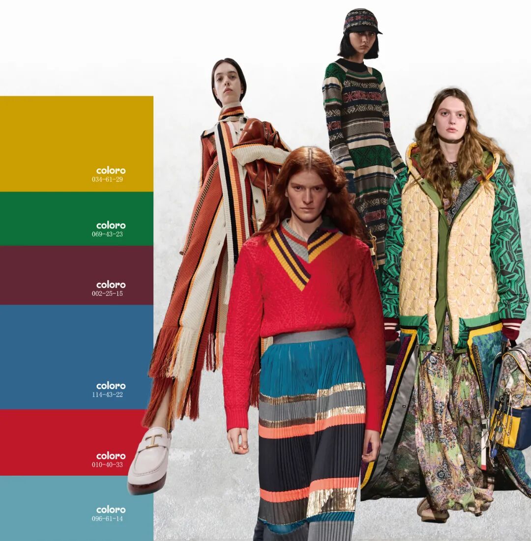 手工艺的复兴为当代造型注入更多灵感,将民俗化符号的设计元素进行现代化表达是关键。Etro是民族化风格的代表品牌,本季多以粗犷风格的花式纱线用于大热的套装设计,辅以绣片等装饰细节,极具日常实穿性。Chloé以多样化的民俗图案打造层叠的视觉效果,超大棒球夹克、拖地连衣裙……将年轻态设计趋势展现的恰到好处。雾蓝色与复古红在日常都市色彩下显得极度和谐,温暖的民俗风色调将引发市场共鸣,锈红色更添质感。