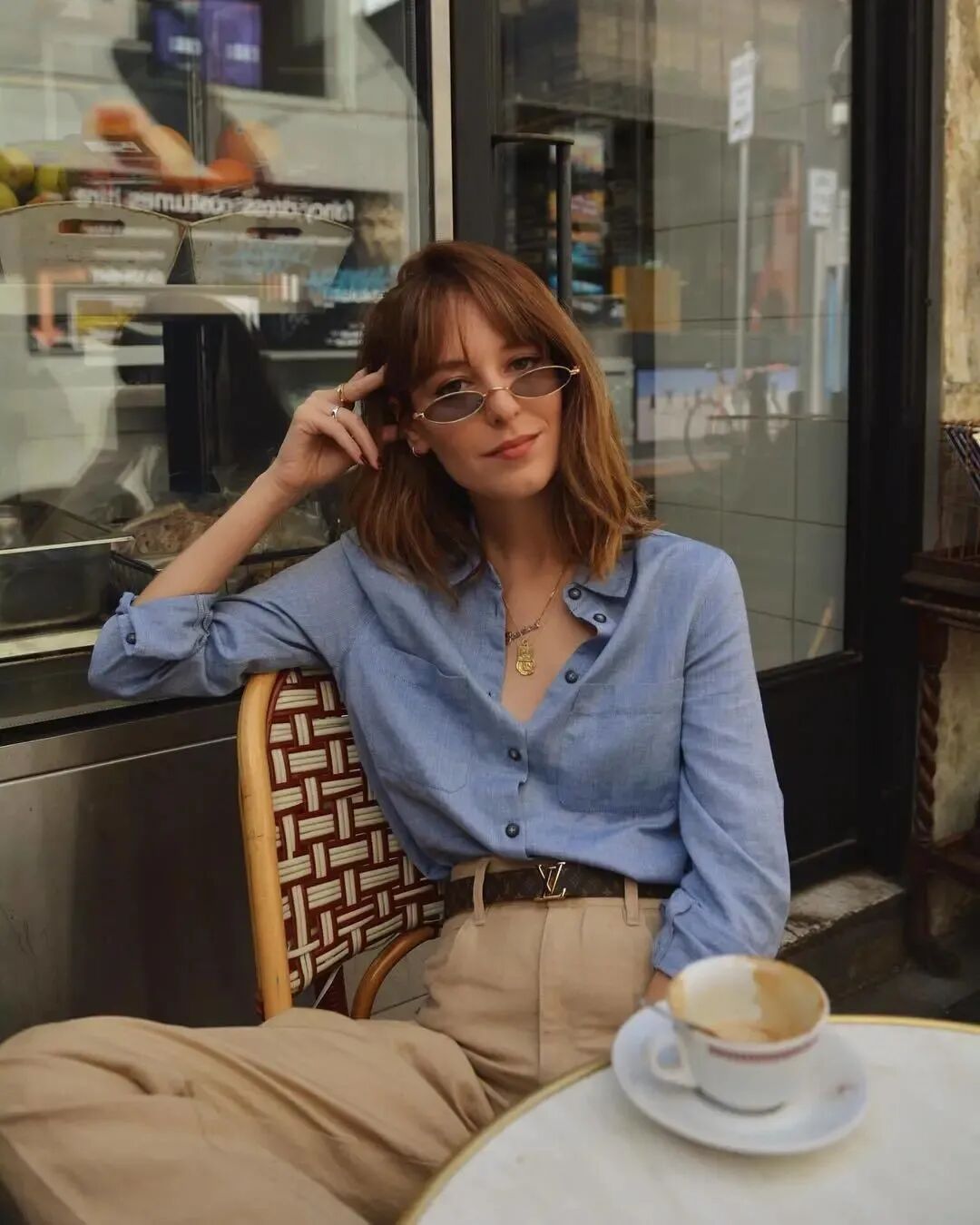 偏爱简洁风的,可以蓝衬衫搭配淡漠色下装,将中性帅气进行到底。穿惯了蓝衬衫配黑裤子的人,可以试试这一新的组合。