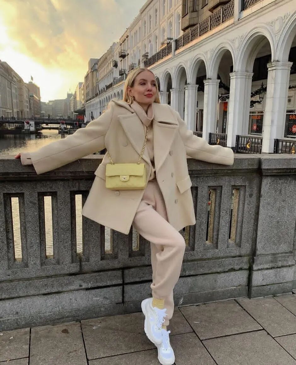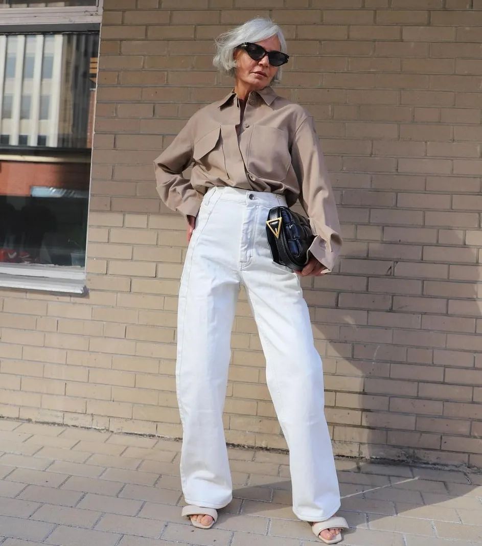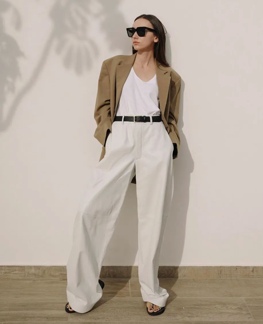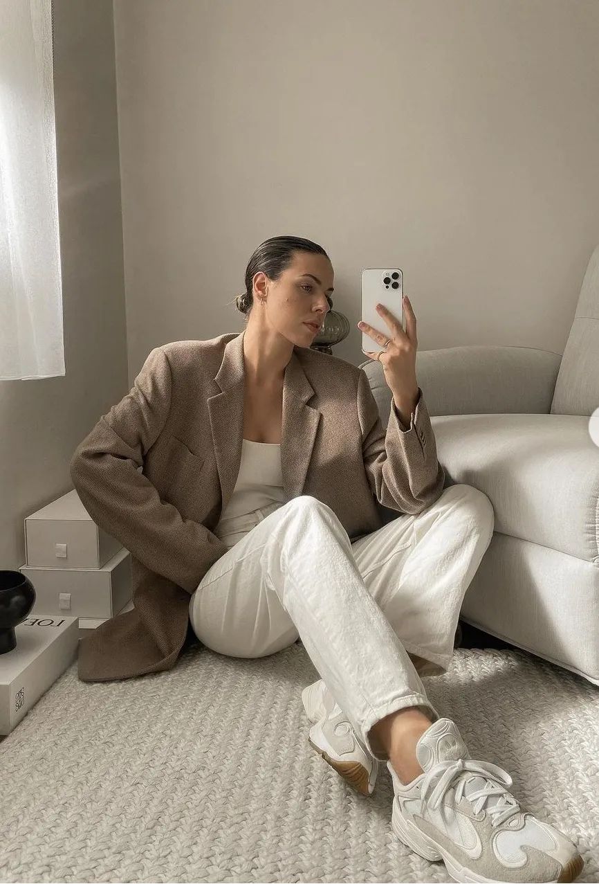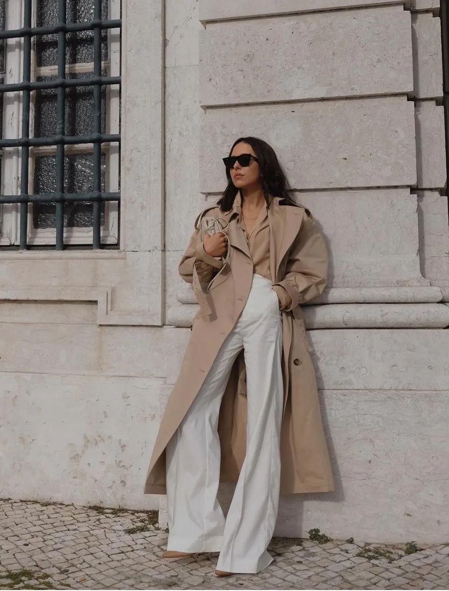 若是一身白色穿搭,在外面套上一件大地色的外套同样自带“优雅”效果。