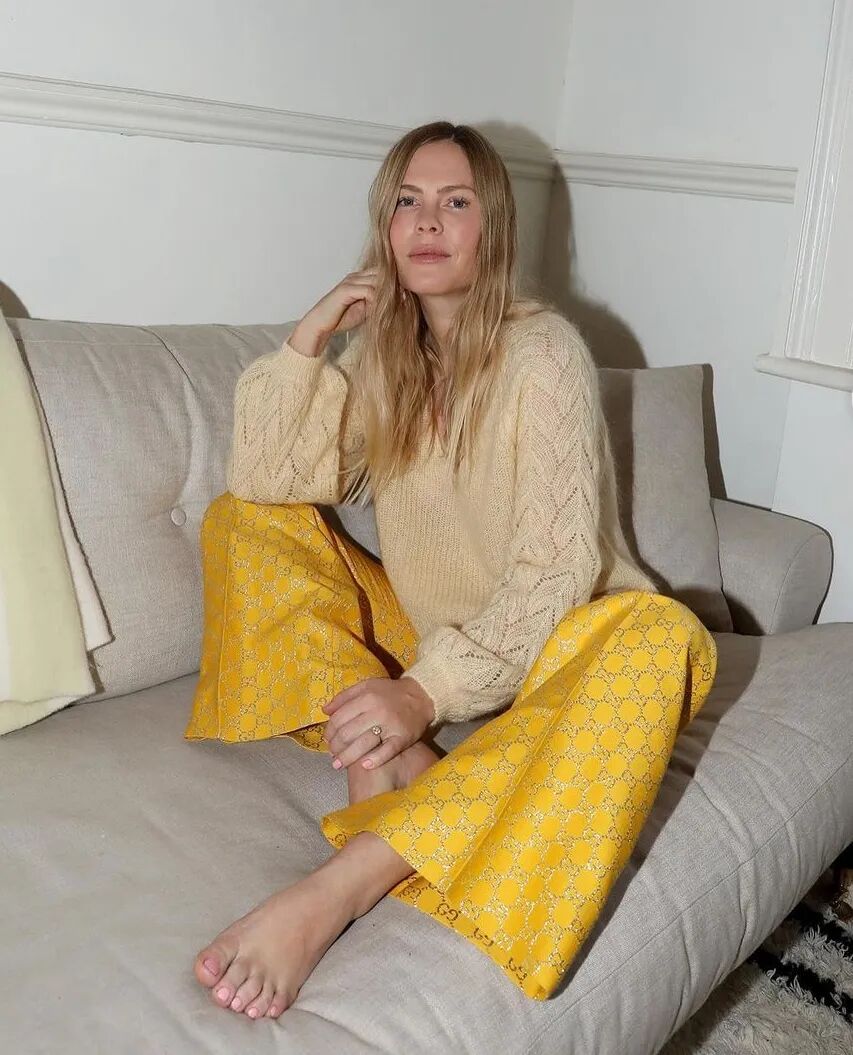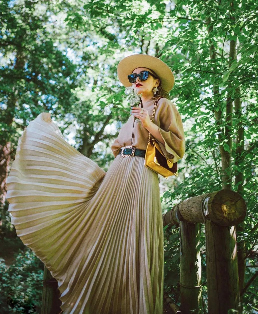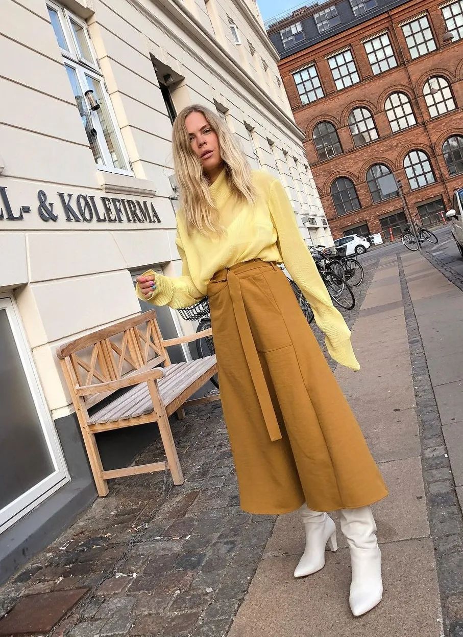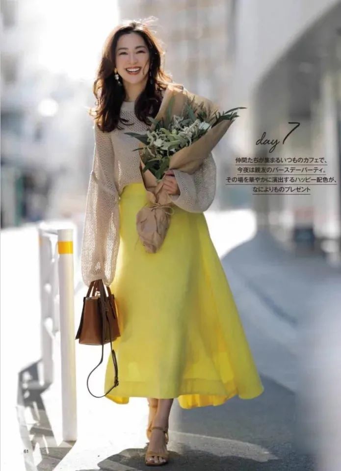 奶油色的上衣+黄色的裙子,舒展淡然,赋予女人宁静不争的气质。