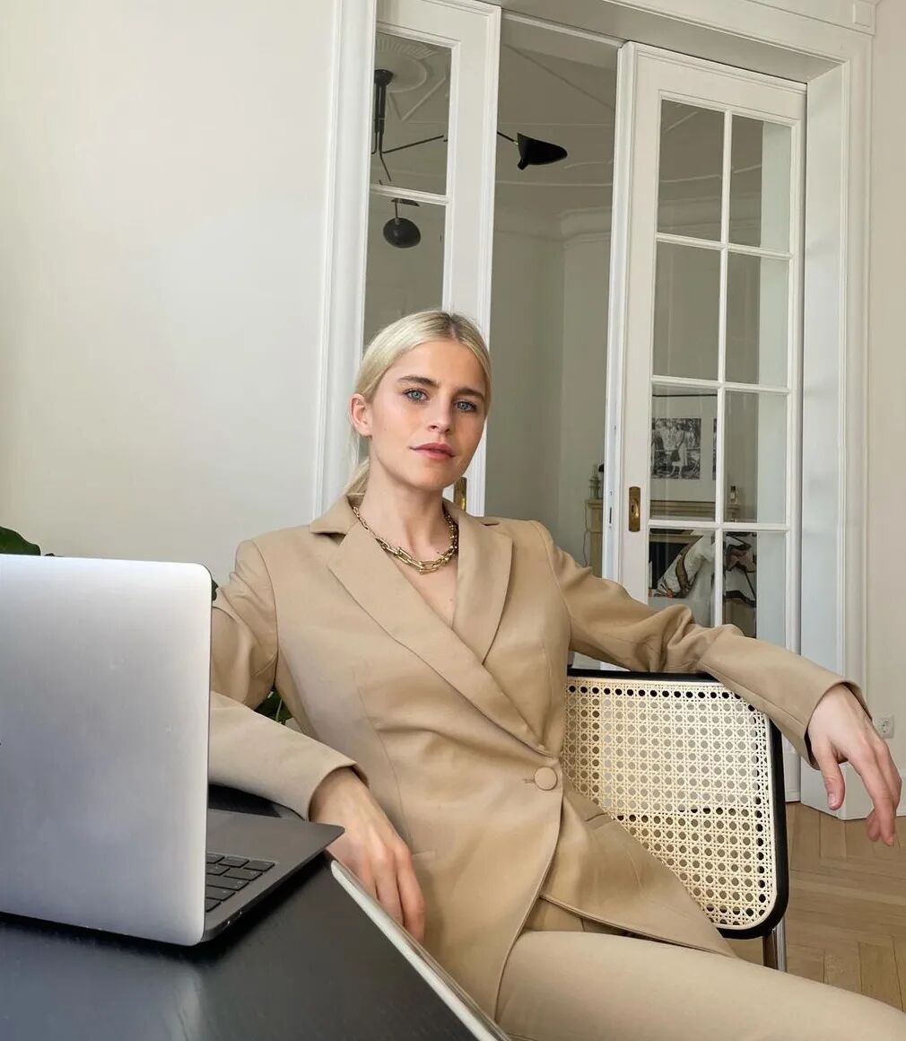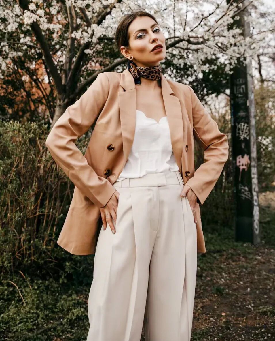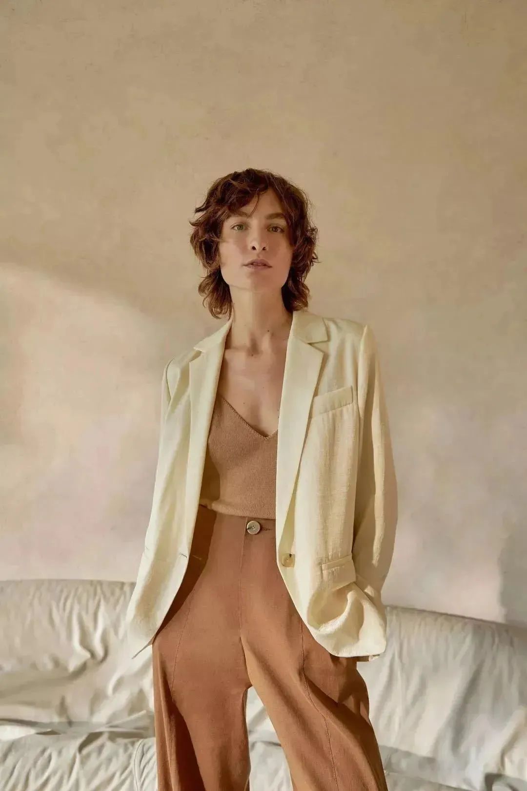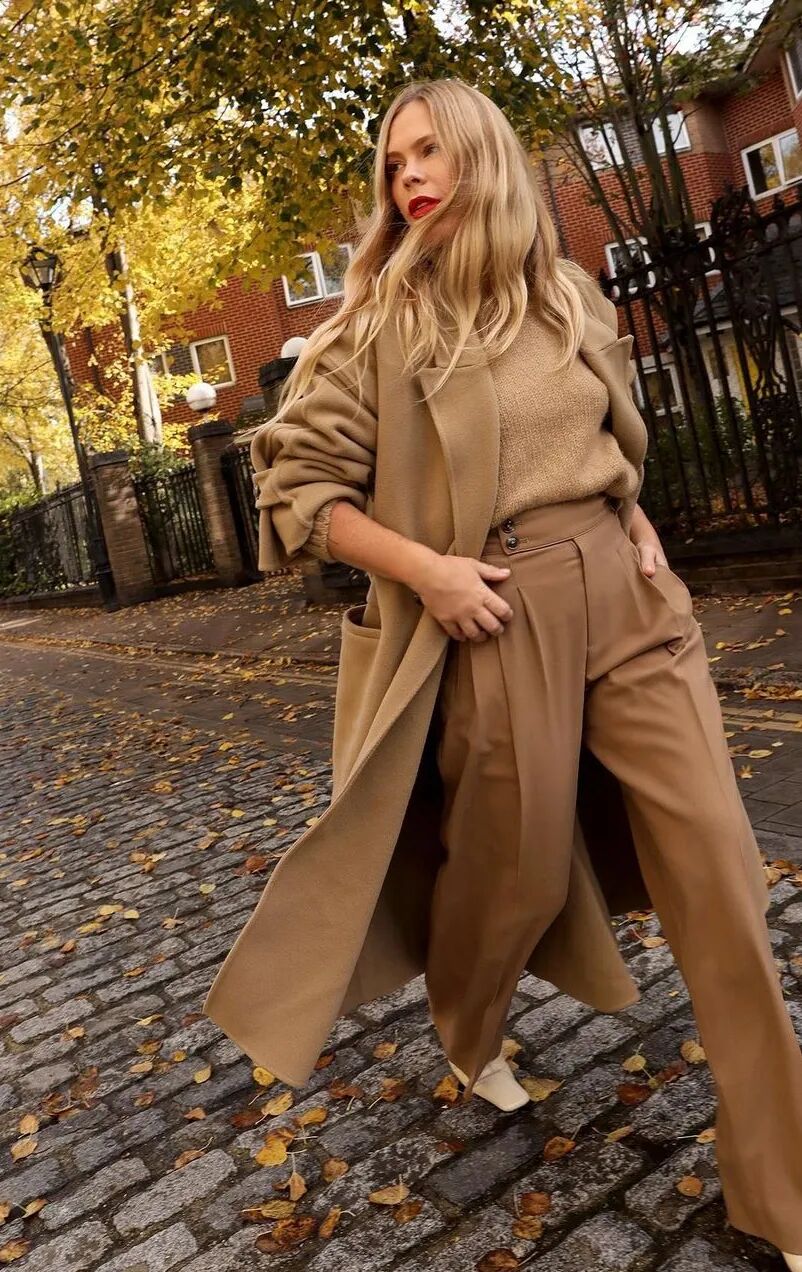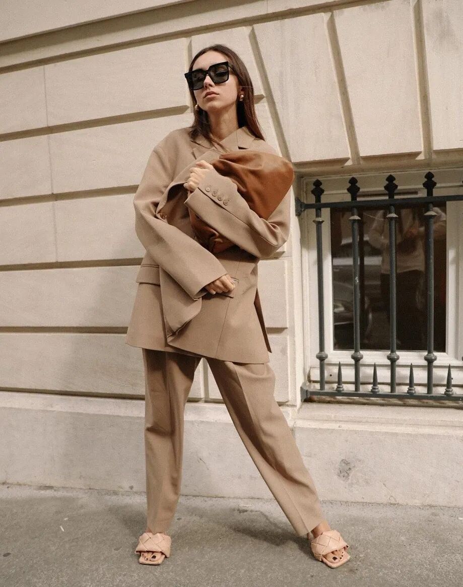 自带高级感的大地色最适合跟同色系搭配起来,是最显贵的。最简单的是一身大地色系套装,利落有型的剪裁绝对是提升个人气场与气质的标配。