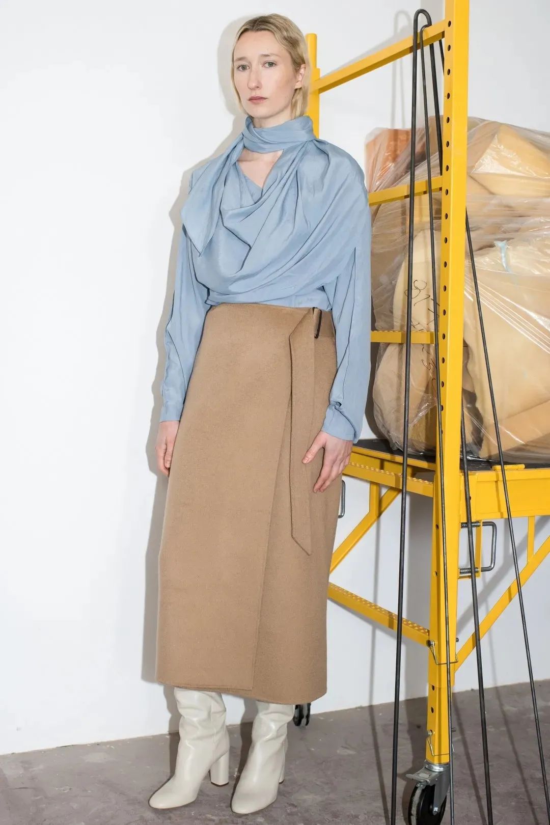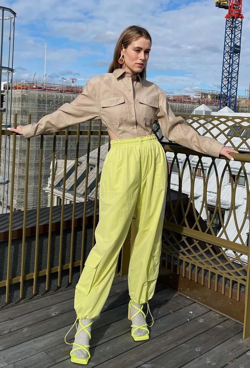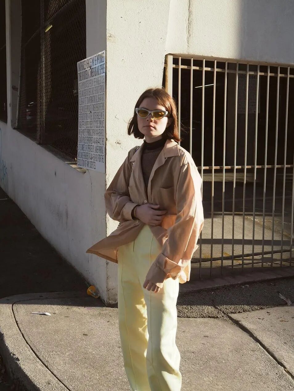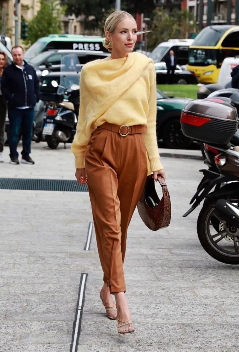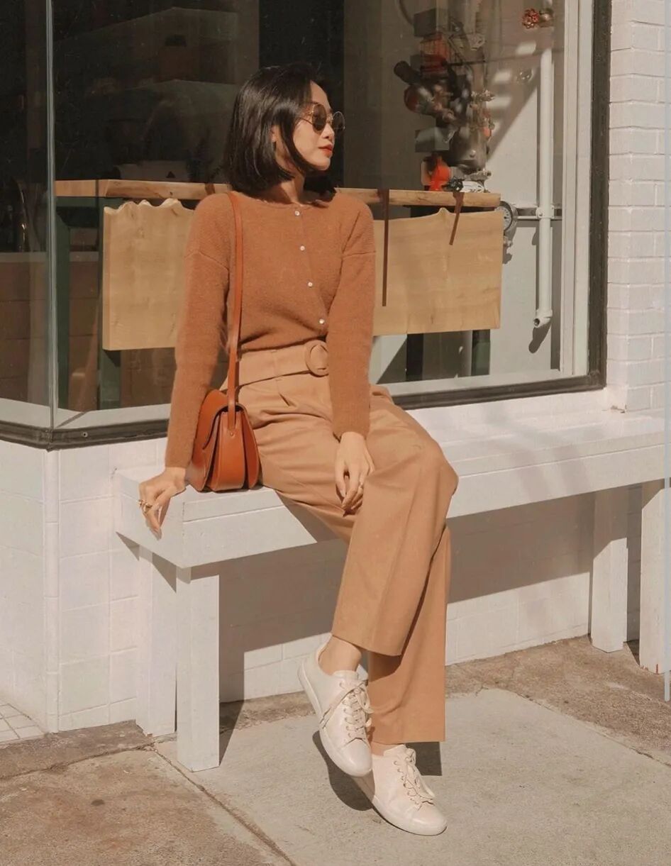 一件淡黄色的上衣配上一件大地色的下装,极简高级不失亲和力。