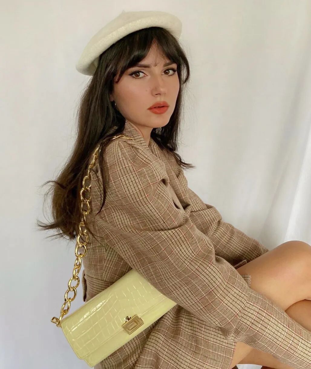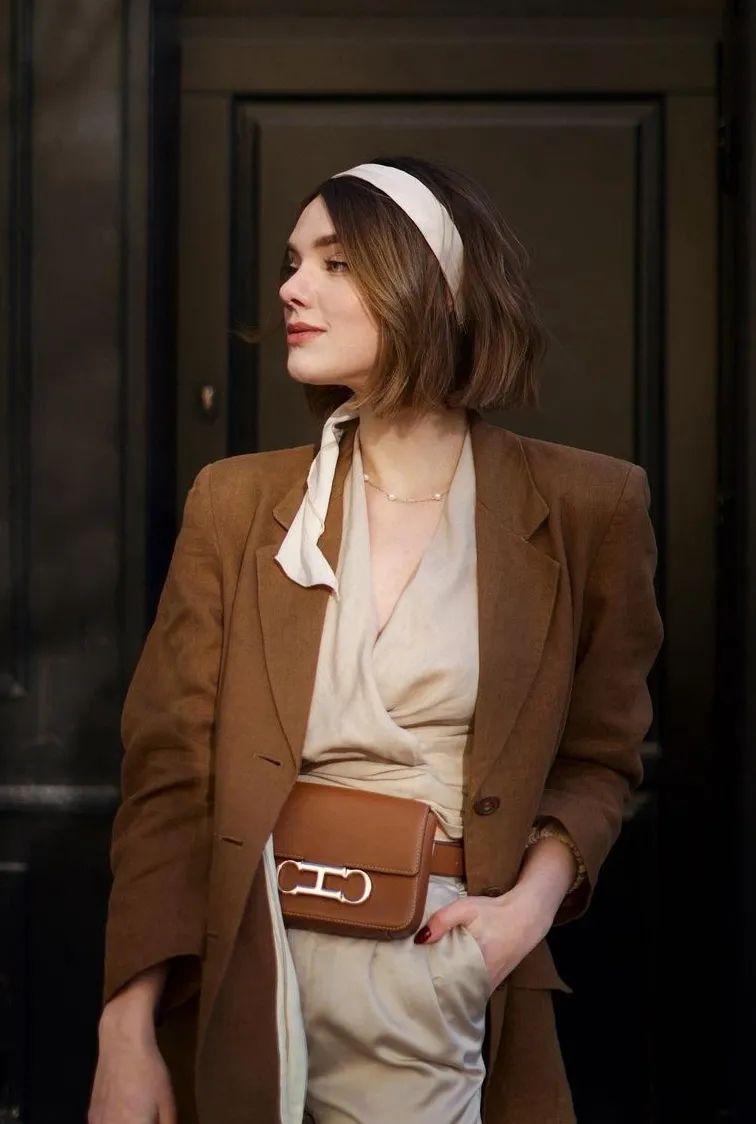 不同深浅的大地色组合,跟皮肤的色号拉开距离,会比较显白。增添层次感的同色也给人的感觉更显贵,也是时下流行的富家小姐穿搭。