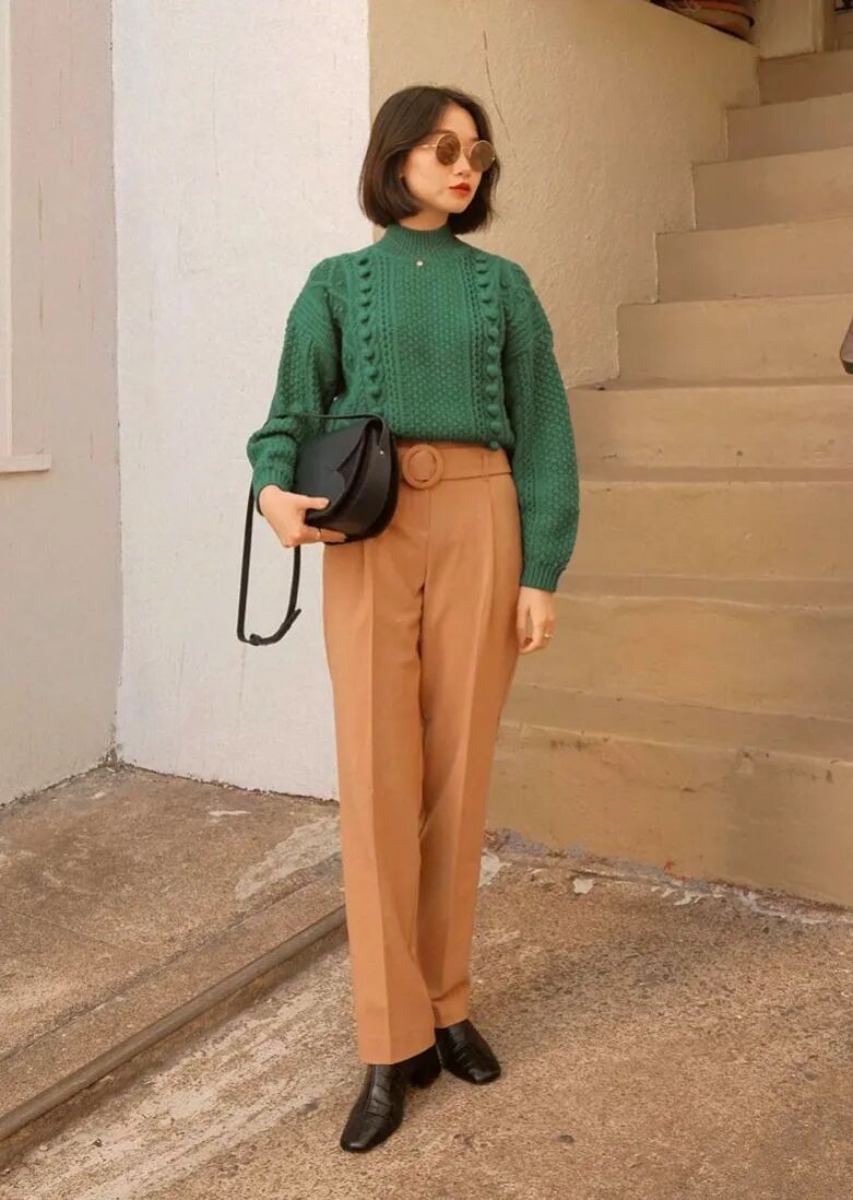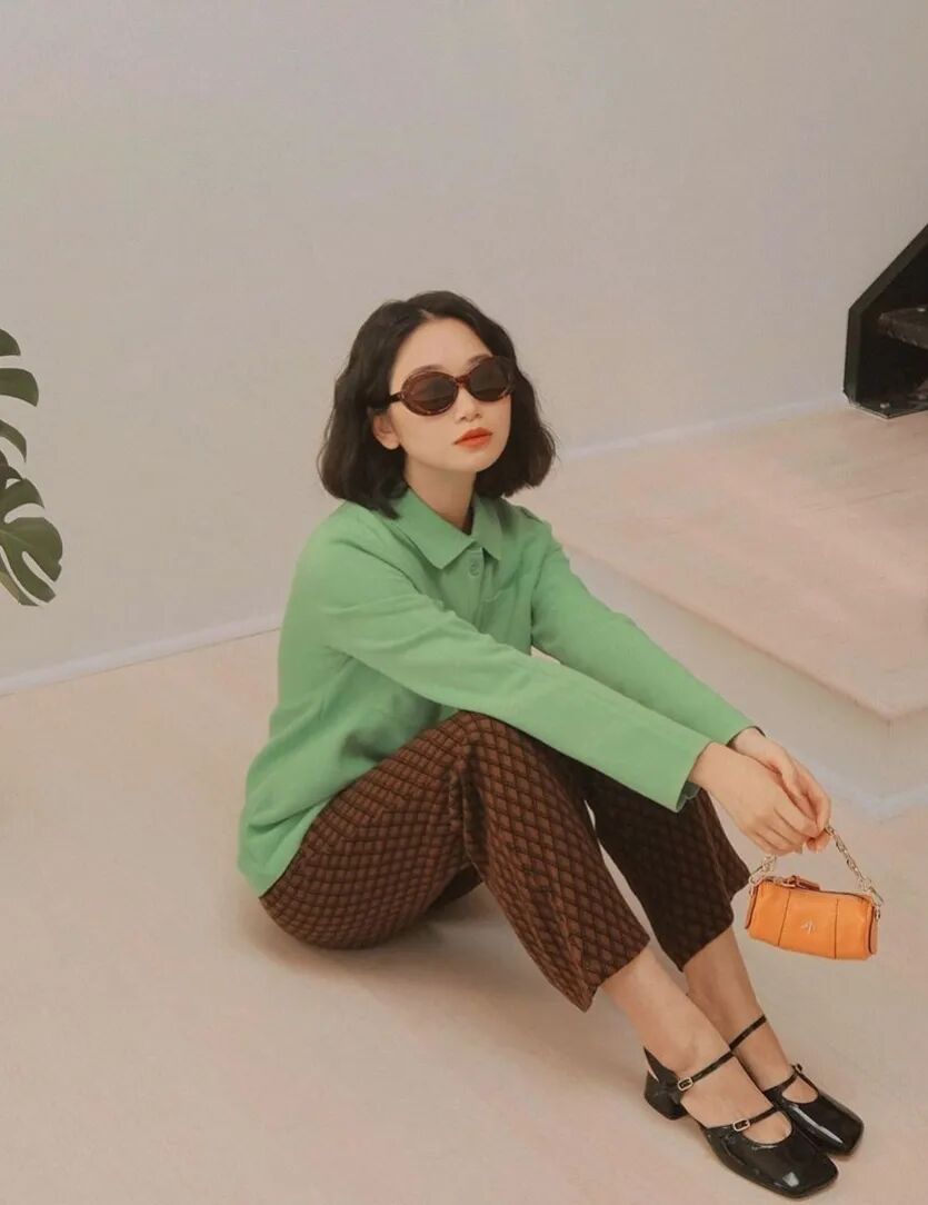 秋冬季节,用绿色上衣+大地色西装裤,清新舒适,让人眼前一亮,却又不是很扎眼,始终是淡淡的、懒懒的,无动于衷又有点脱俗自然。