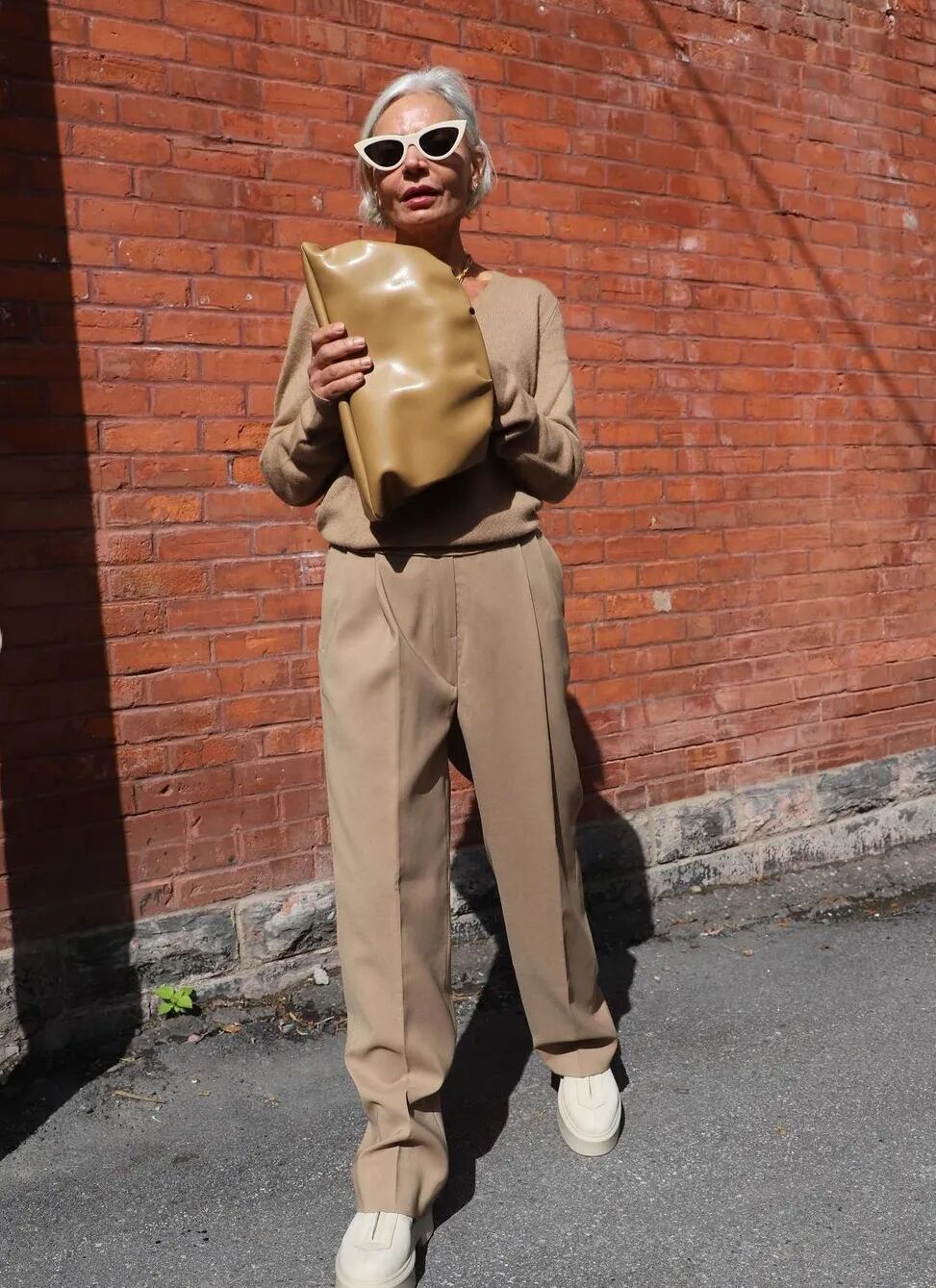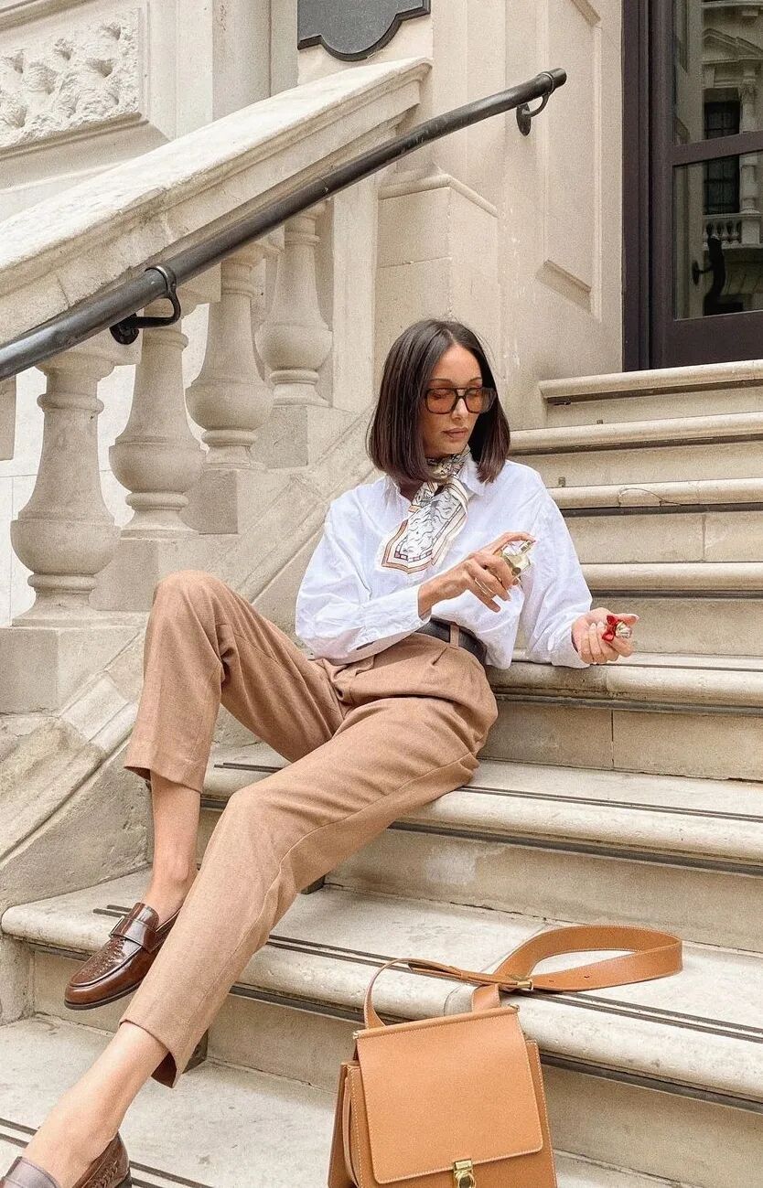 穿好大地色的宗旨就是越简单越好。白色和大地色一定是天生一对,白色明亮,纯净,优雅又高贵,让大地色得到净化,从而营造出高级的视觉感受。