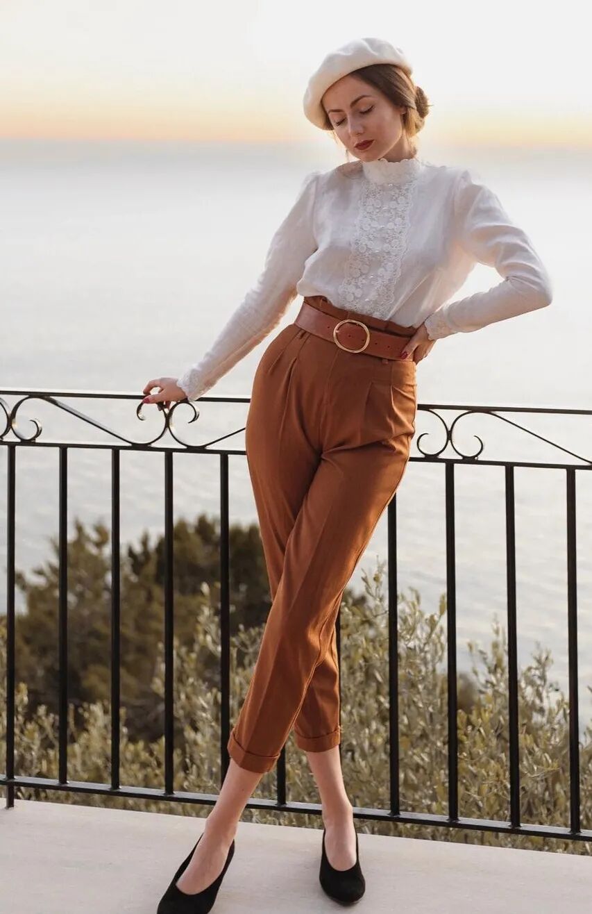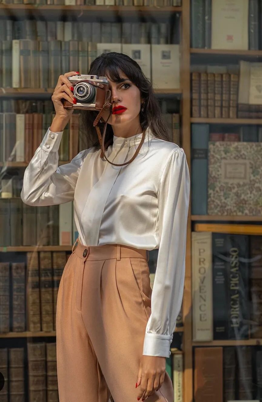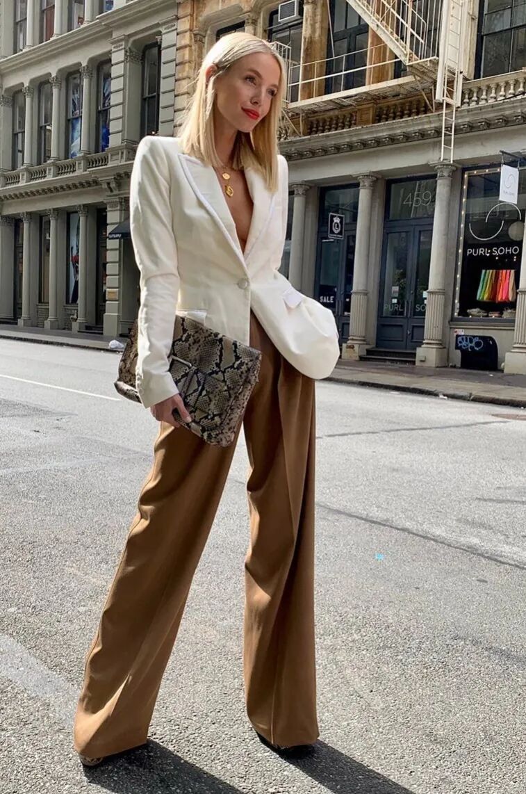 大地色上衣搭配白色阔腿裤、白色半裙,整体搭配很上档次,高雅、知性、迷人,又是一套简单易copy的显贵Style。