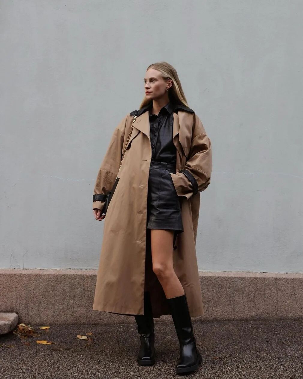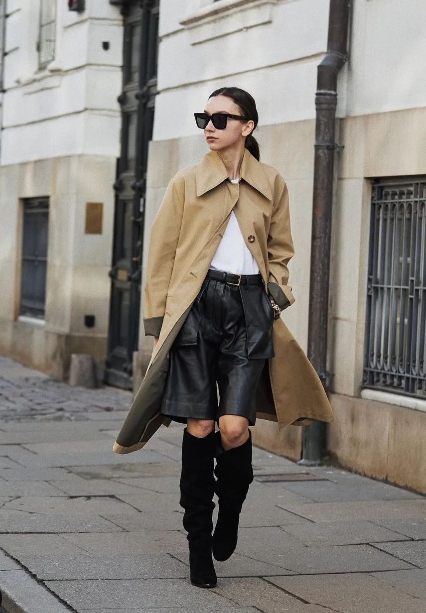 大地色的上衣搭配黑色下装,简约高级不失几分酷感。