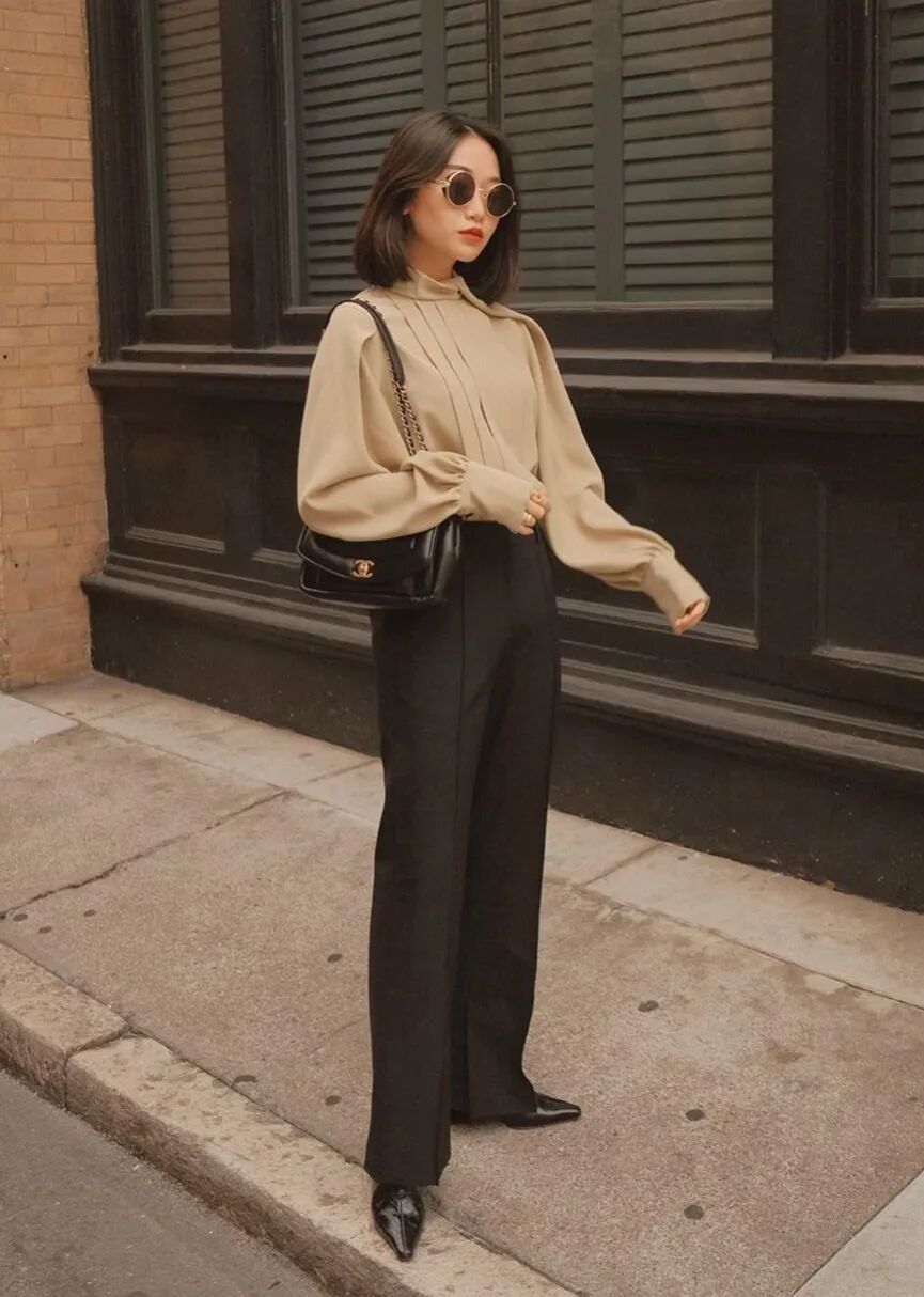 如果担心会把脸色衬托的黯淡,不妨让淡漠色远离脸,白色上装+淡漠色下装,温柔又显白。换成衬衫、半裙、阔腿裤这些单品,更是超级适合上班族。