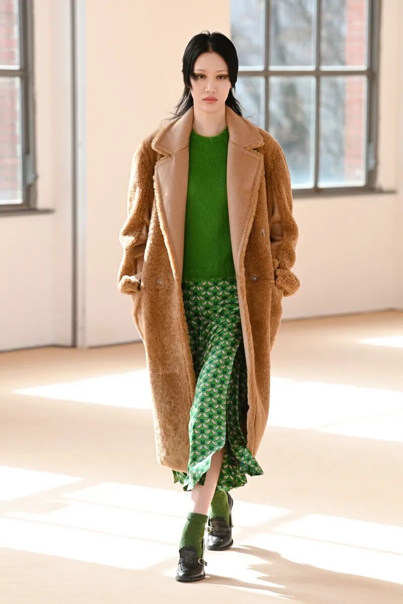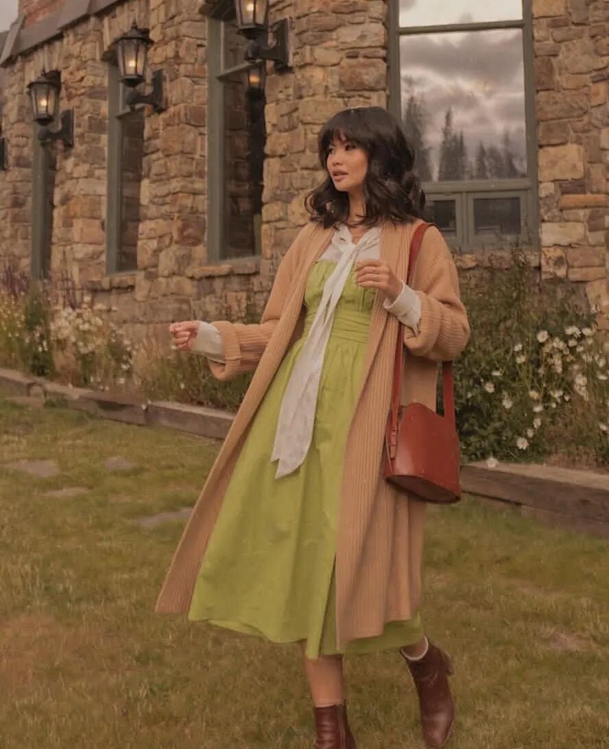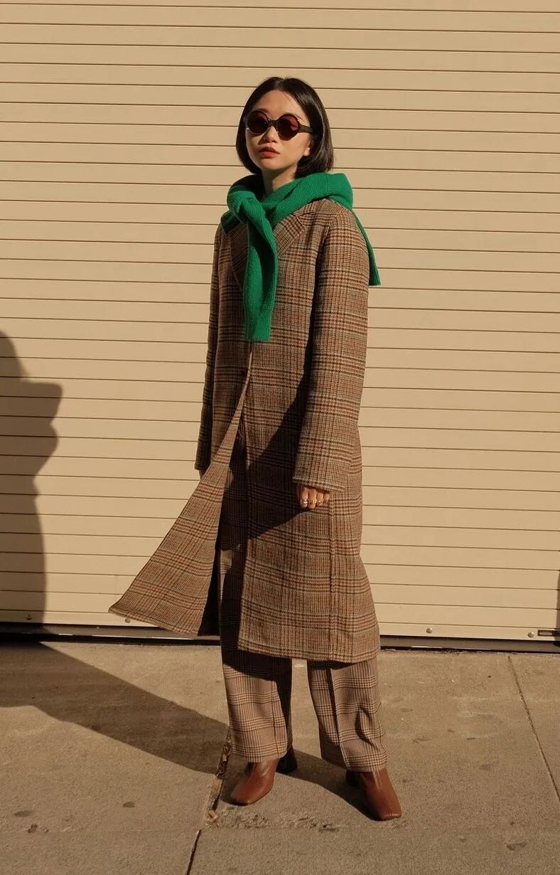 大面积的大地色系look,用小面积的绿色加以点缀,让沉闷的秋冬装扮增添几分清新感。