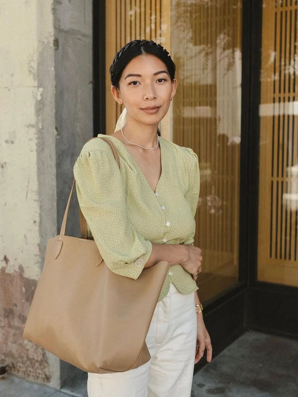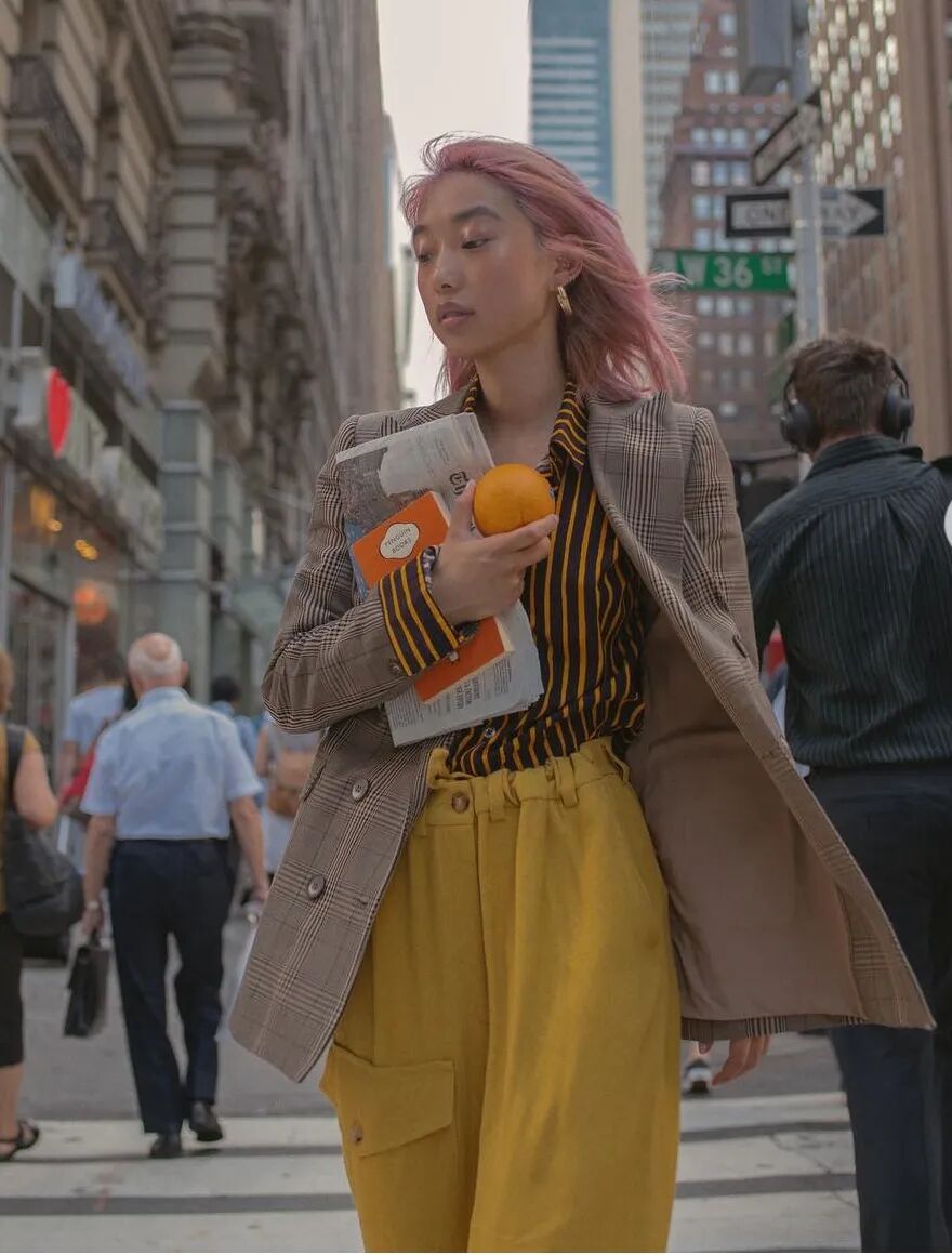 一身淡漠色的穿搭搭配一只黄色的包包点缀。一下拥有优雅内涵、靓丽俏皮。