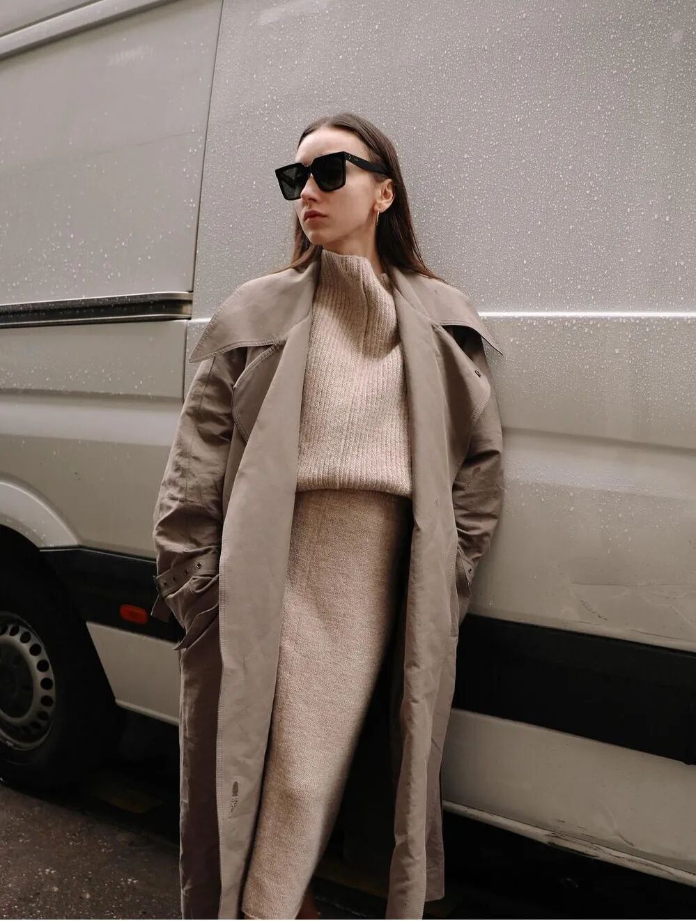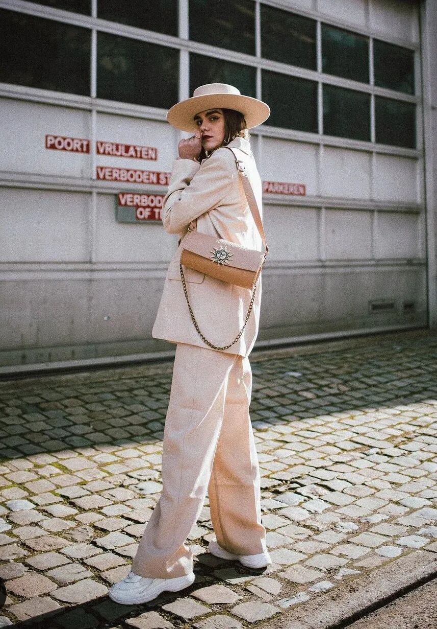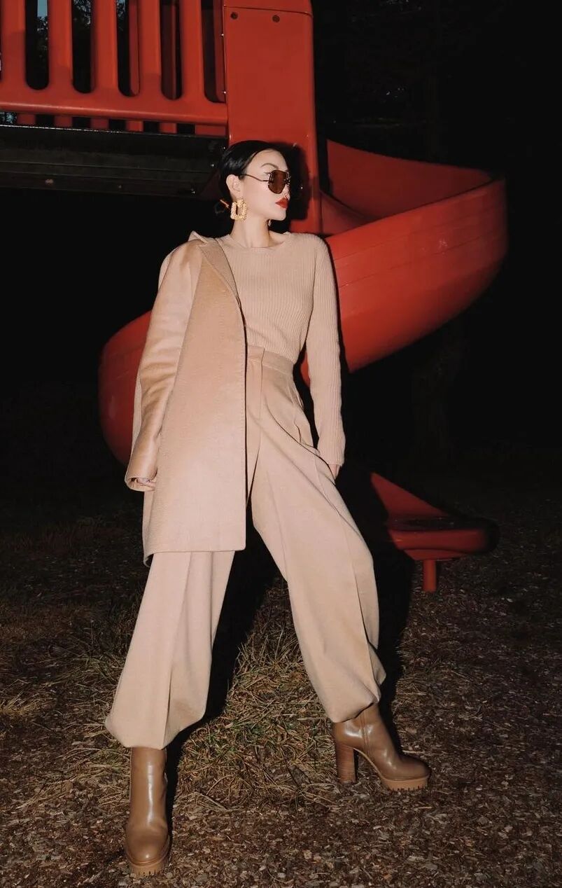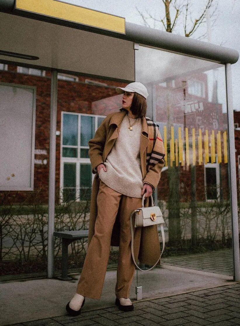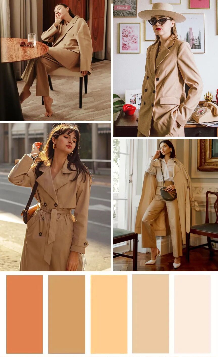 不整套穿时,也可以利用不同深浅的大地色组合,例如,拿驼色作为主色调,然后找同色调里的米色、裸色或焦糖色搭配。