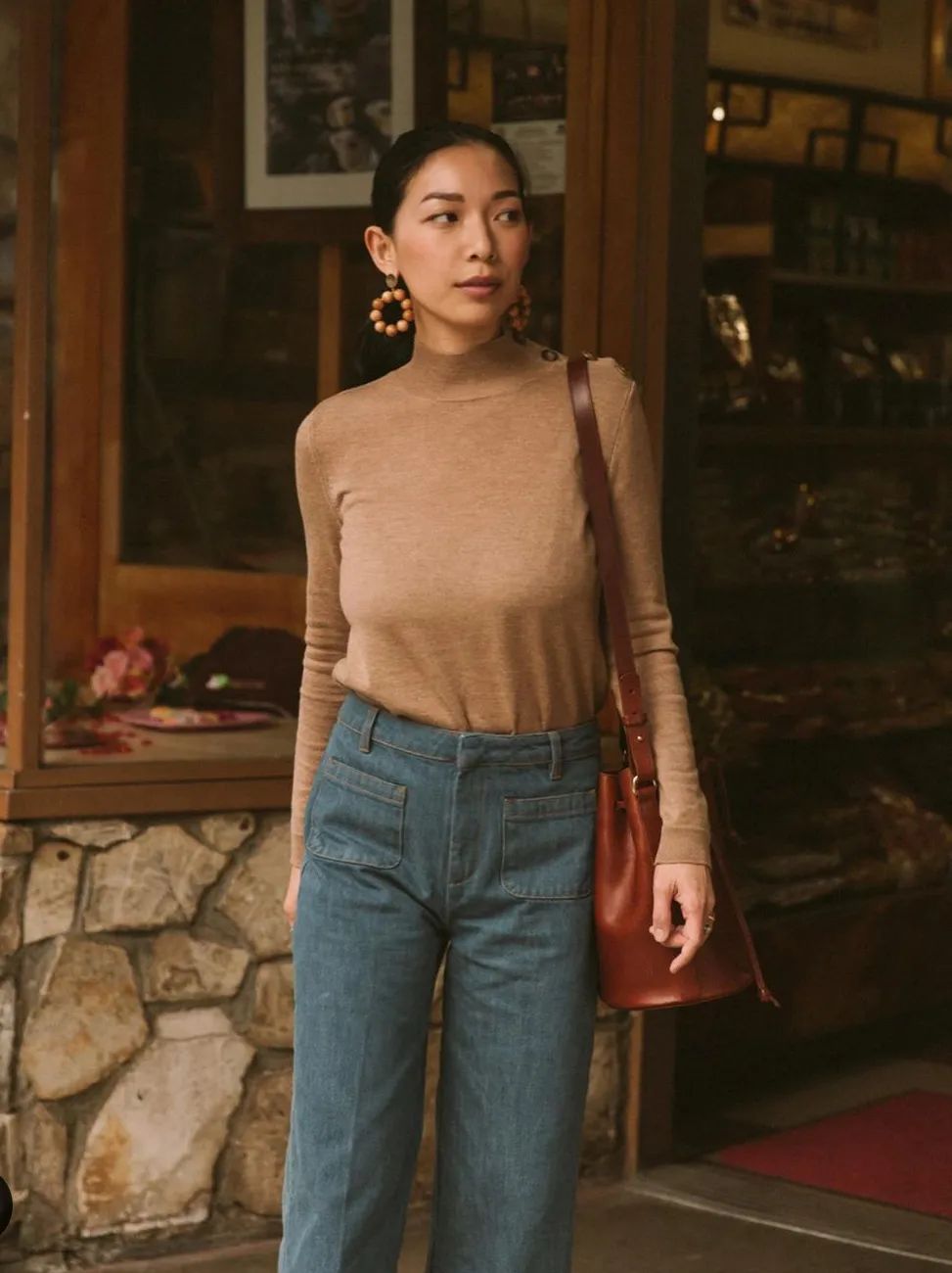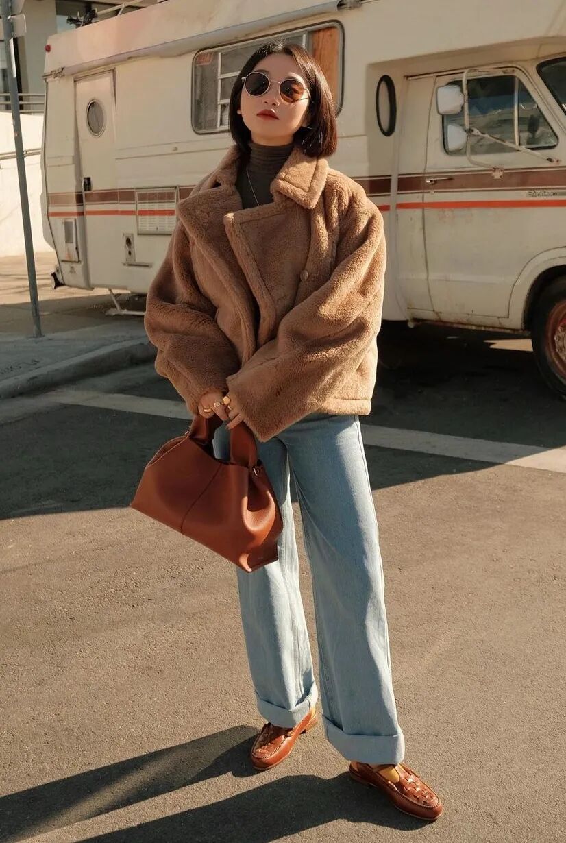 牛仔裤作为绝对的百搭单品,从针织衫到大衣,和大地色系的上衣都能配一脸。