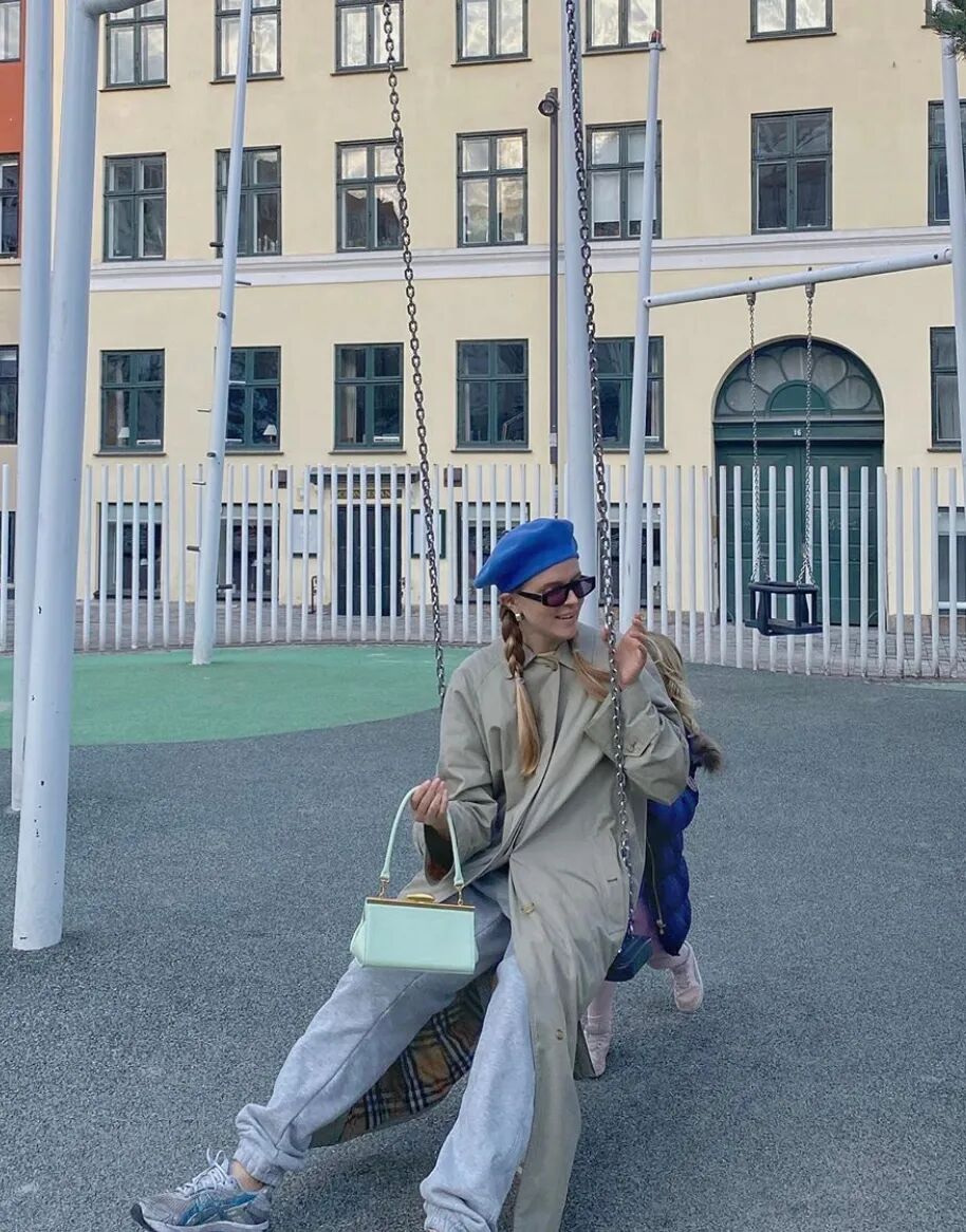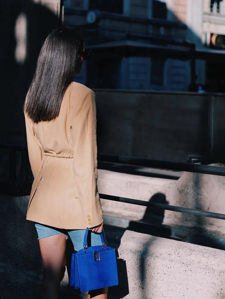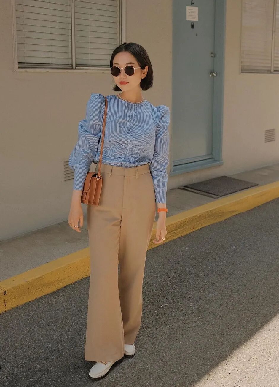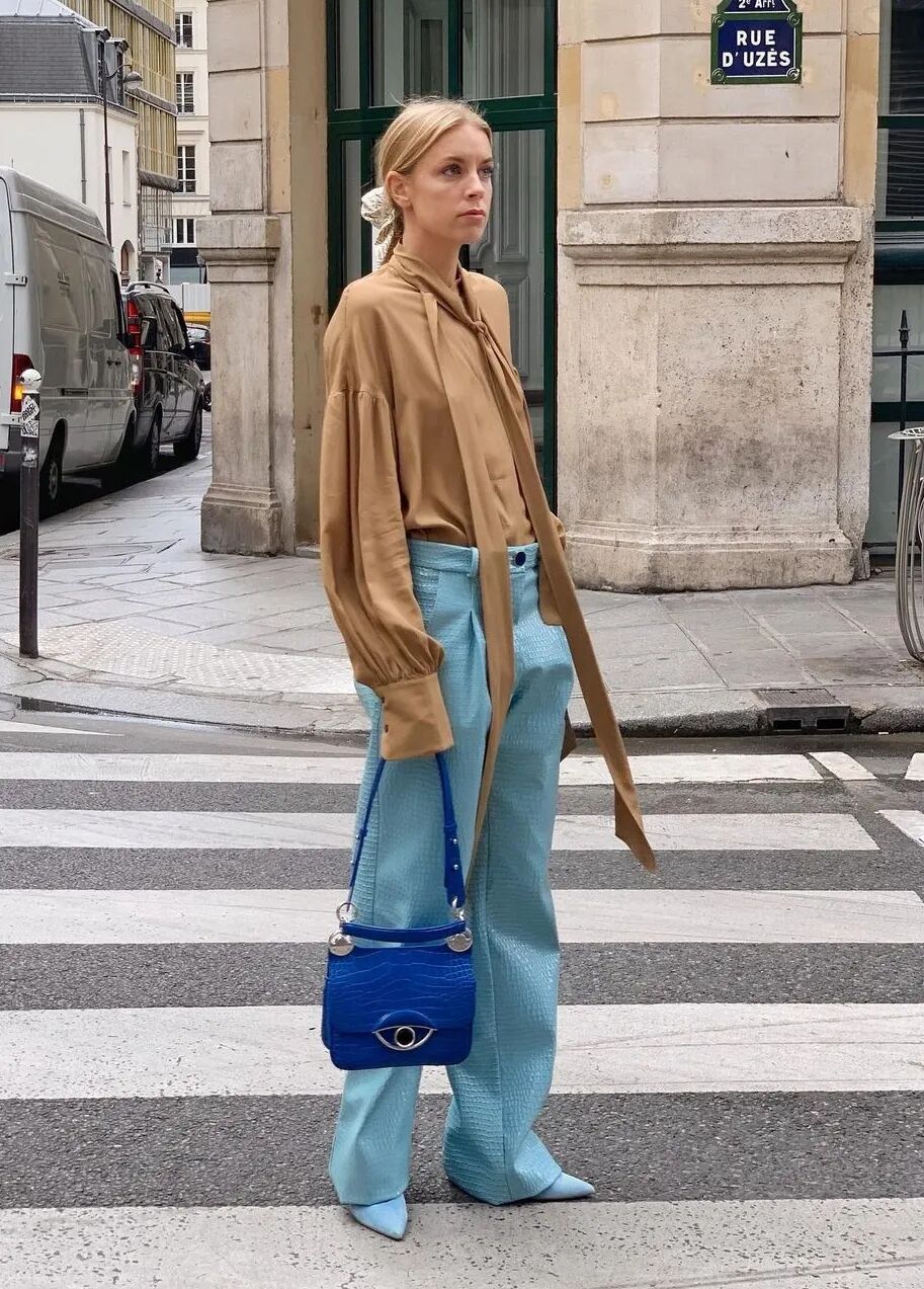 还可以试试在与世无争的大地色中,加入清爽的蓝色调。蓝色的清爽干净能让大地色充满清新干净的视觉氛围。风格介于通勤和休闲之间,却很时髦。