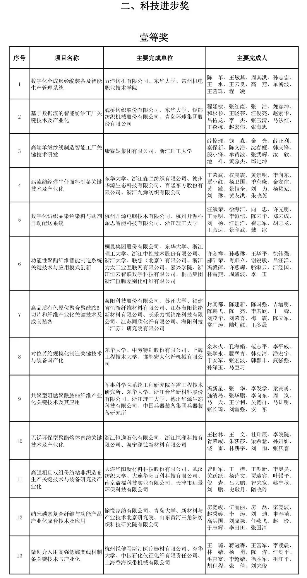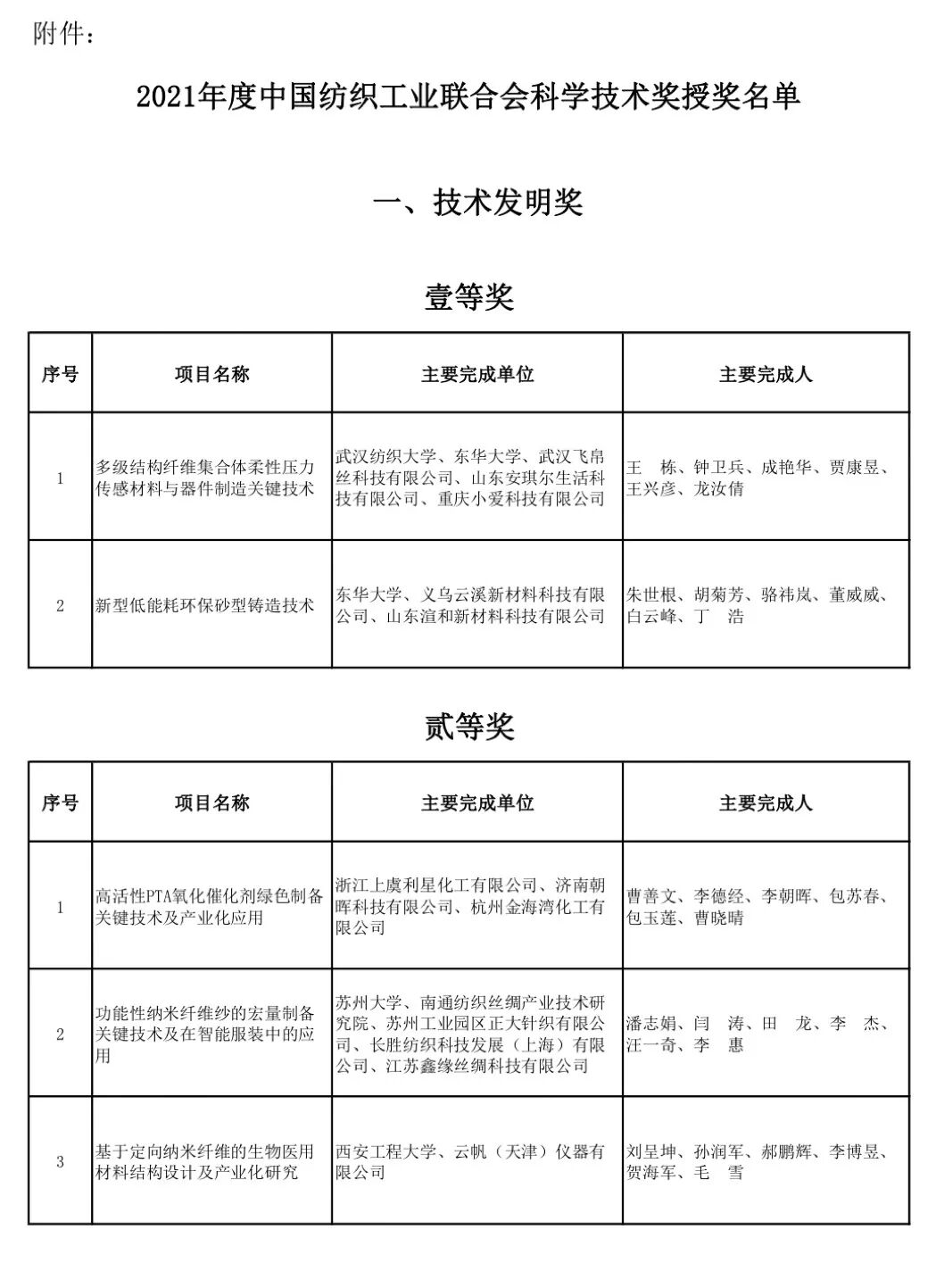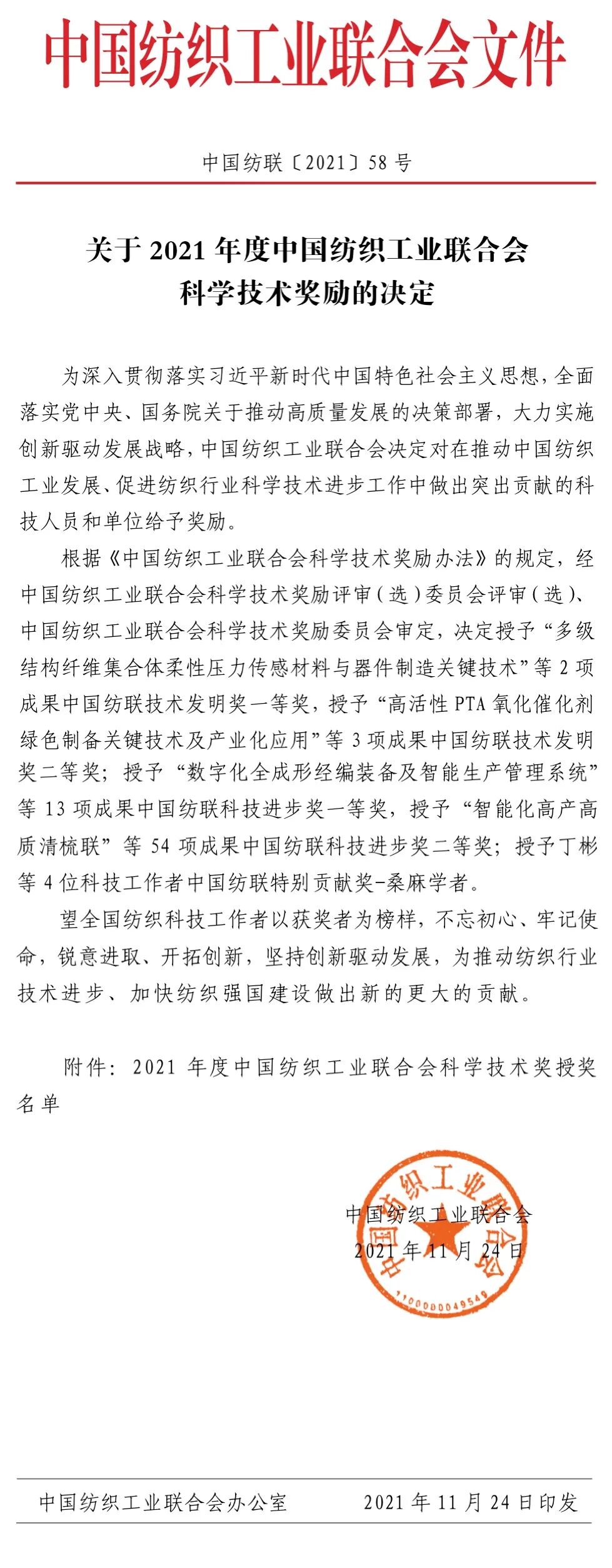 日前,中国纺织工业联合会发布《关于 2021 年度中国纺织工业联合会科学技术奖励的决定》。根据《中国纺织工业联合会科学技术奖励办法》的规定,经中国纺织工业联合会科学技术奖励评审(选)委员会评审(选)、中国纺织工业联合会科学技术奖励委员会审定,决定授予“多级结构纤维集合体柔性压力传感材料与器件制造关键技术”等 2 项成果中国纺联技术发明奖一等奖,授予“高活性 PTA 氧化催化剂绿色制备关键技术及产业化应用”等 3 项成果中国纺联技术发明奖二等奖;授予“数字化全成形经编装备及智能生产管理系统” 等 13 项成果中国纺联科技进步奖一等奖,授予“智能化高产高质清梳联”等 54 项成果中国纺联科技进步奖二等奖;授予丁彬等 4 位科技工作者中国纺联特别贡献奖-桑麻学者。