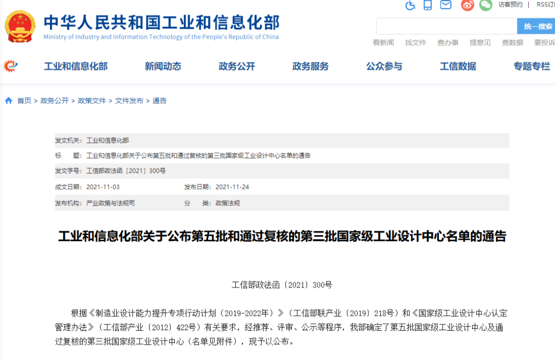 11月24日,根据《工业和信息化部关于公布第五批和通过复核的第三批国家级工业设计中心名单的通告》(工信厅政法函〔2021〕300号),工信部公布了第五批国家级工业设计中心及通过复核的第三批国家级工业设计中心。