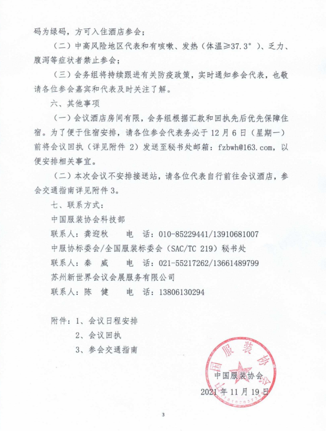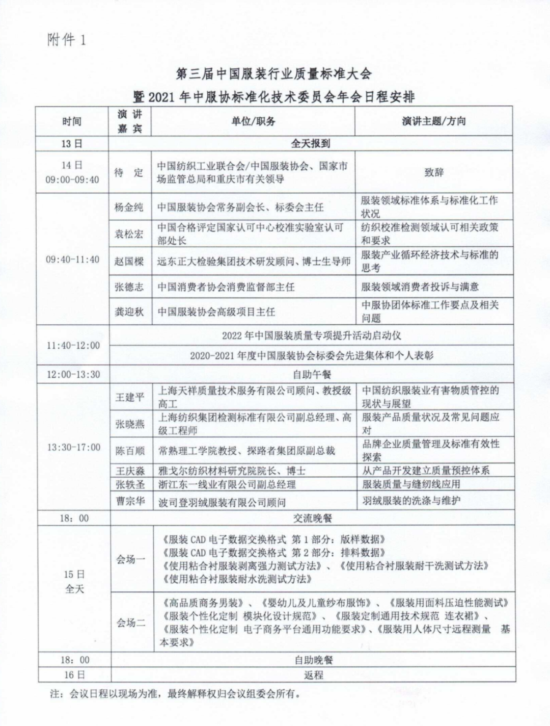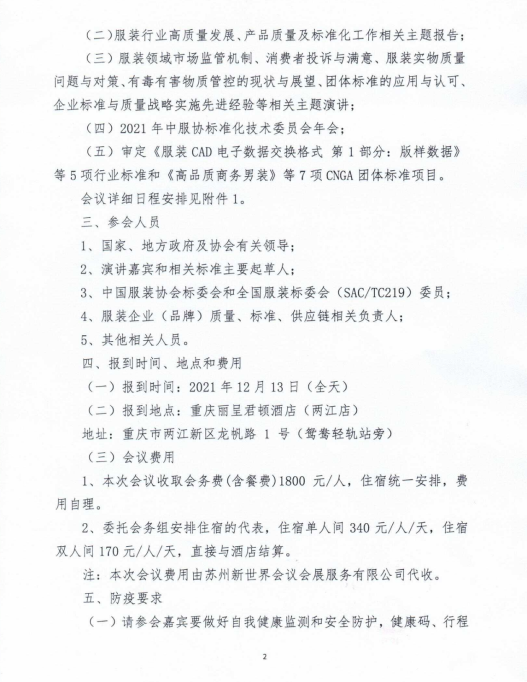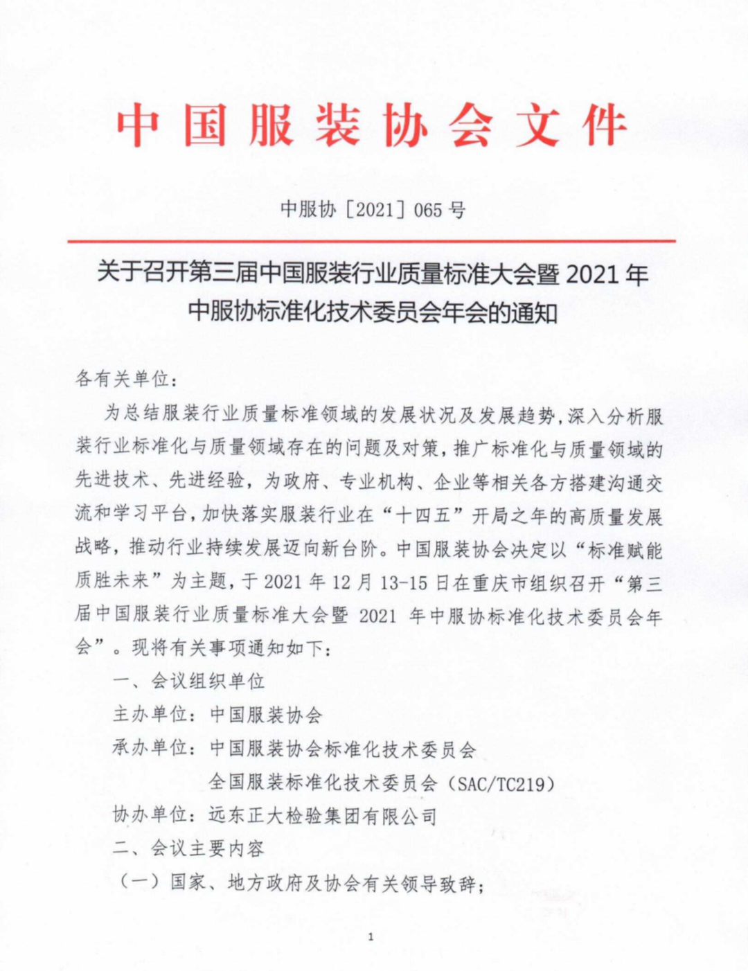 为总结服装行业质量标准领域的发展状况及发展趋势,深入分析服装行业标准化与质量领域存在的问题及对策,推广标准化与质量领域的先进技术、先进经验,为政府、专业机构、企业等相关各方搭建沟通交流和学习平台,加快落实服装行业在“十四五”开局之年的高质量发展战略,推动行业持续发展迈向新台阶。中国服装协会决定以“标准赋能 质胜未来”为主题,于2021年12月13-15日在重庆市组织召开“第三届中国服装行业质量标准大会暨2021年中服协标准化技术委员会年会”。现将有关事项通知如下: