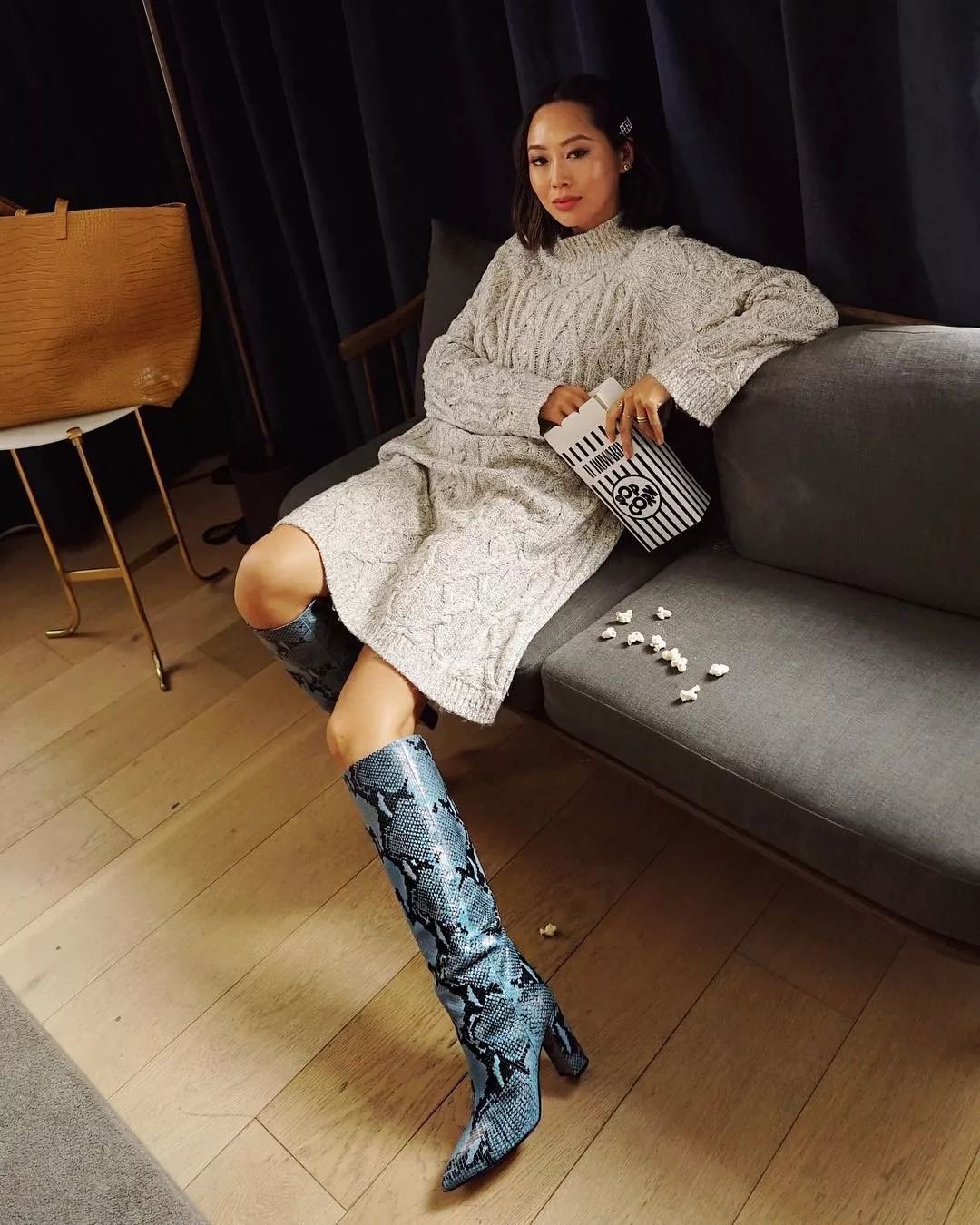 “下衣失踪”和长靴总是无比契合,稍微露肤,既能拉出好比例,又不失温暖。