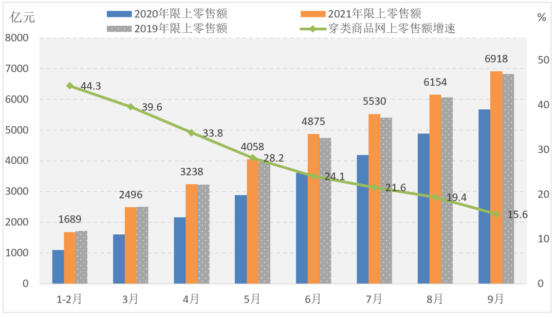 网络零售增势略好于实体,对服装内销市场的拉动作用持续显现。根据国家统计局数据,2021年1-9月,穿类商品网上零售额同比增长15.6%,增速比上年同期提高12.3个百分点,比1-6月回落8.5个百分点,两年平均增长9.3%。