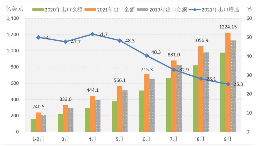 在国际市场需求回暖和海外订单回流等因素的拉动下,凭借强韧的产业链优势,我国服装出口保持大幅增长,但出口增速逐月放缓,9月单月增幅为9.9%,除了上年同期基数抬高的因素,也显示了市场需求增长速度正在逐步回归常态化。根据中国海关数据,2021年1-9月,我国累计完成服装及衣着附件出口1224.15亿美元,同比增长25.3%,两年平均增长6.0%。从服装出口品类来看,针织服装及衣着附件出口增长强劲,出口金额为612.23亿美元,同比增长40.57%,两年平均增长7.0%;机织服装及衣着附件出口增势较弱,金额为501.99亿美元,同比增长8.47%,两年平均微增0.28%。