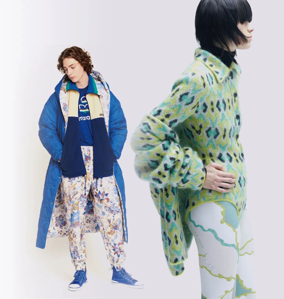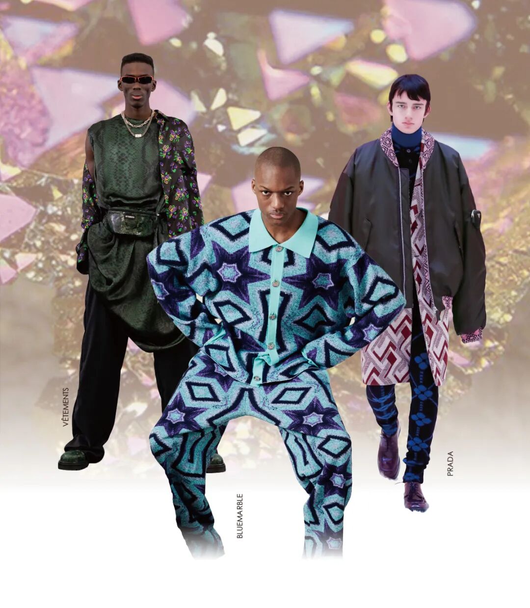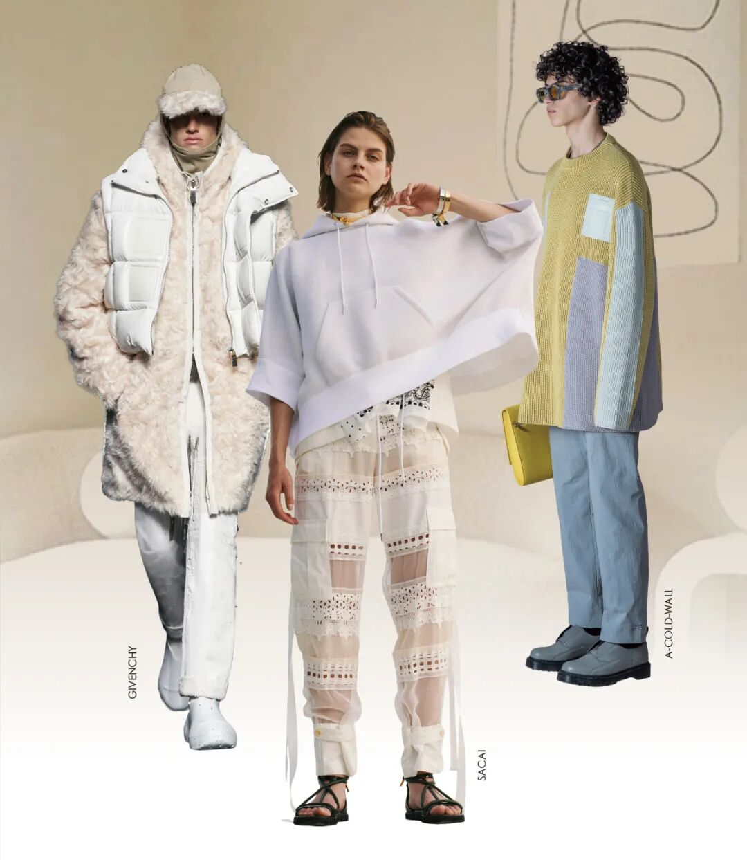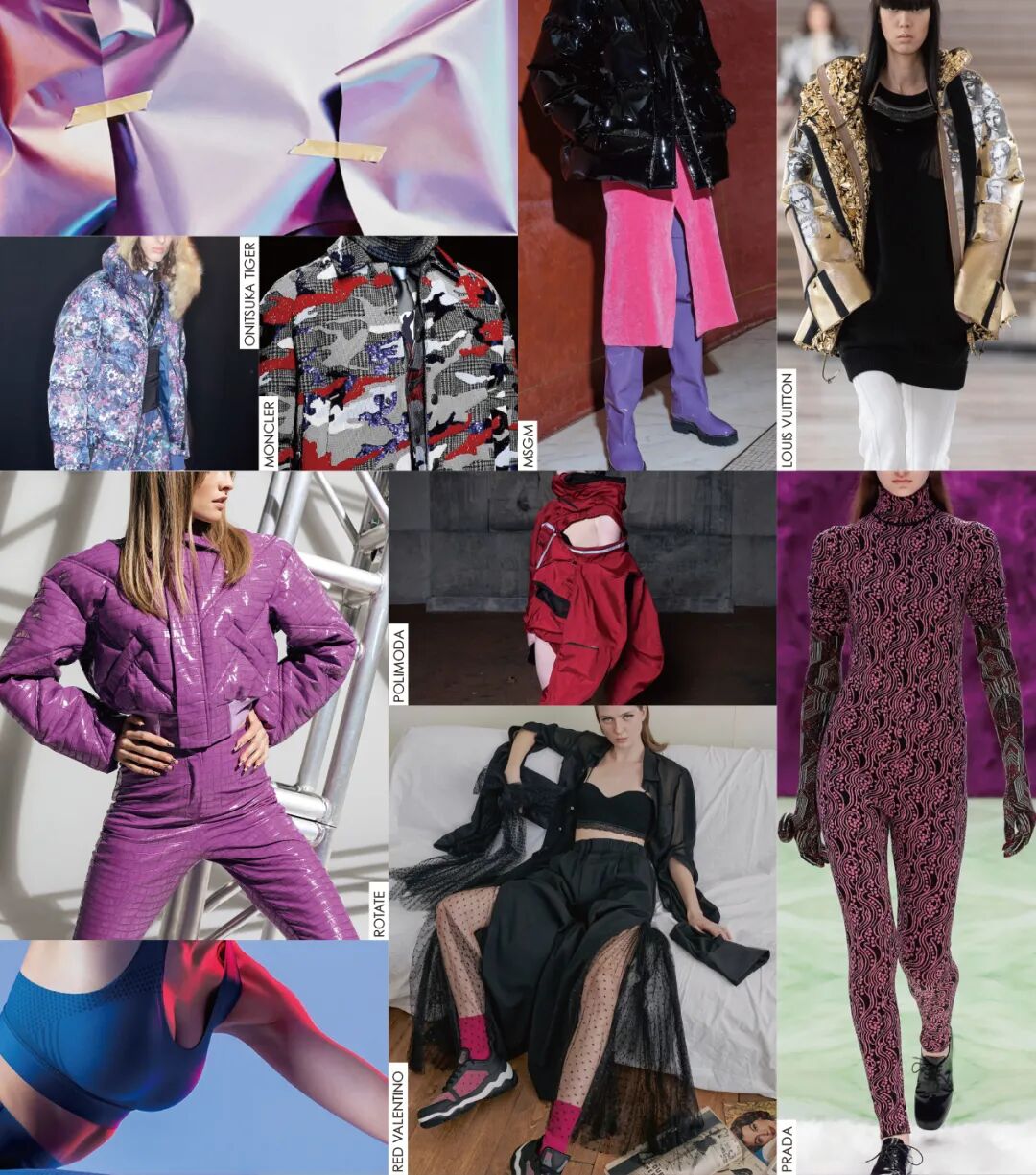 丰富多元的奢华风格传达着后疫情时代的美好愿景,带有复古魅力的装饰主义风貌,打造前卫的运动风格,时髦与舒适性并存是本季亮点。顺滑垂坠的光感面料,大面积的光泽效果极其吸睛,或带有虹彩般反光的效果,或以液态流动感呈现金属外观。提花针织同样值得一提,在抽象艺术品给予的纹样灵感的启发下,打造无性别限制品类。浓郁奇幻紫、数字玫红色、赤红色,色彩在创造力的主导下自由实验,上演奇光异彩与奢华体验的美妙碰撞。