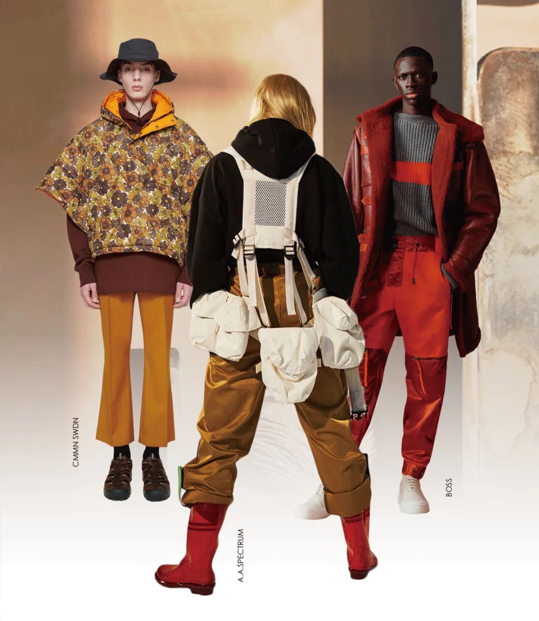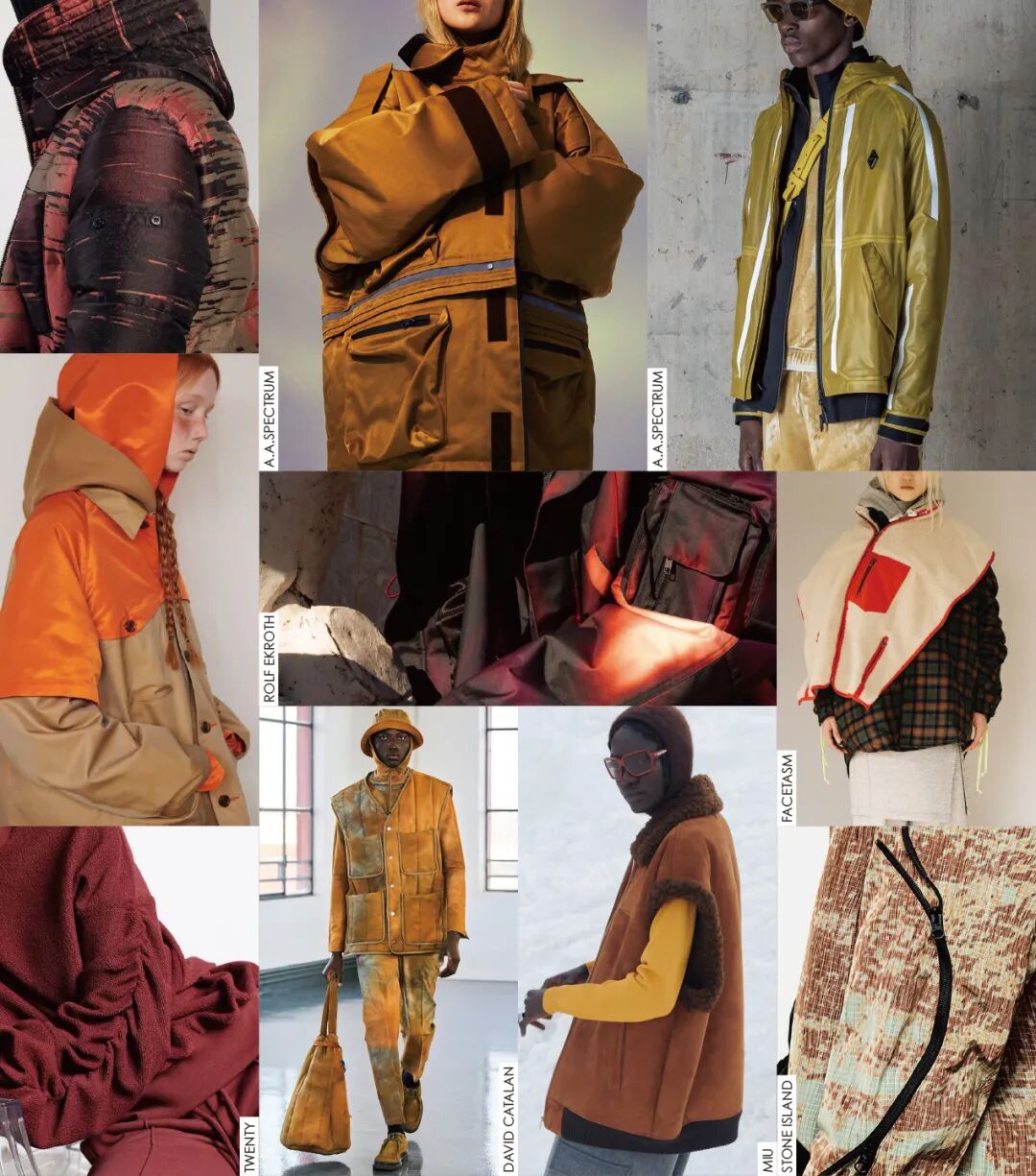 运动风格时装化趋向愈发明显:本主题采用富有年代感的图像灵感启发当代设计,建立极具内涵的都市画像。怀旧色系以大地色作为基调,以深色涂料及古董饰面为灵感,营造出醇厚浓郁的秋冬都市氛围,特别适用于外套类产品的呈现。同色系晕染外观可以很好得表现厚重的岁月感,如David Catalan以温暖的小茴香色过渡到椒褐色,绒感面料的使用更添穿着舒适性。可尝试使用光泽感功能性面料,平纹或斜纹、提花或印花,以凸显其时装化特质。
