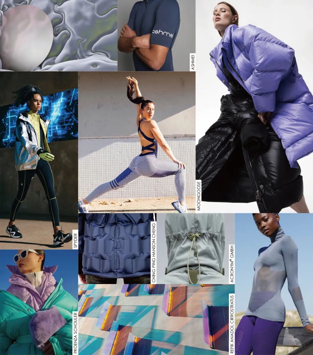 科技的发展实现与人类新的交流融合,太空科幻元素的兴起代表了对未知领域的痴迷与向往。未来的、数字化的、梦幻的,技术的加持让我们可以更丰富的方向诠释机能感设计。采用涤纶/人造丝/氨纶混纺而成的3D立体针织面料强调吸湿速干功能,虹彩反光效果的面料通过加入金属纱线或使用反光涂层,以高能见度提升安全性能。冷调矿石质感的群青色与葱绿及灰蓝色搭配,呼应健康恢复的未来机能实用主义,更具功能体验。