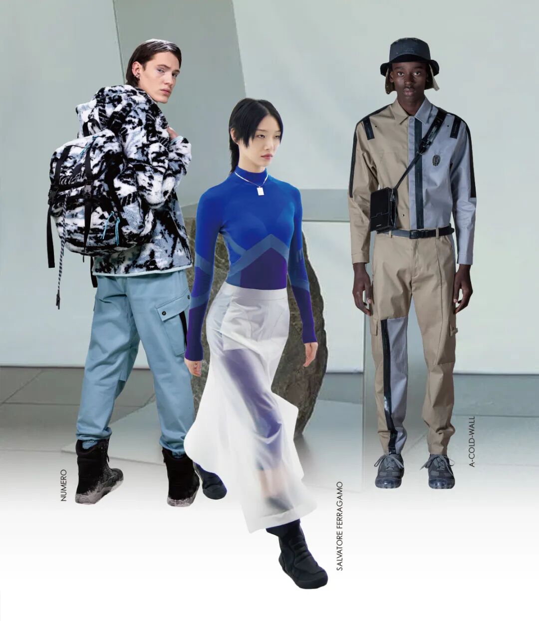 未来的、数字化的、梦幻的、机能的,重新融入户外世界的声音依旧高涨,美学与功能性兼顾是关键,将专业防护性融入日常着装当中,是未来设计新的着眼点。