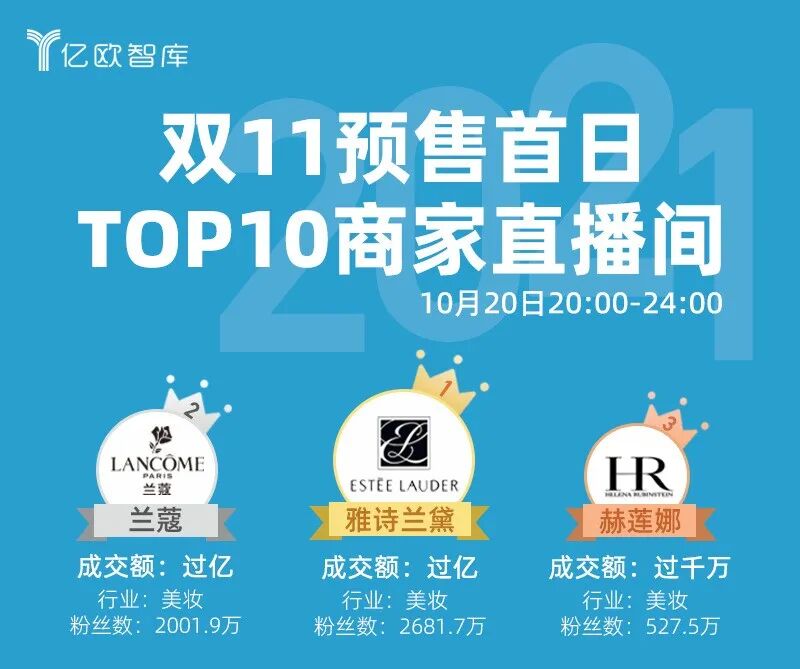 亿欧数据统计显示,10 月 20 日预售开场后 1 小时,淘宝直播全平台成交额比去年全天高出 11.9%,包括雅诗兰黛、兰蔻在内淘宝直播共诞生 5 个过亿直播间,而李佳琦、薇娅预售首场销售额分别刷新二人记录达到 106.53 亿元、82.52 亿元。雅诗兰黛、兰蔻成为成交额过亿美妆直播间