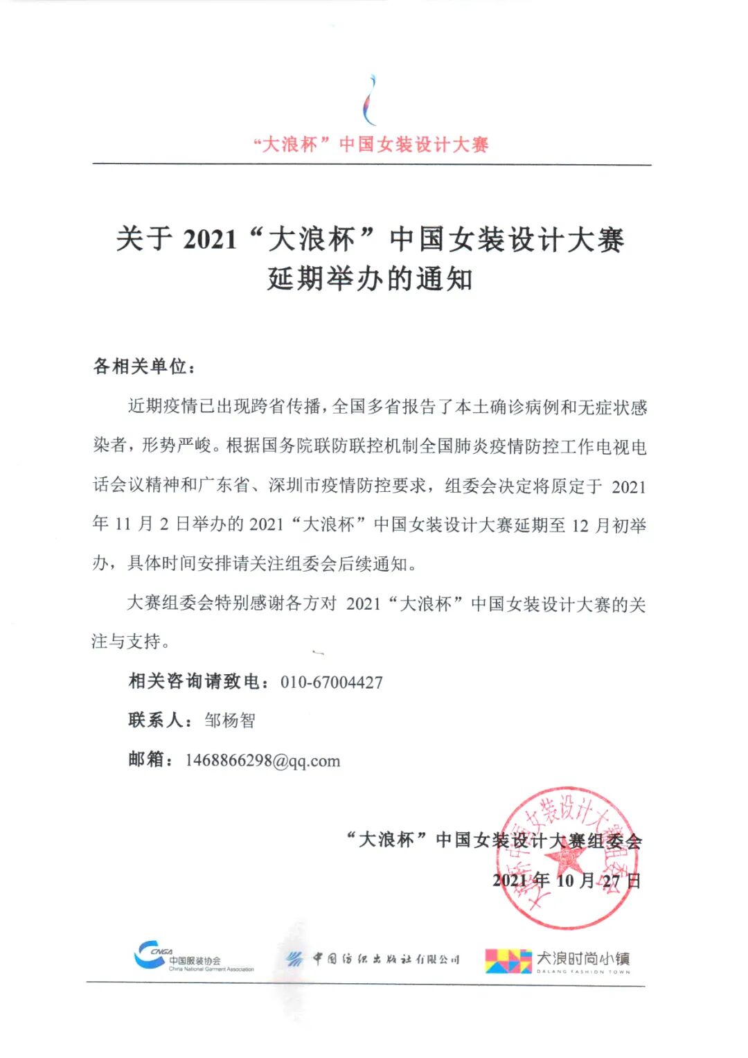 近期疫情已出现跨省传播,全国多省报告了本土确诊病例和无症状感染者,形势严峻。根据国务院联防联控机制全国肺炎疫情防控工作电视电话会议精神和广东省、深圳市疫情防控要求,组委会决定将原定于2021年11月2日举办的2021“大浪杯”中国女装设计大赛延期至12月初举办,具体时间安排请关注组委会后续通知。