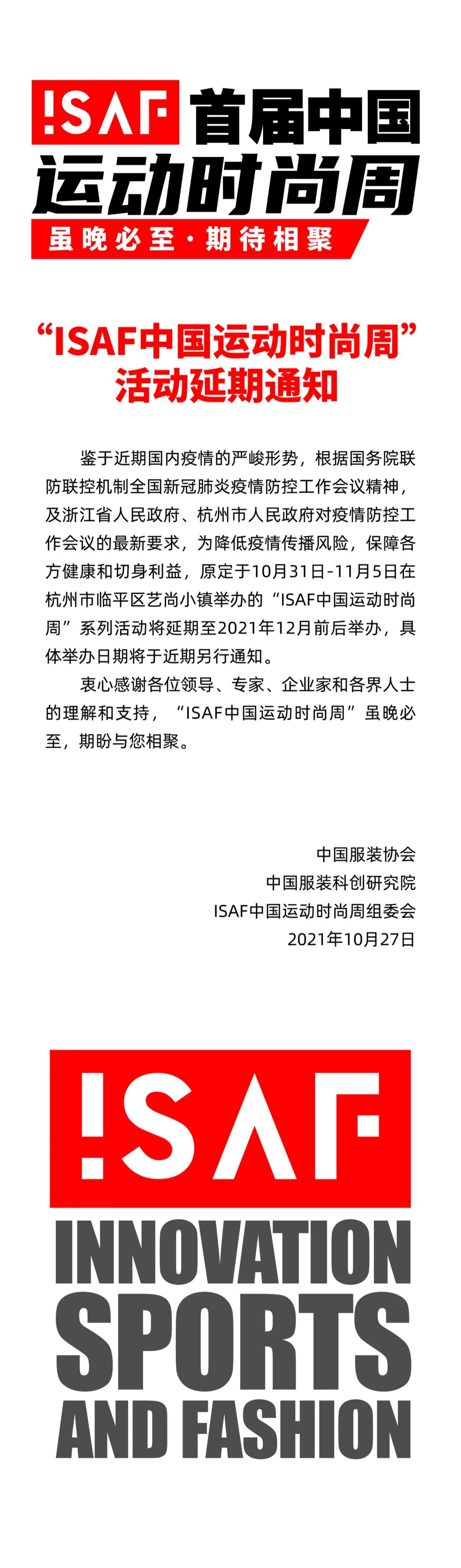 关于“ISAF首届中国运动时尚周”活动延期的通知