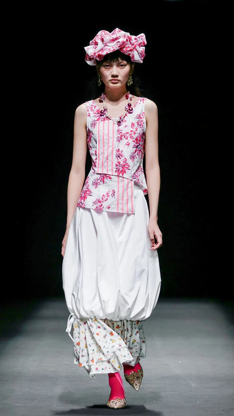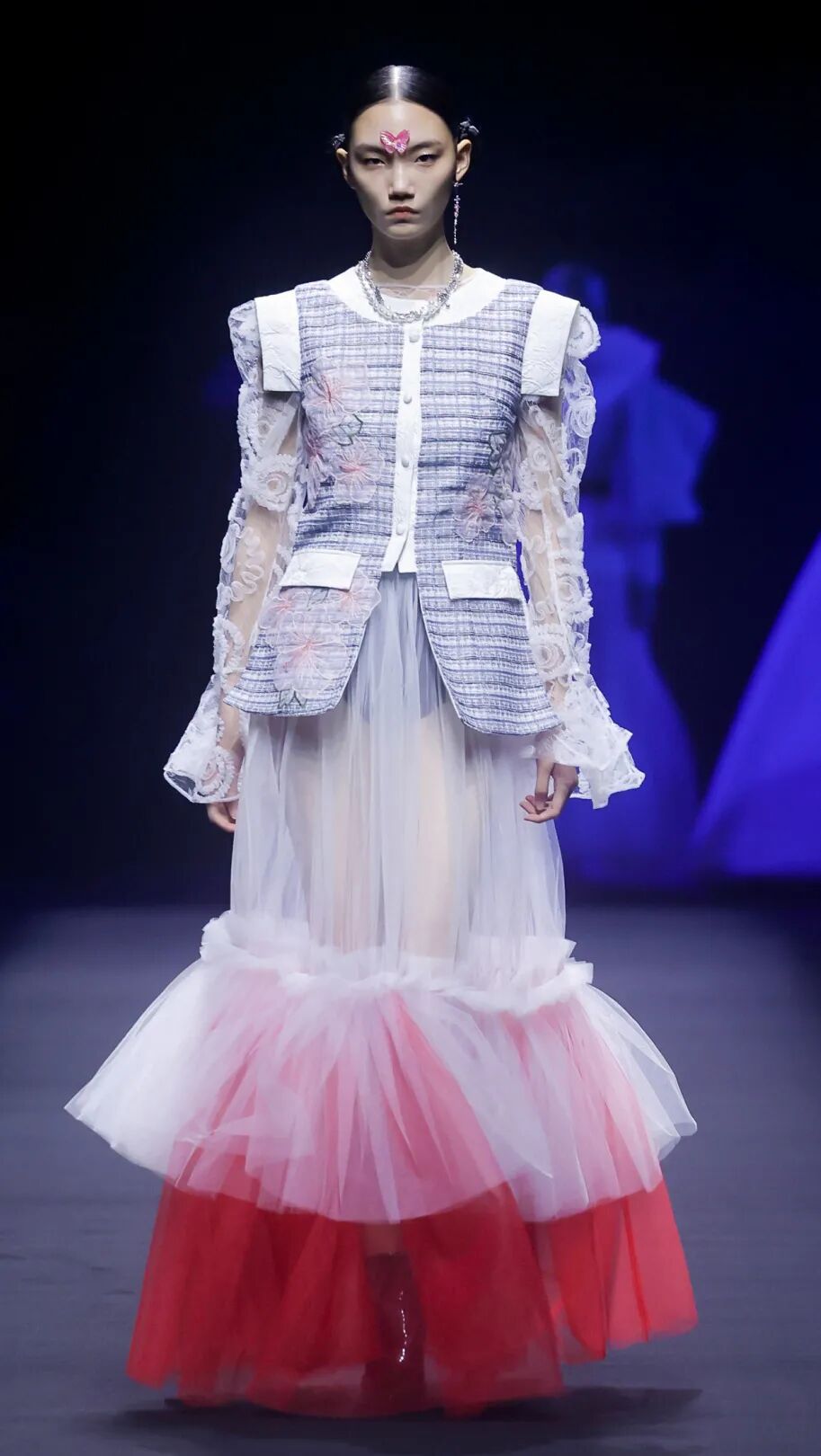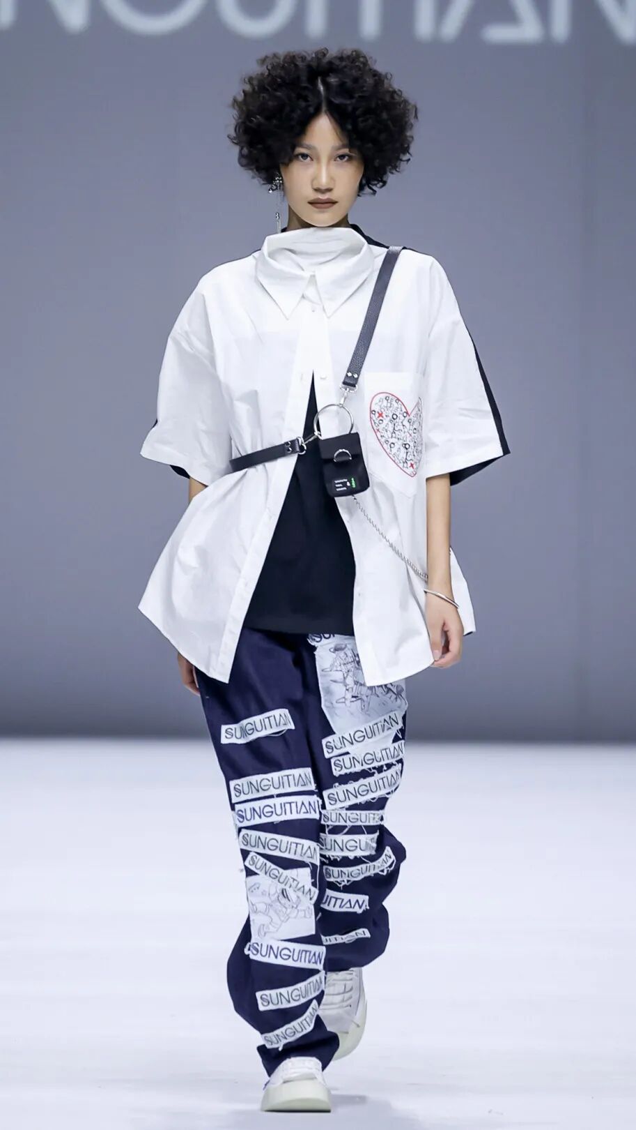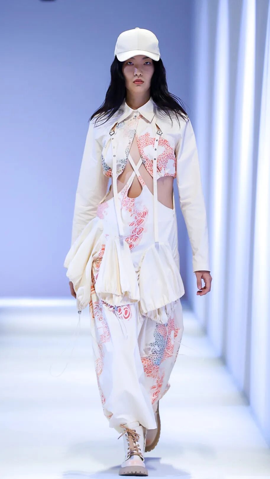 素白、Pastoral Poetry的中国风意味;沫兮、Hongwei s 、PATAVINITY天马行空的手绘、SUNGUITIAN和怪诞星球的贴布成图······设计师们将不同种类的图案像制作手账一般,把超过两种的图案种类组合在一起,这种拼接艺术在亮眼吸睛的同时也增添了趣味性。而且品牌们采用了多种工艺叠加组合来展现这种融合,充分的视觉效果让服装更具层次感。