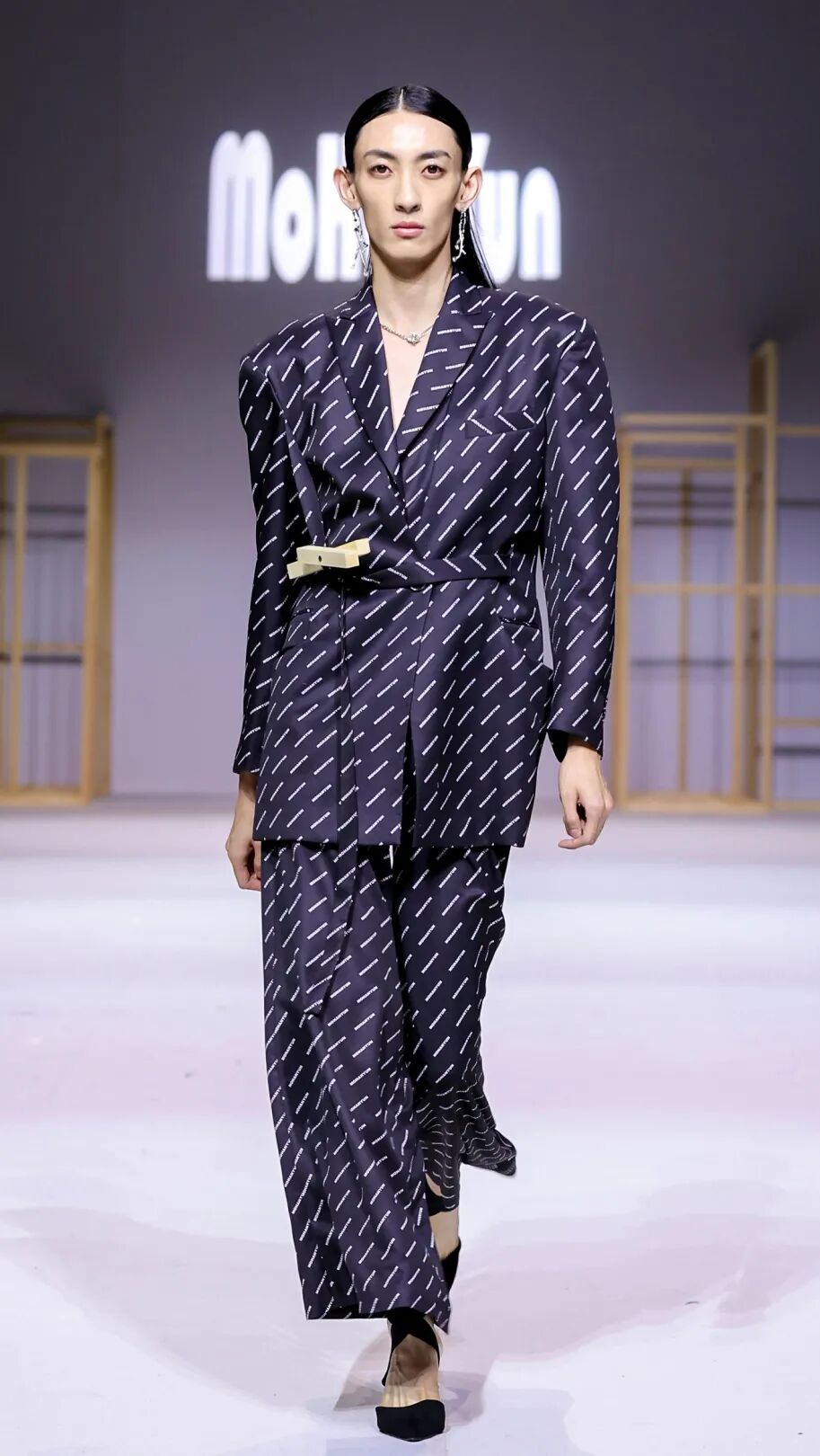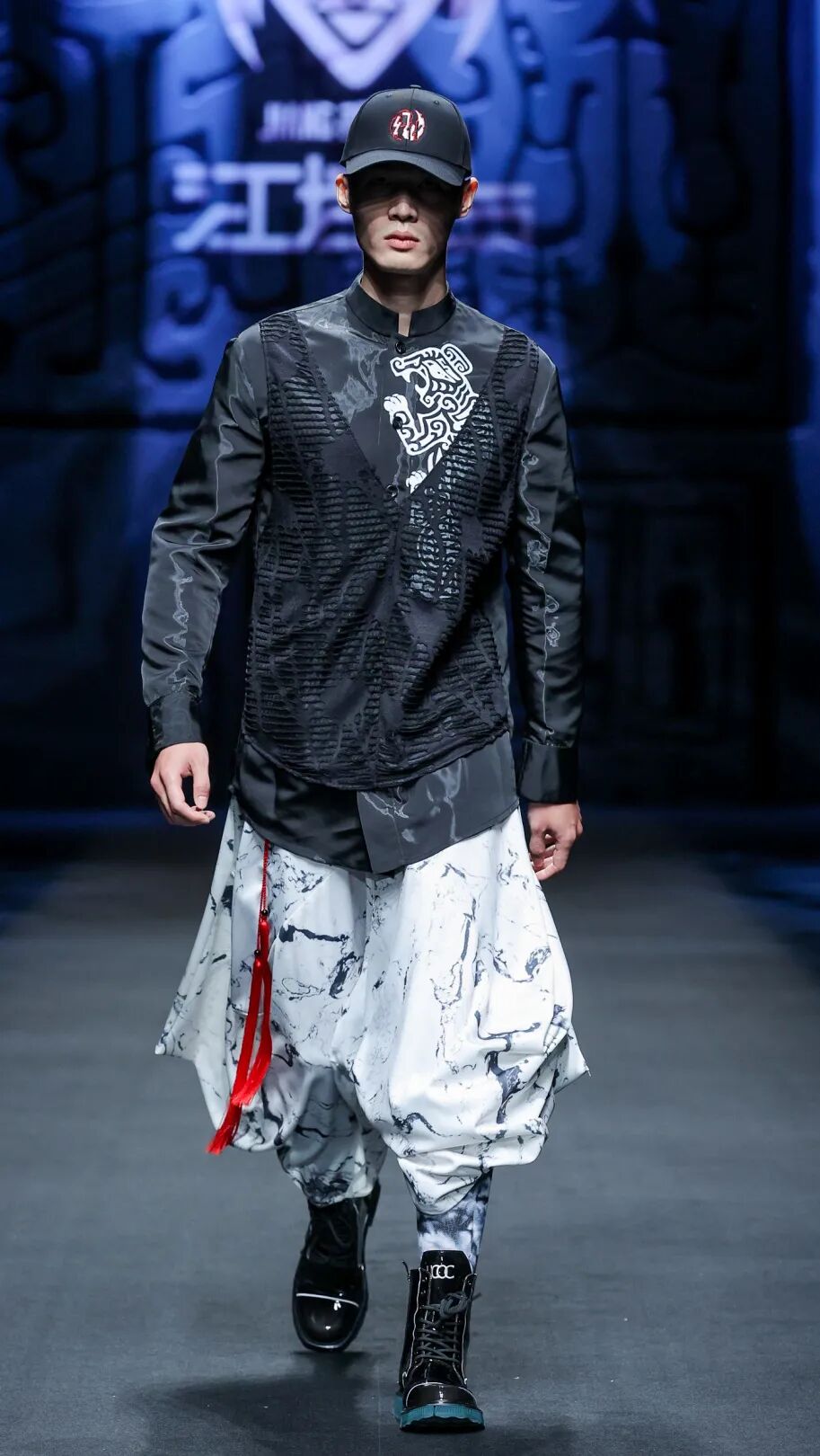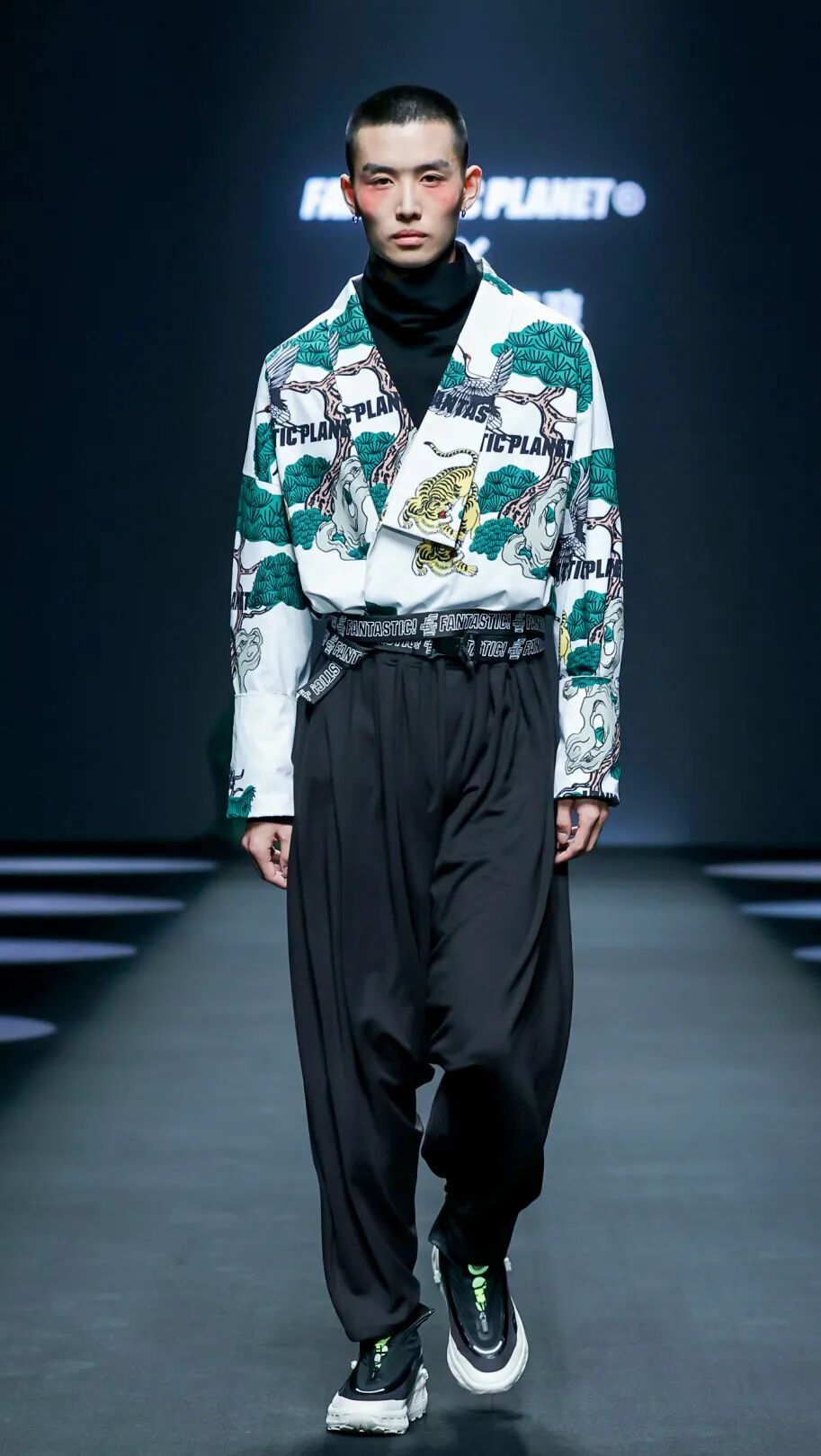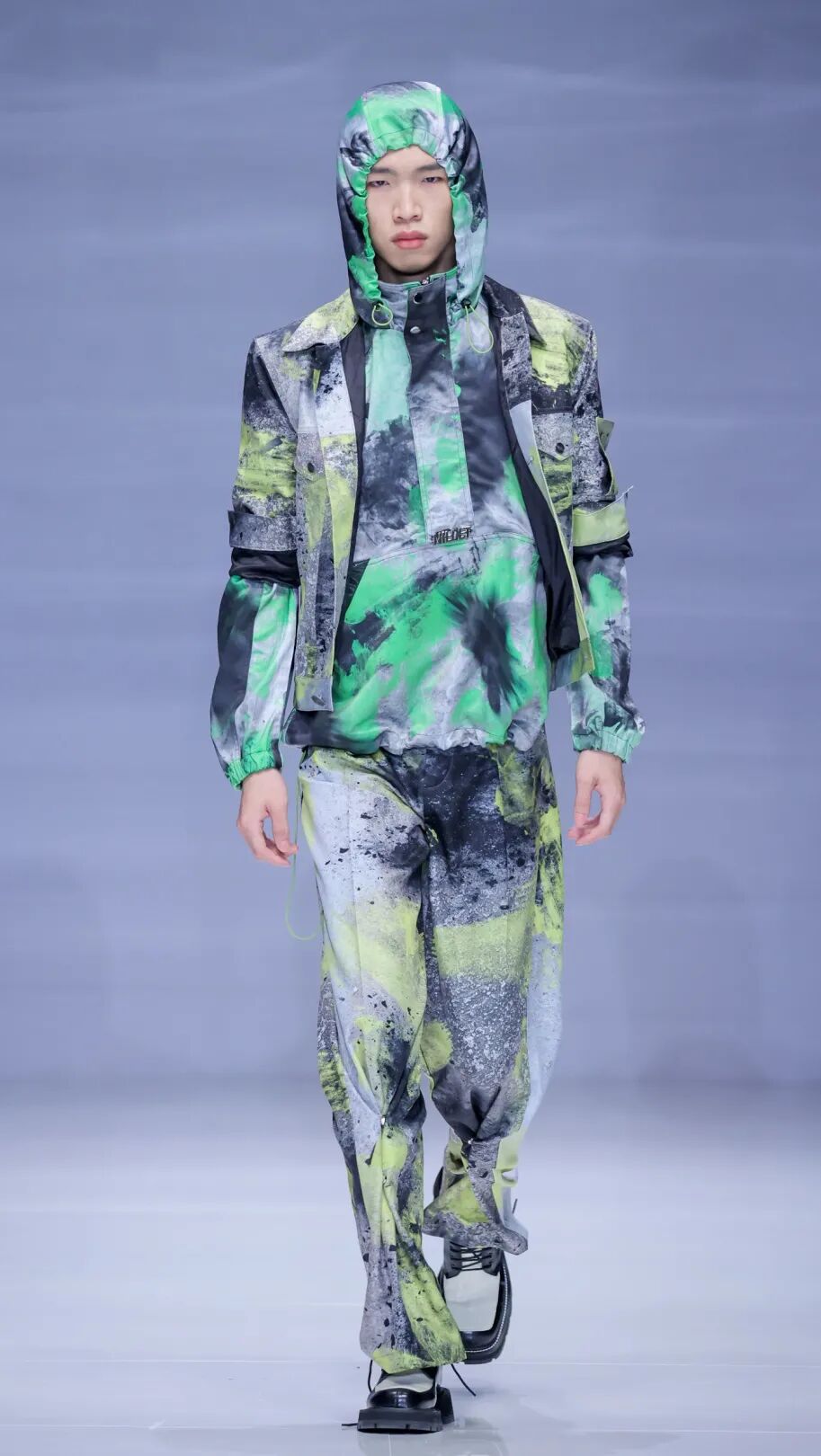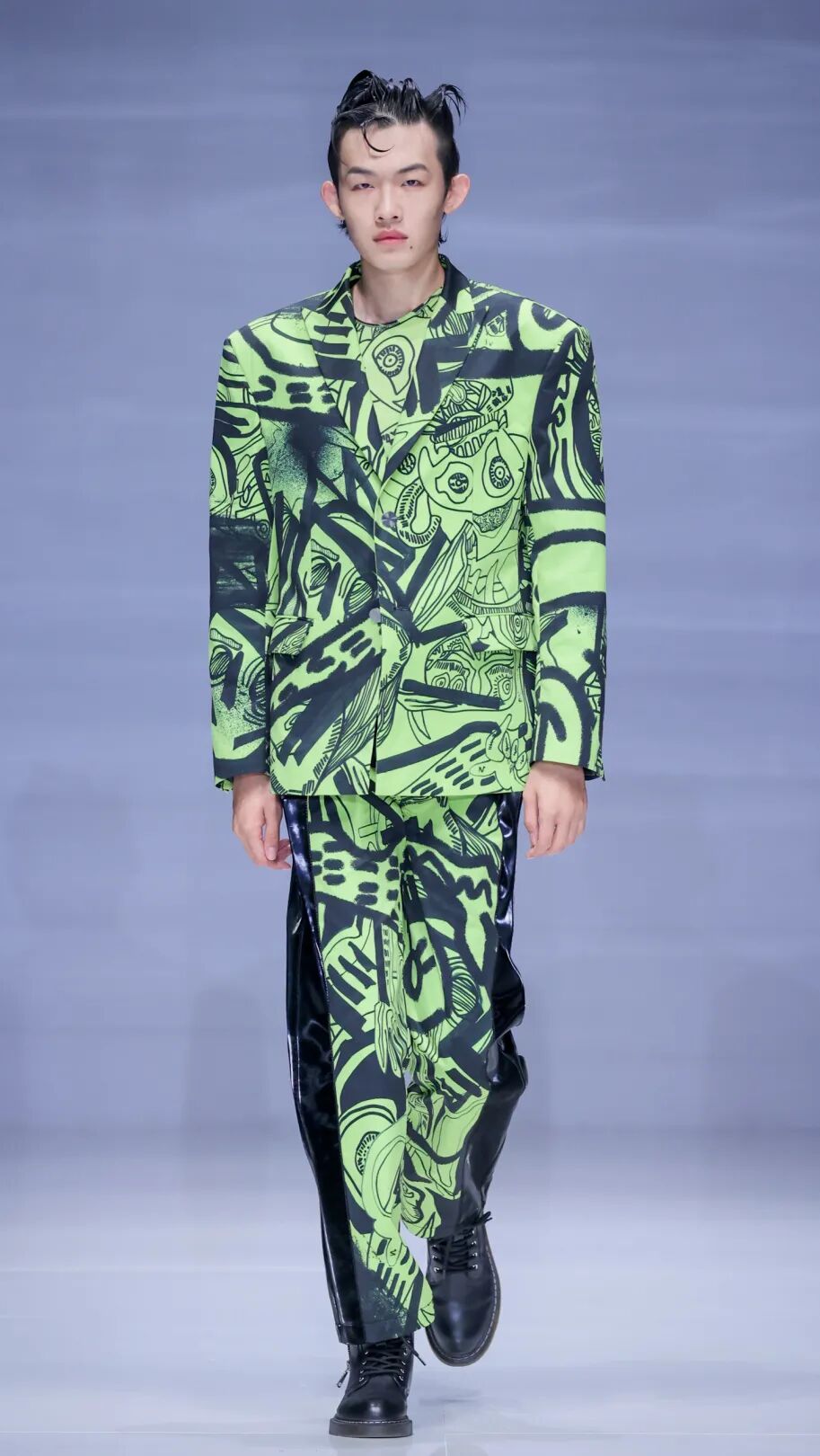 不拘泥于单一的几何图形,可以看到本季秀场上品牌们从孟菲斯风格、波普艺术、东方艺术、非洲拉美艺术中寻求灵感,让看似的简单的搭配充满个性和韵味。怪诞星球利用中国邮政LOGO的几何属性开发出全新的图案;MZSH、哭喊中心、三六一度·IISE x LIUYONG、WANMAY改变了几何图案的对称性;劲霸男装、Hongwei s、JUNNE通过点、线、面的变化呈现出丰富的纹样,为服装增添了“力量感”。