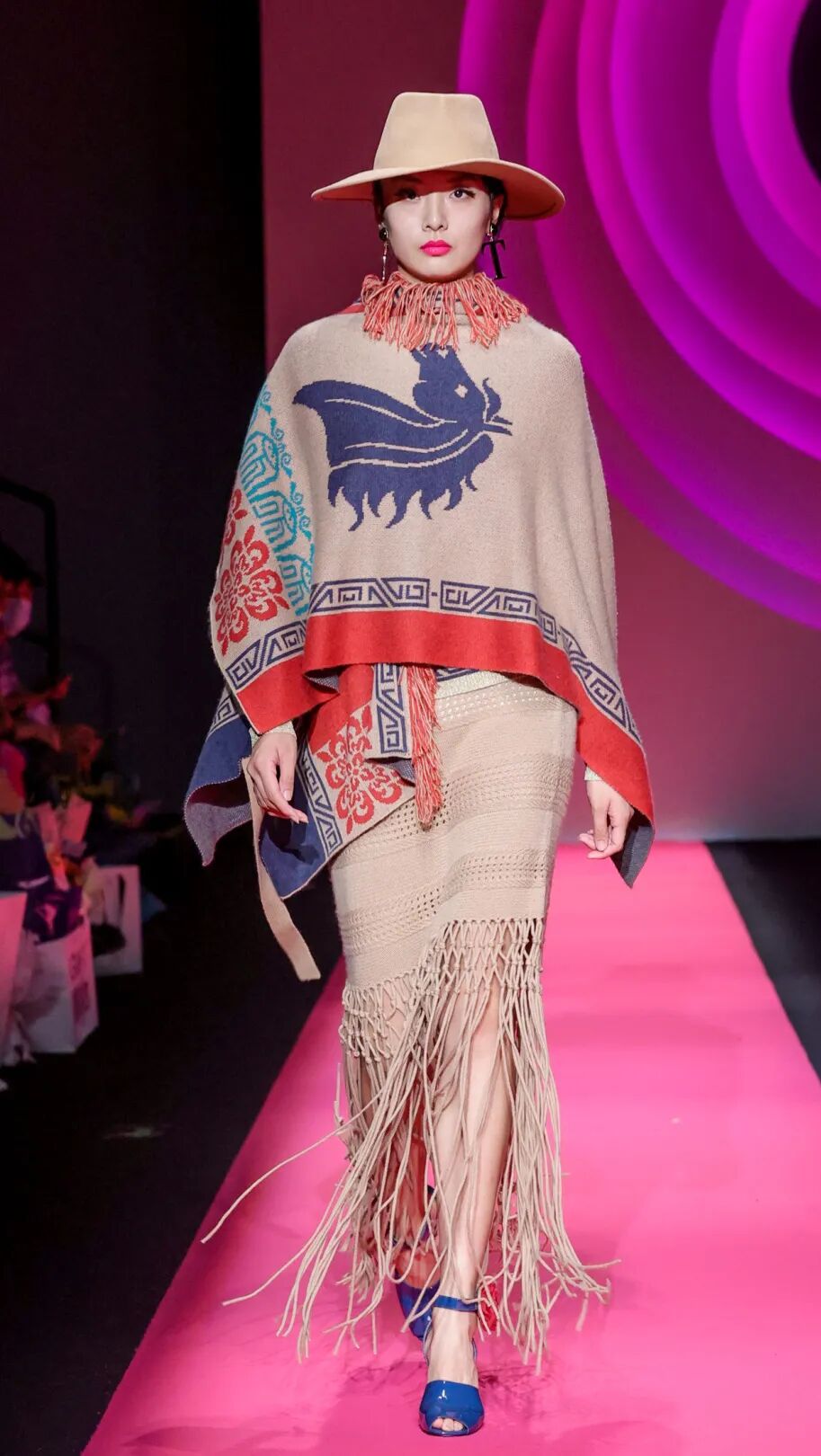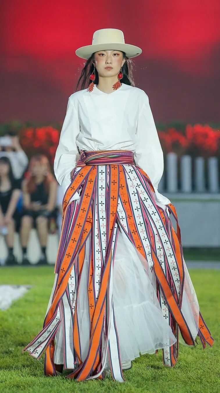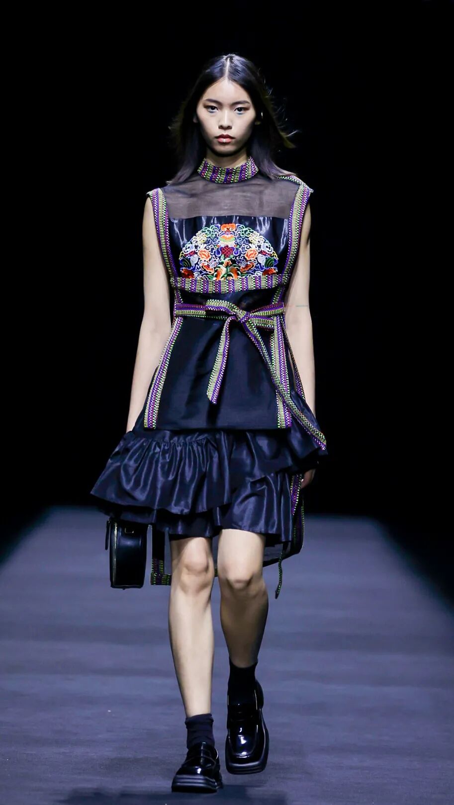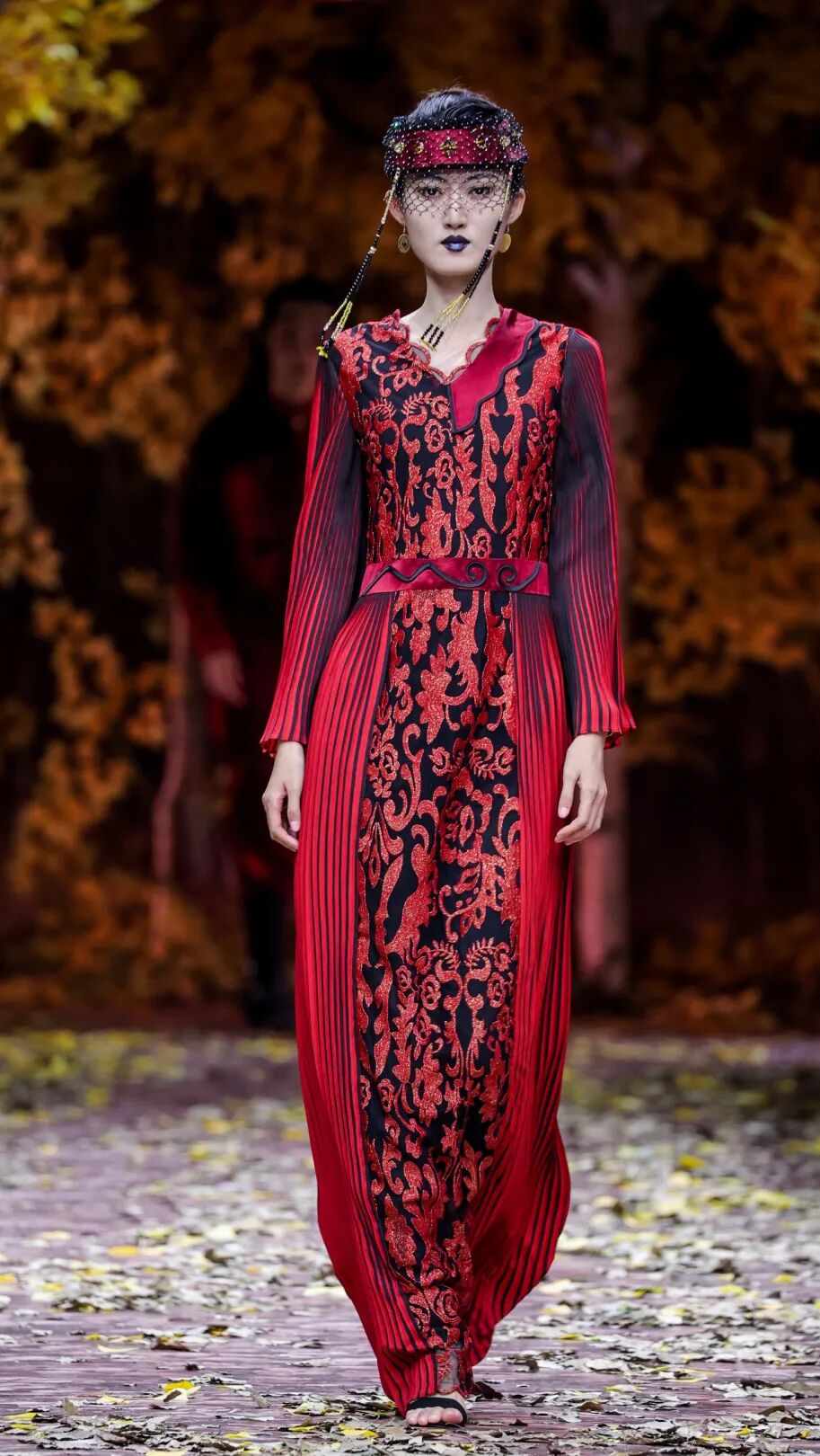 多彩的少数民族纹样精美绝伦,独具辨识度,是民族服饰中无处不在的智慧表现,就算作为边饰点缀也仍旧吸睛。设计师们通过提炼简化,结合设计主题,谱写一篇篇“彩线上的史诗”。金景怡展示了鄂伦春族文化服饰秀;中元素将“瑶族元素”进行现代设计;蕃巴秀演绎别样藏族风情;天山集团带来新疆民族文化;A.1 FASHION CHANGES LIFE展示了哈萨克族牧民们的转场生活······JIWENBO PRIVE、TRACY CHU、MACKZHENG、新联和集团也在系列设计中融入民族风元素的图案。