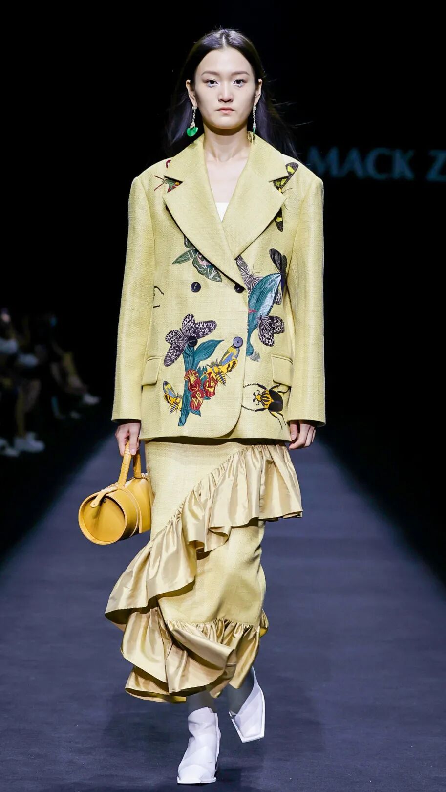 动物能带给人们回归本真的情感体验,设计师们将动物的某种特殊属性放大化,形成动物元素来传达特定的认知情绪。本季,MACKZHENG、LIQINGWEI、YOUG X、成锦衣局、盖娅传说、A.1 FASHION CHANGES LIFE、LINC chic、江培占、怪诞星球的设计师们通过对动物形象的拟人化或卡通化,结合色彩、面料和廓形来展现,将动物纹样以更抽象、更灵活、更丰富的状态呈现在服装上。