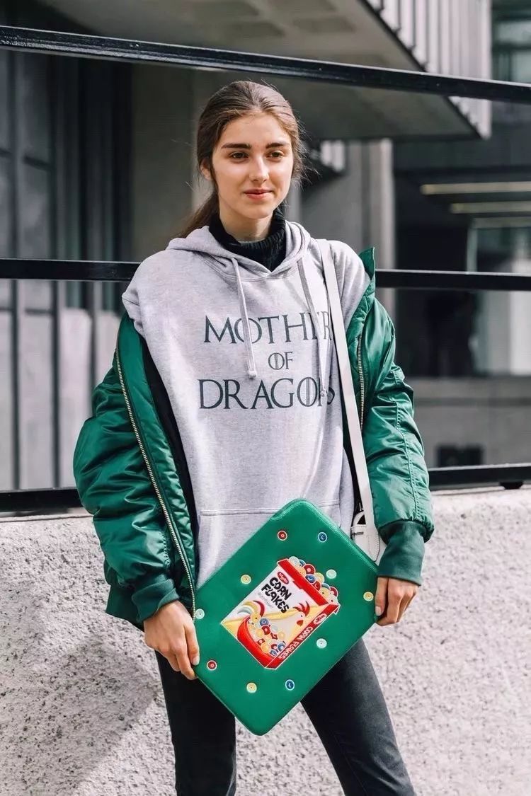 高领衫作为增添层次感的内搭,一般选择最百搭的黑色or灰色即可,卫衣则可以选择带有印花图案的款式,时髦指数更加倍。