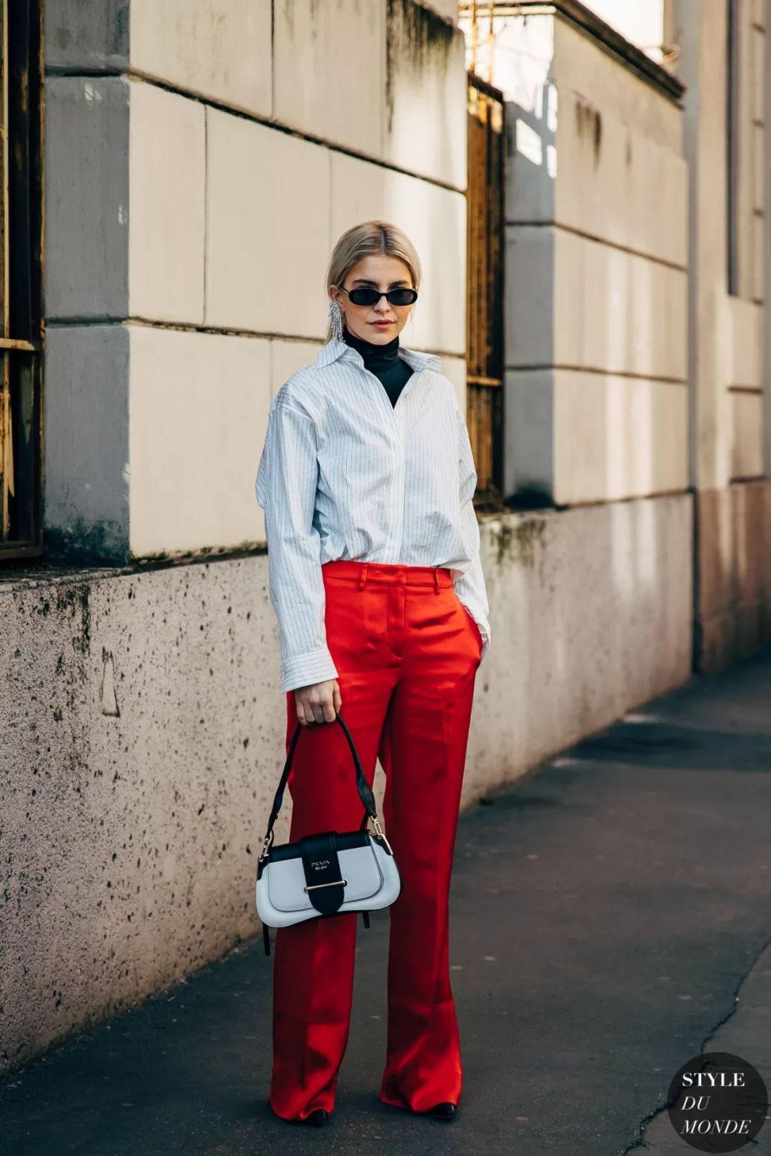 条纹衬衫虽百搭,但正式感太强,一不小心容易穿出死板的感觉。用一件小高领搭配可以淡化哦。