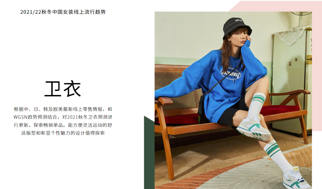 根据中、日、韩及欧美最新线上零售情报,和WGSN趋势预测结合,对2021秋冬卫衣预测进行更新,探索畅销单品。能方便灵活运动的舒适版型和彰显个性魅力的设计值得探索。