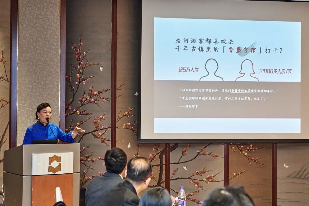 浙江香黛宫文化旅游发展有限公司董事长龚航宇以“国风潮流的跨界引爆”为主题分享了她个人和香黛宫品牌在跨界合作方面所做的尝试和努力。她认为,旗袍是服装,更是文化,多年来香黛宫品牌更是坚持“四位一体”创新体系,将文化艺术融入旗袍,并通过文化空间打造、品牌与影视剧和文旅项目等多种跨界合作方式,形成和演绎了香黛宫独特的品牌内涵和形象。