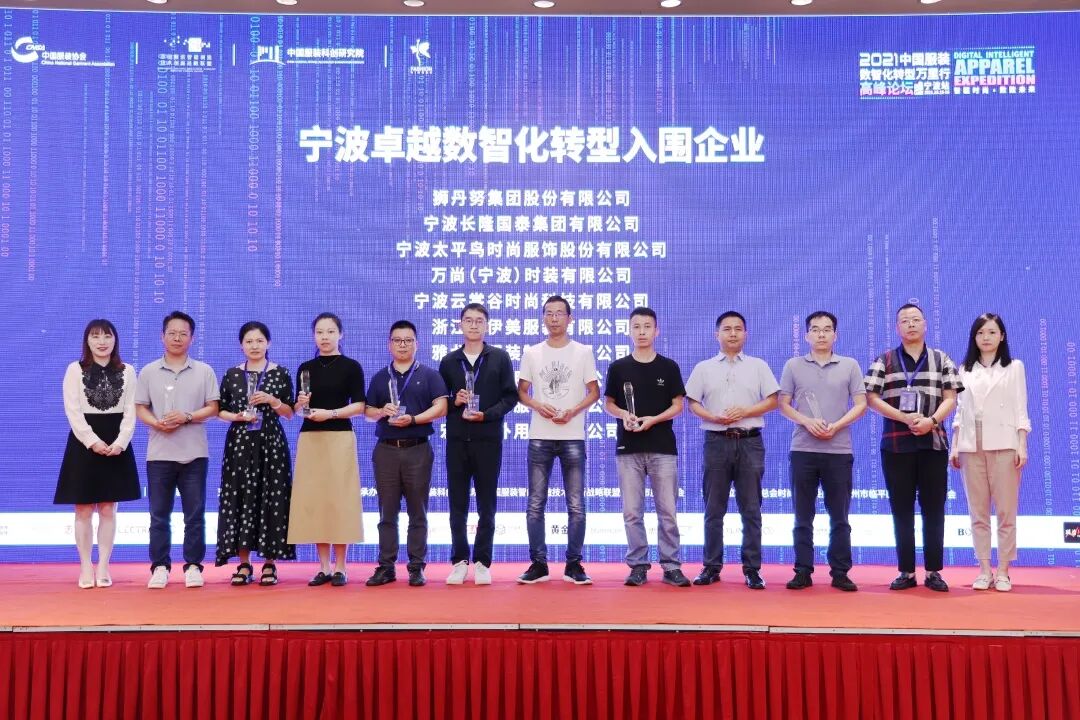 会议尾声,由宁波市服装协会秘书长毛屹华、中国服装协会科技部高级项目主任韩婧共同为狮丹努集团股份有限公司、宁波长隆国泰集团有限公司、宁波太平鸟时尚服饰股份有限公司、万尚(宁波)时装有限公司、宁波云裳谷时尚科技有限公司、浙江爱伊美服饰有限公司、雅戈尔服装制造有限公司、宁波凯信服饰有限公司、宁波嘉纳服饰有限公司、宏盛户外用品有限公司颁发宁波卓越数智化转型入围企业奖杯。