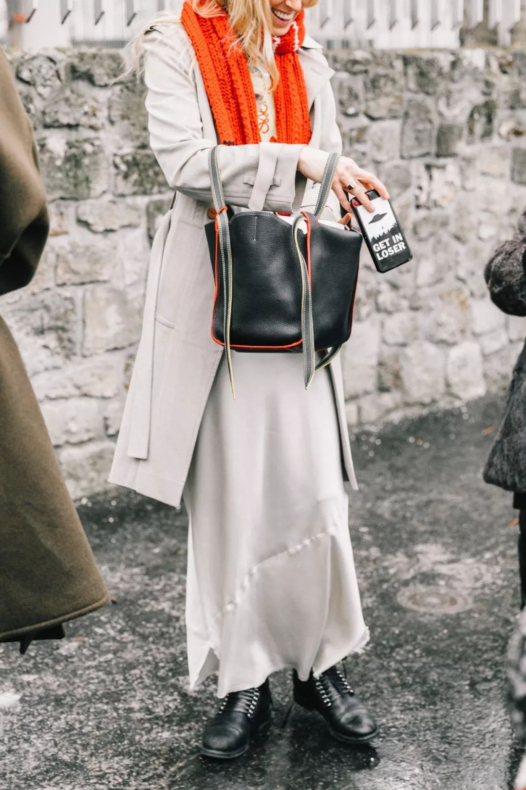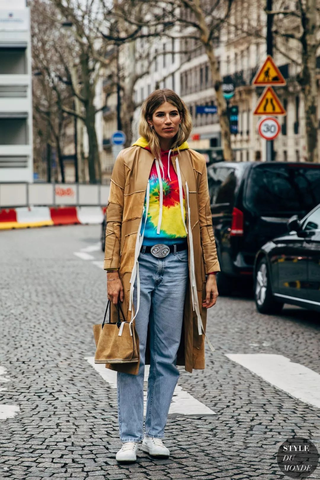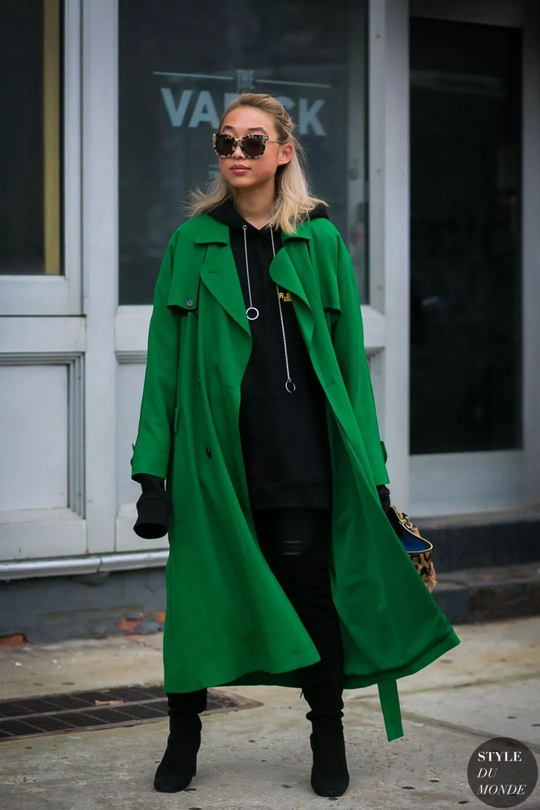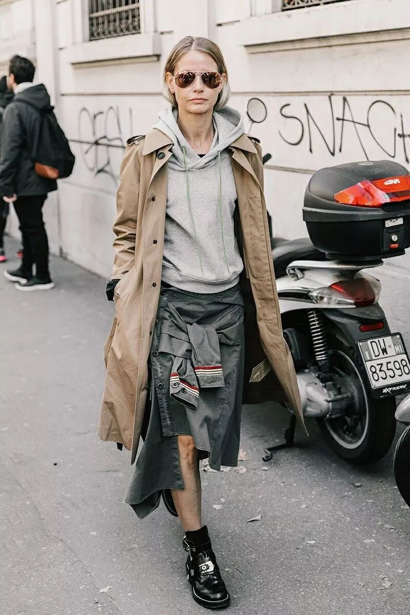 而且风衣+卫衣的叠穿组合又飒又时髦并且温暖力十足,最适合秋末换季时节穿搭不过,相信各路街拍潮人都非常钟意这么穿。
