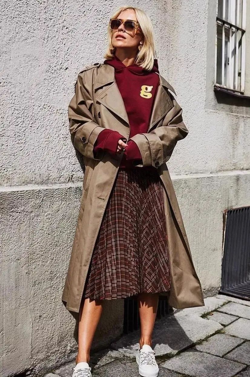 风衣与卫衣这两款经典单品看似风格并不相衬,但它们的混搭叠穿却可以可以实现1+1>2的最佳效果——自带气质标签的长风衣能够显著拔高卫衣的质感,而休闲率性的卫衣亦能恰到好处地中和淡化掉风衣的轻熟感,让你的秋日搭配look更加活力四射、时髦吸睛。