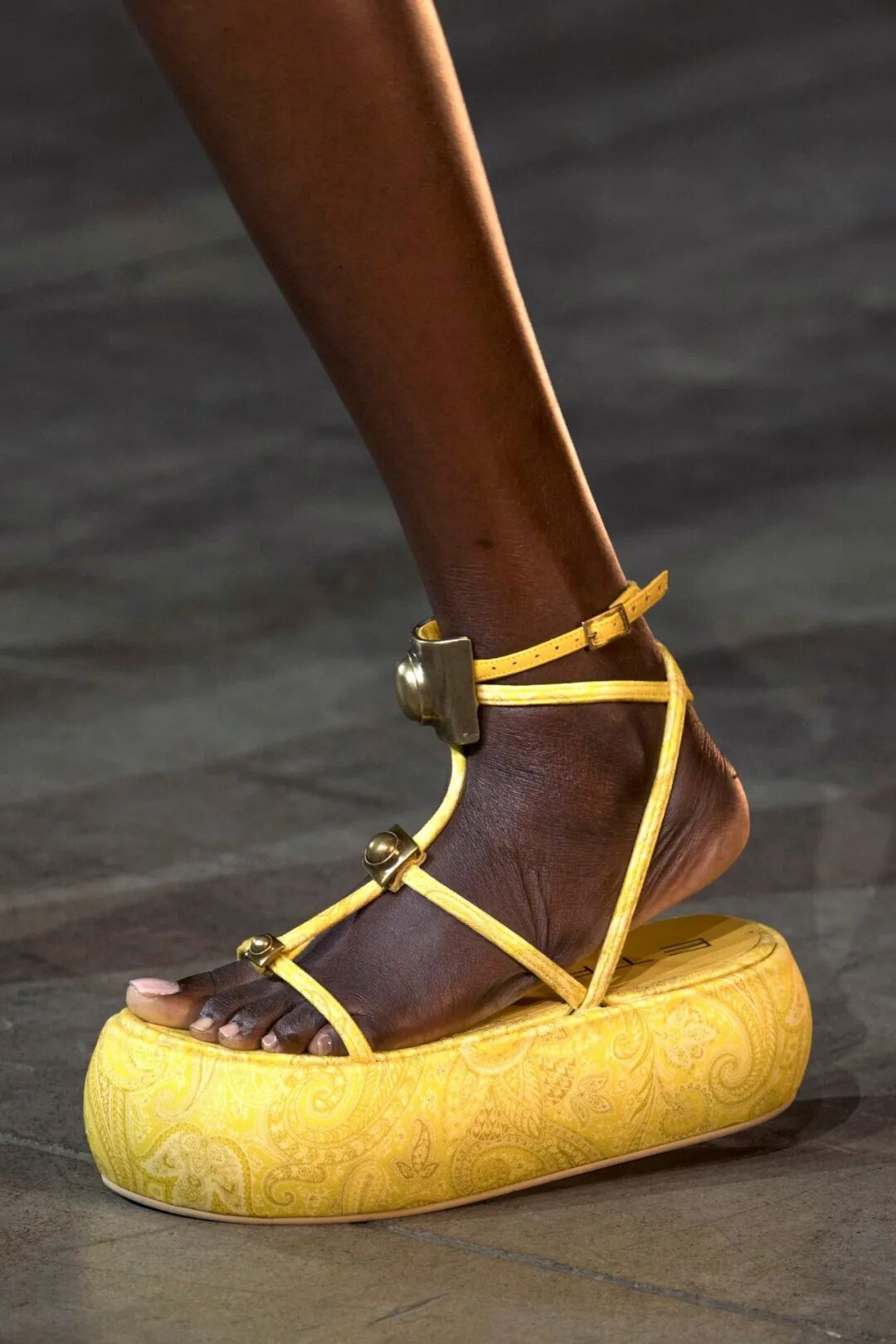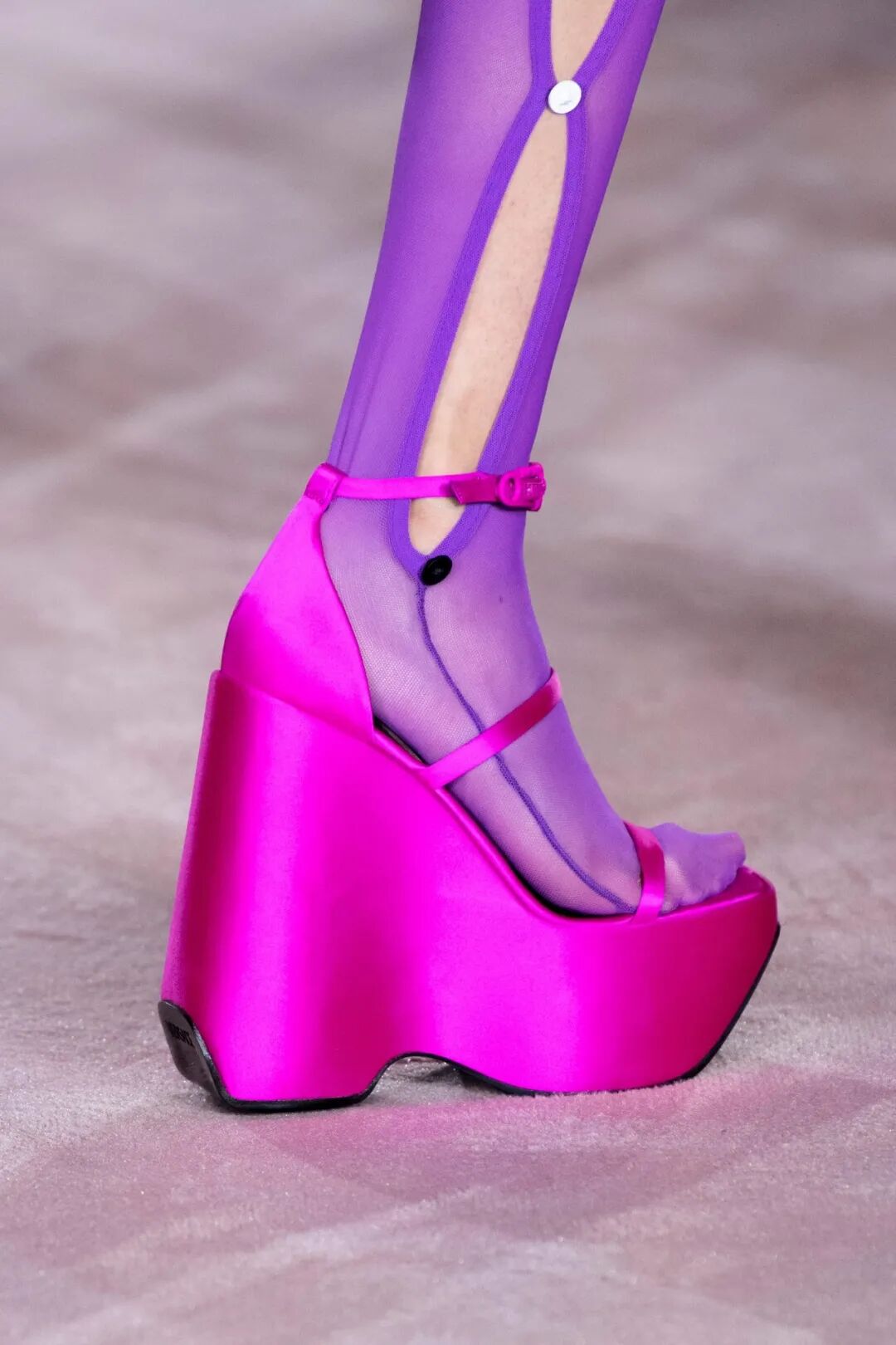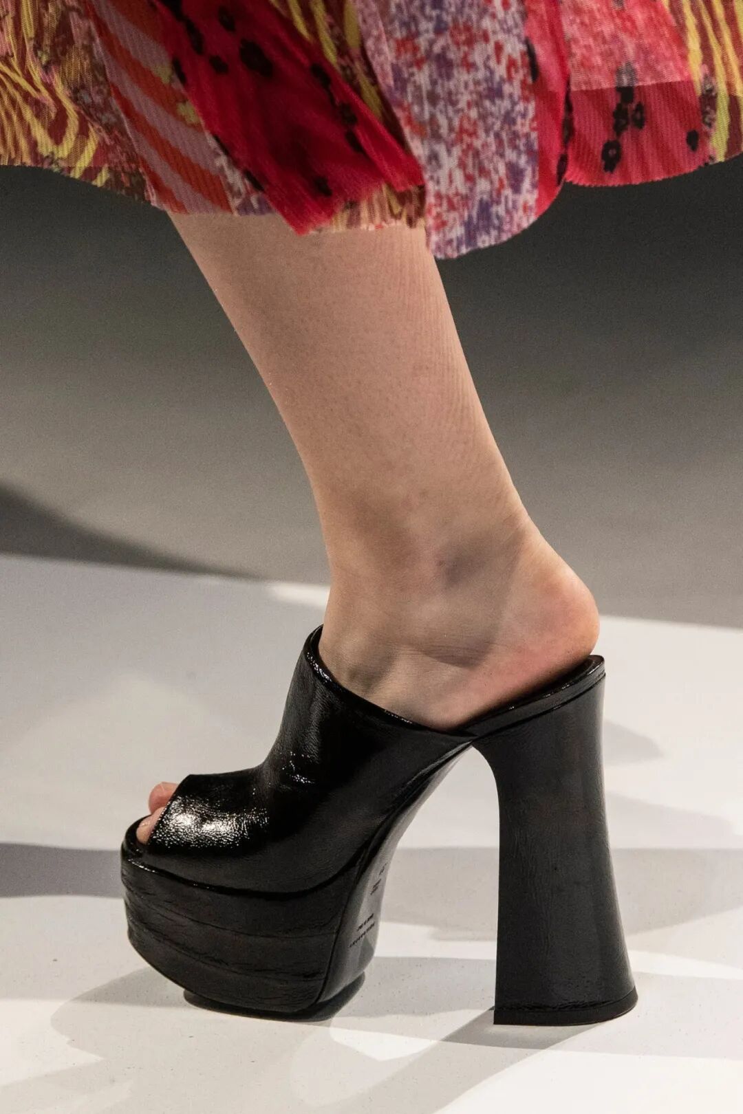 增高的欲望在本季的鞋类中占主导地位。米兰时装周 Philosophy di Lorenzo Serafini 时装秀上的模特们穿着漆木高跟鞋和皮革覆盖的高原。