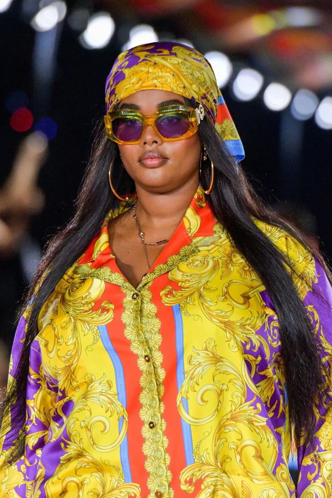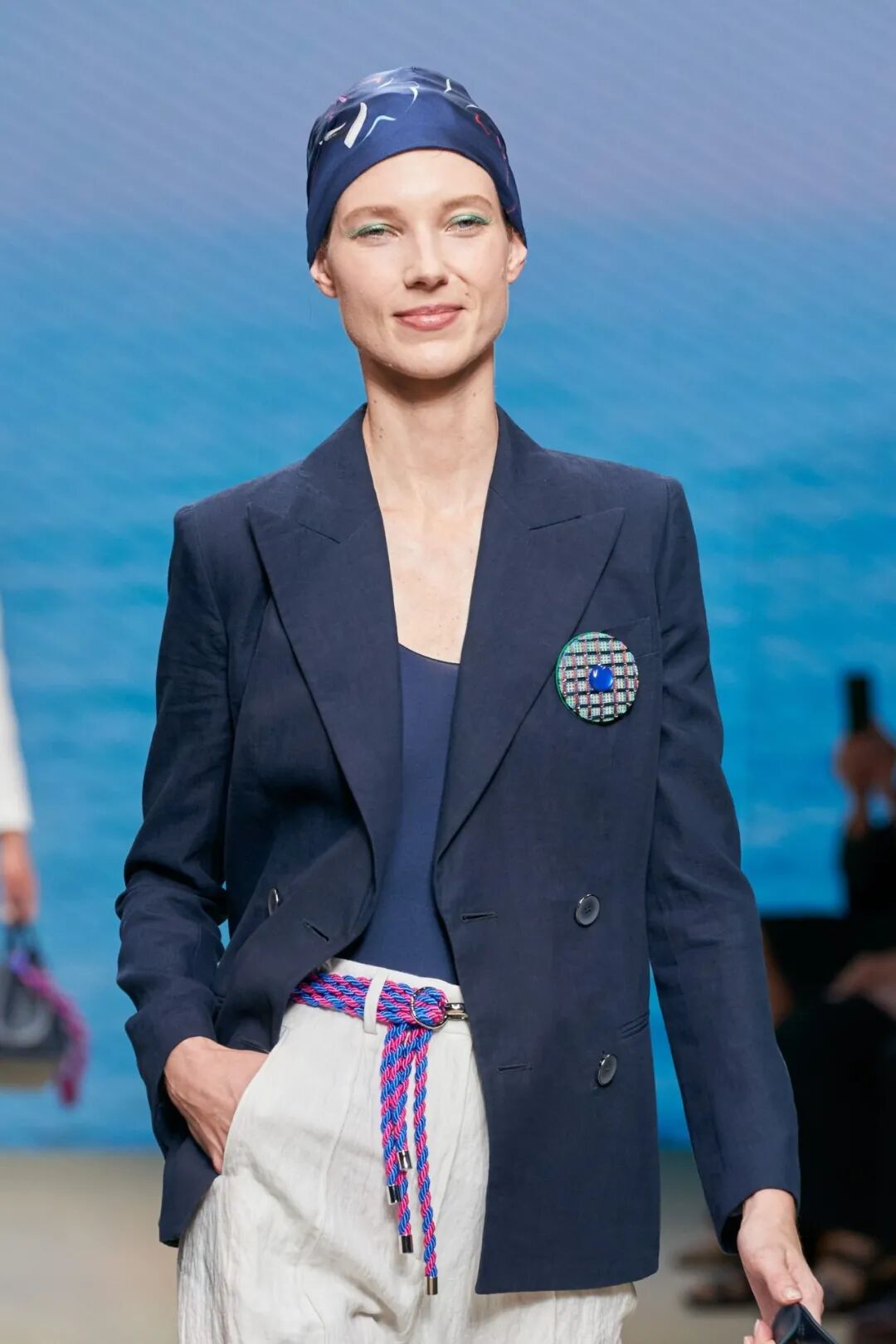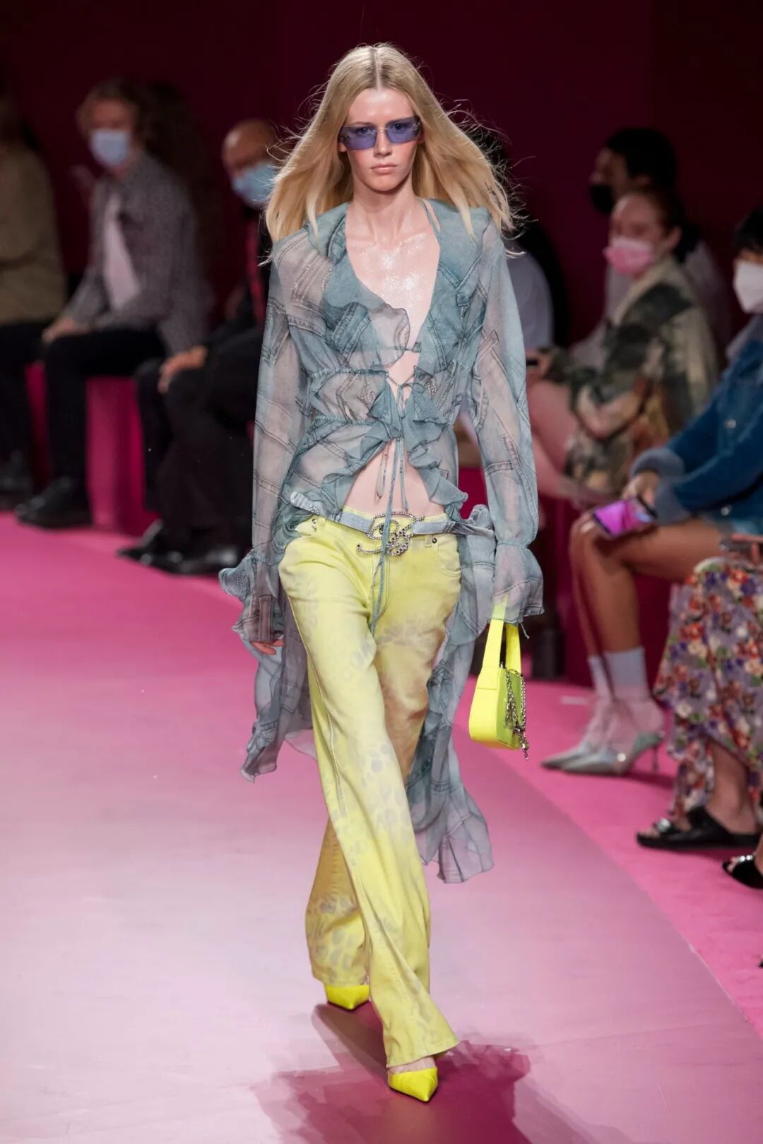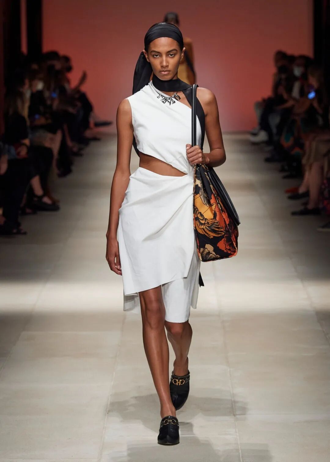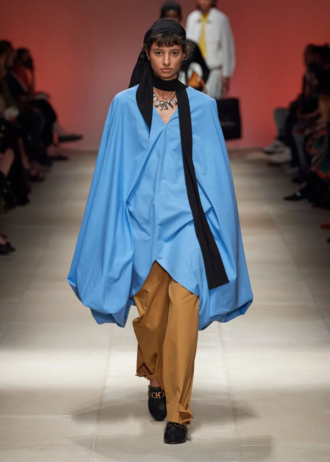 根据Blumarine的说法,围巾作为头饰仍将是SS22站的趋势。在任何情况下都与造型相同的面料相结合。