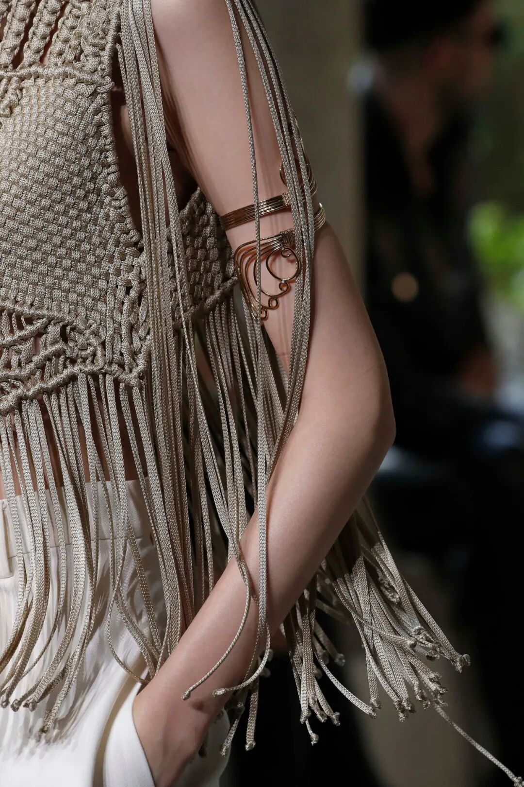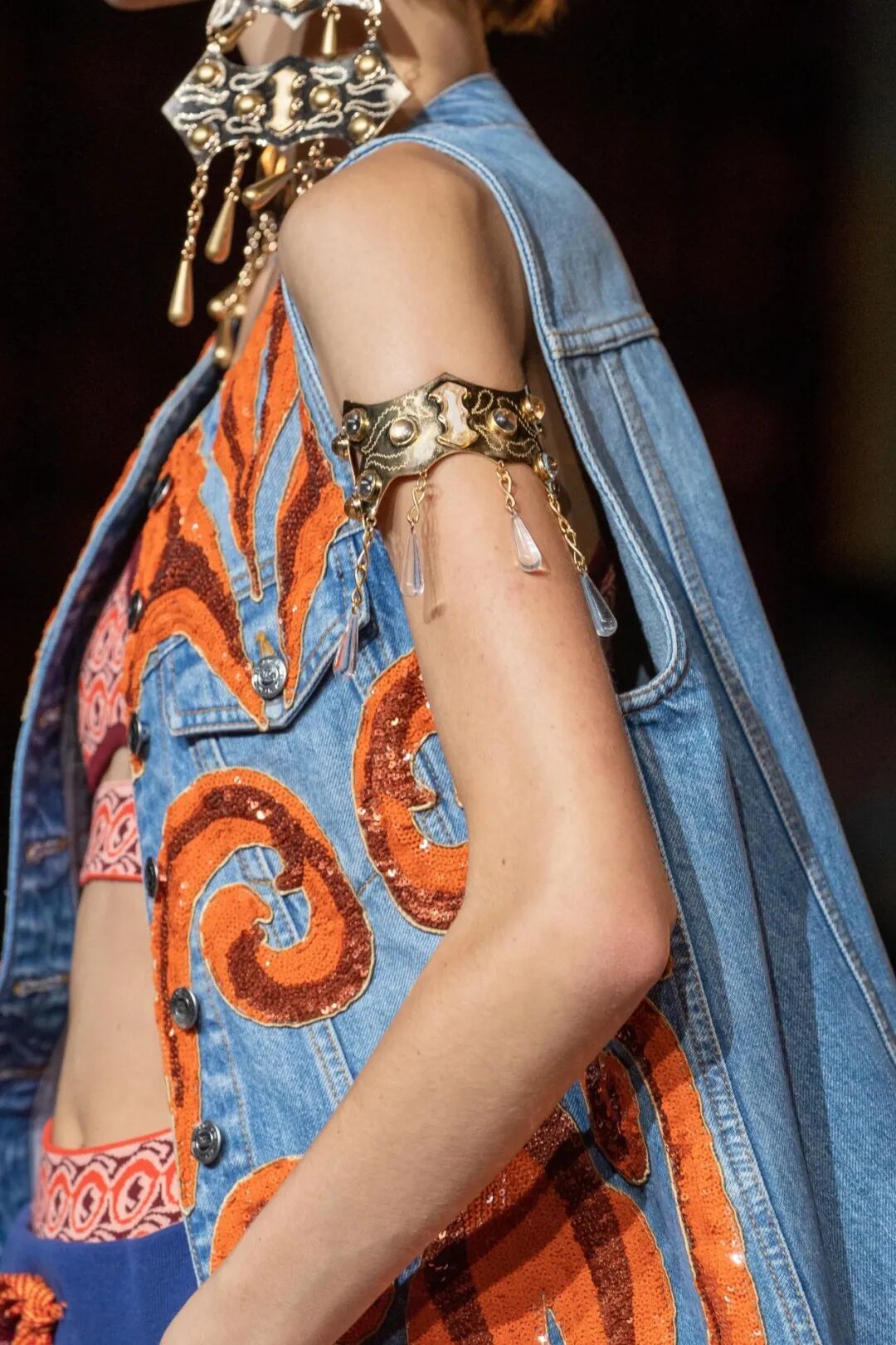 二头肌手镯的潮流又回来了。Etro 的那些是雕塑般的,用悬挂的石头装饰,与细肩带的连衣裙和背心夹克相结合。