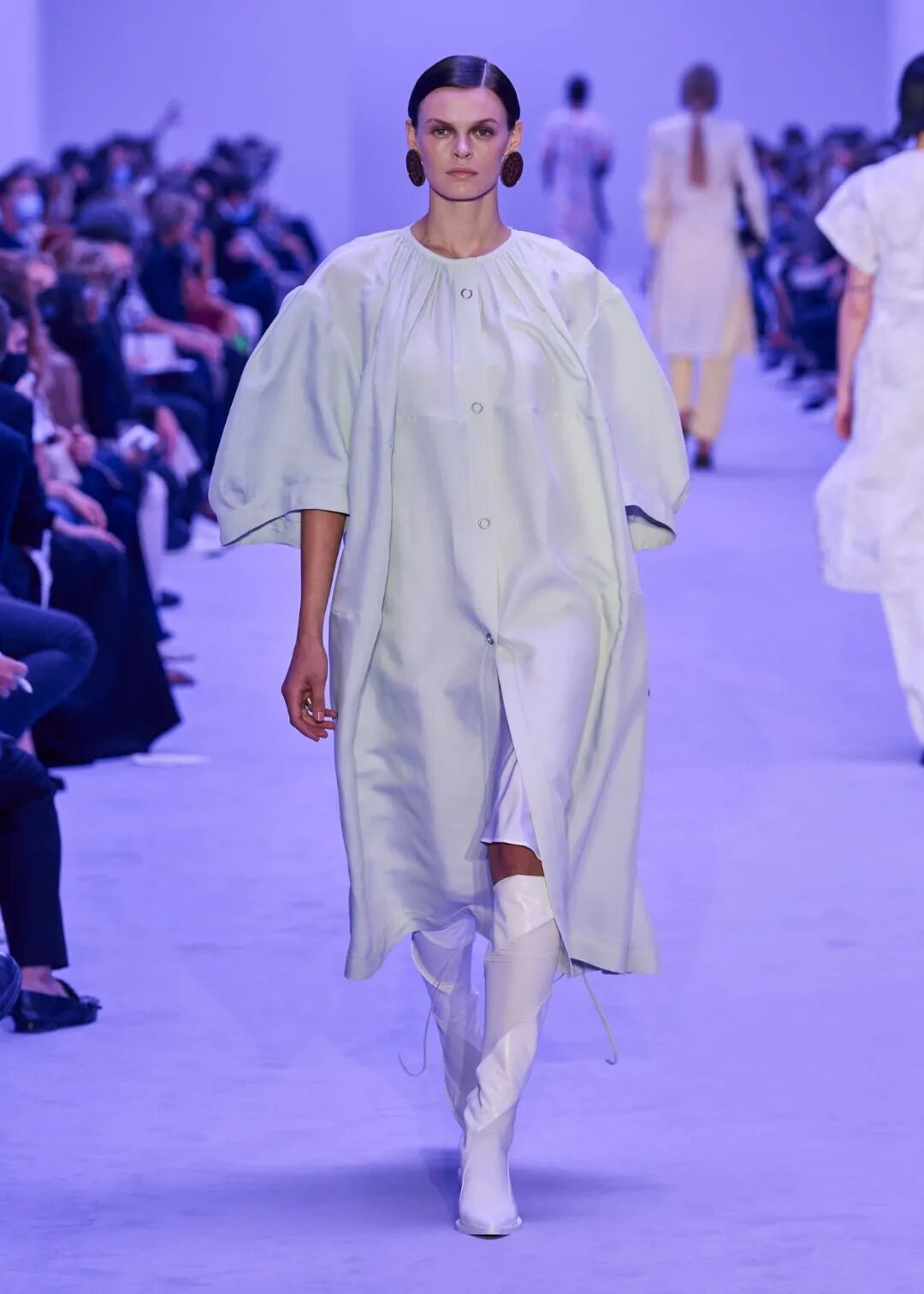 轻盈廓形和超大廓形诠释了仍追求舒适感的女性衣柜。Jil Sander秀场上最优雅的造型,垂褶上衣和蛋形外套。