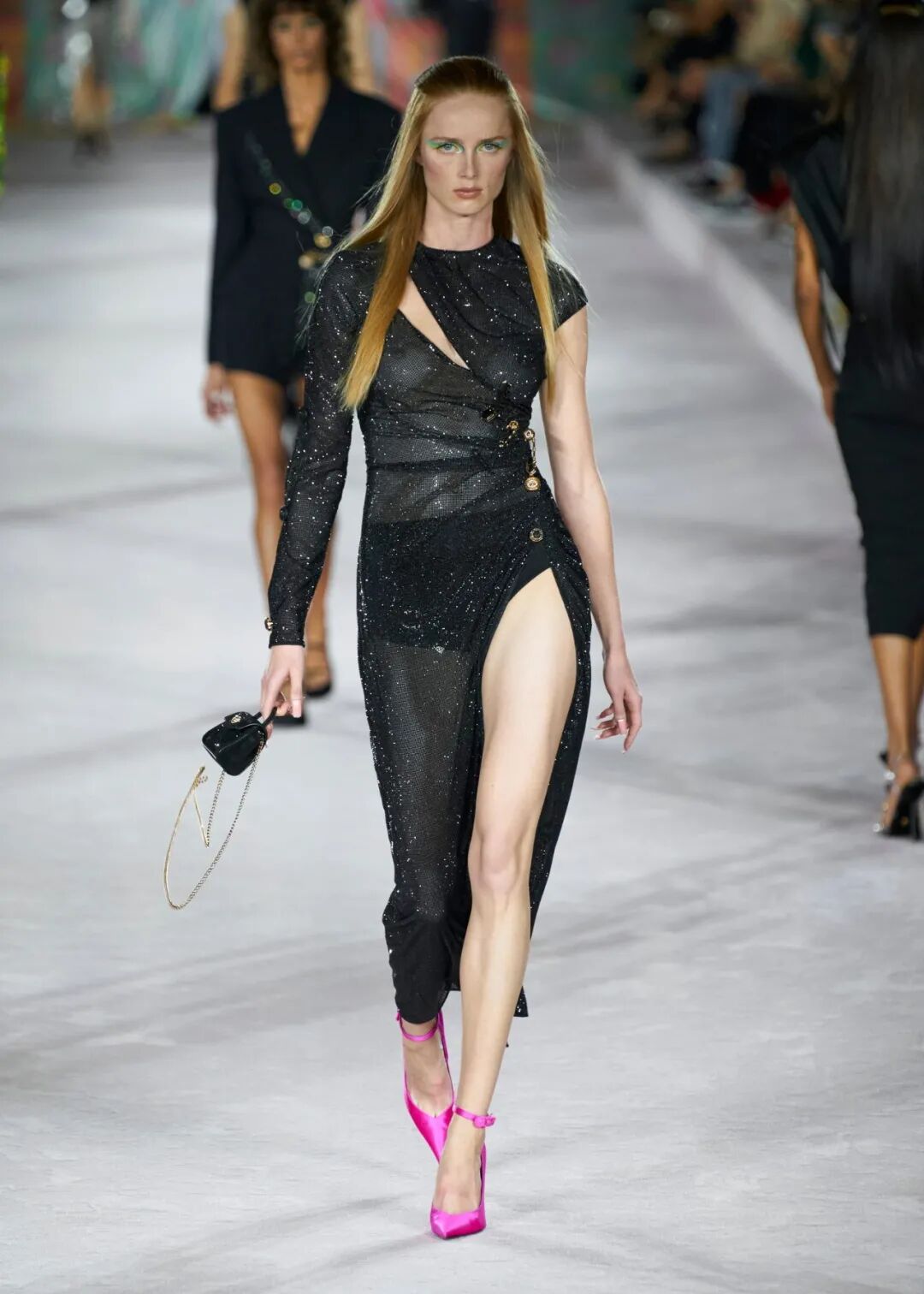 除了领口和开衩,在米兰时装周上最新的范思哲秀场上,上衣、裙子、裤子和连衣裙的面料上还有“剪裁” 。