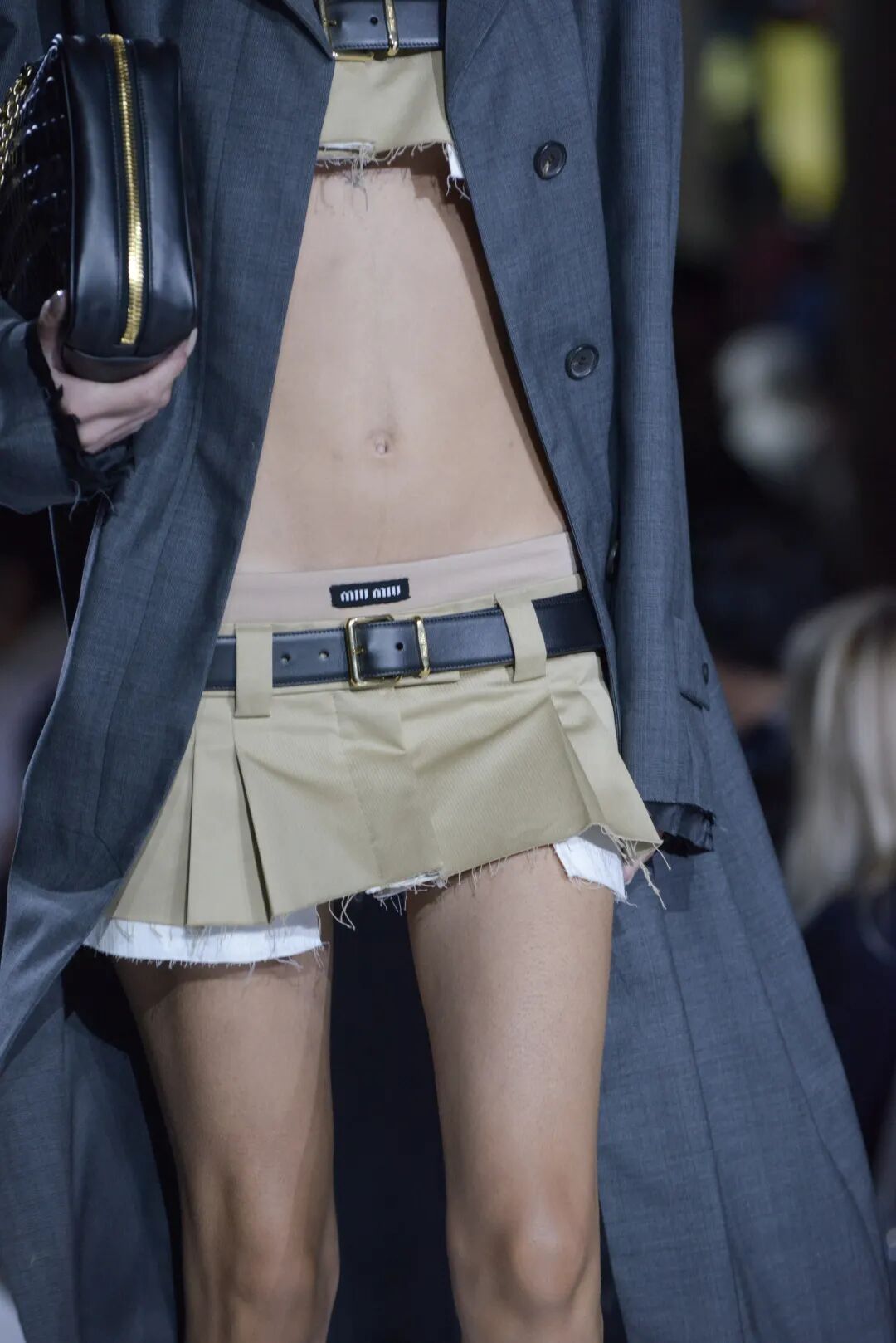 在本季巴黎时装周上,Miu Miu 的超短迷你裙便让人联想起 1990 年代由歌手布兰妮带起的“美国甜心”风格,彼时的超短裙正是每个青春少女的必备单品。在系列中,Miu Miu 以品牌的经典作品为创作基础——裤装,毛衣,衬衫,夹克,西装,紧身连衣裙皆为日常着装的绝对原型,以剪裁工艺创造出全新的比例。