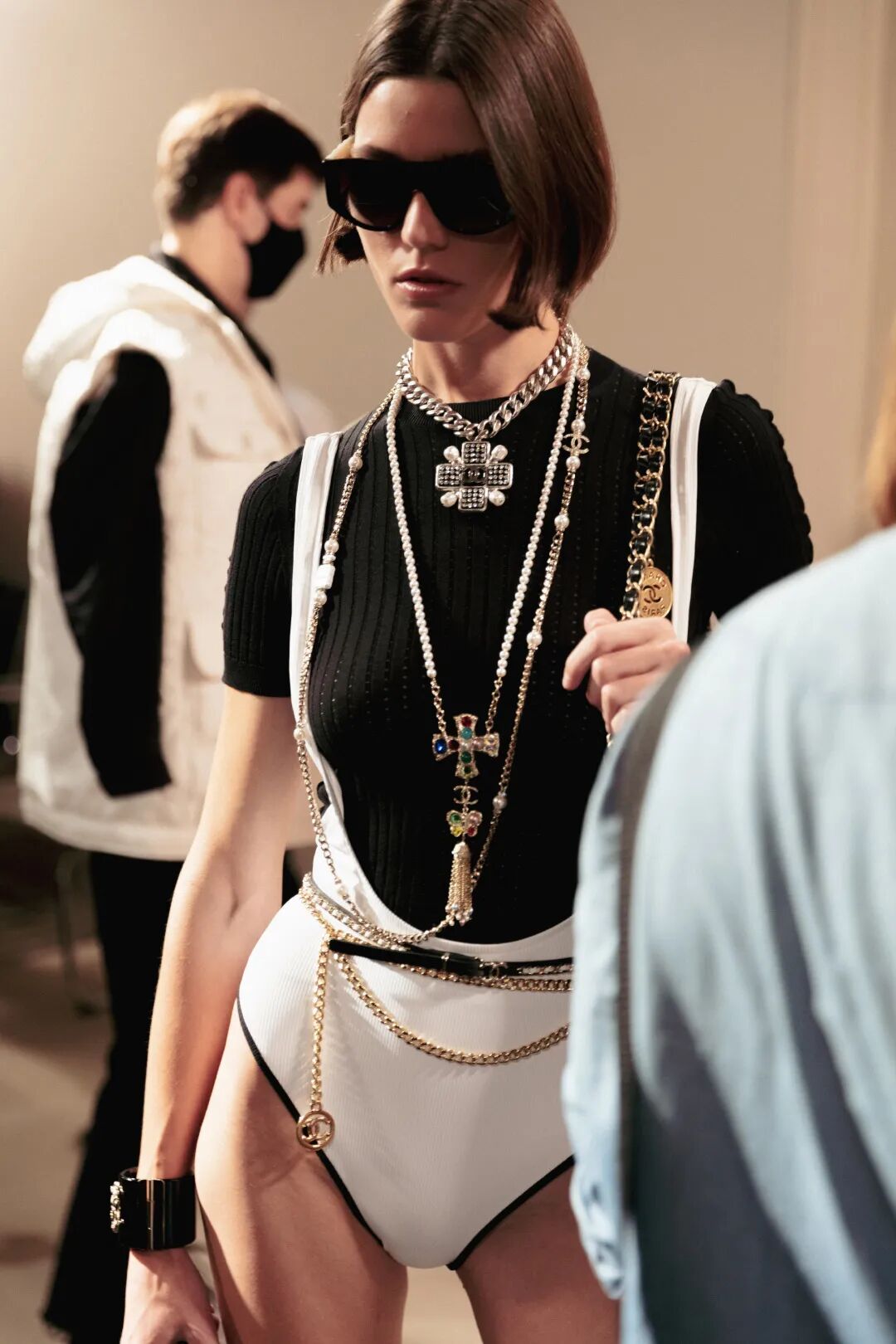 在 Chanel 中,粗花呢裙子套装的裙子则变得更短,夏日气息的金色、白色泳衣均被饰以黑色滚边,还有粉色或淡紫色的斜纹软呢短款连衣裙、渔网半身裙、丹宁套装,以及饰以多彩钩针编织的外套,它们在最原始的笔直T台上重现 1980 年代的美好时光。