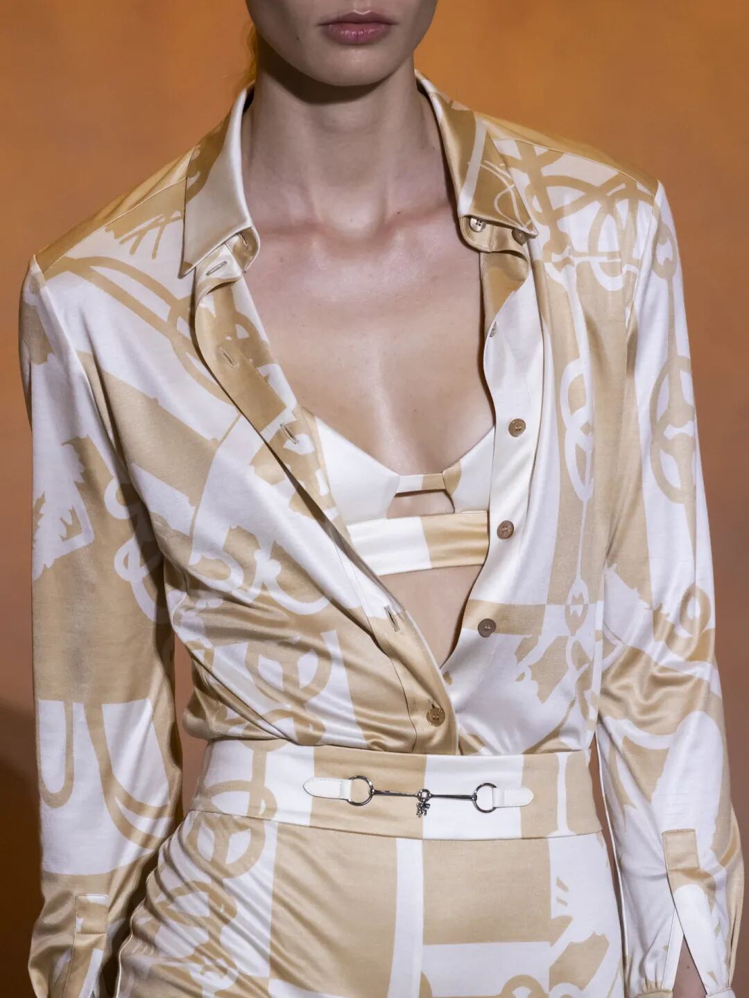Hermès 女装艺术总监 Nadège Vanhee-Cybulski 将时装秀放在了巴黎近郊的勒布尔热(Le Bourget)私人机场中,和大部分品牌一样,Nadège Vanhee-Cybulski 同样选择了去除掉秀场装置和多余的灯光,让人们的注意力都集中在时装以及秀场背景那 12 张橙黄色的巨幅绘画。