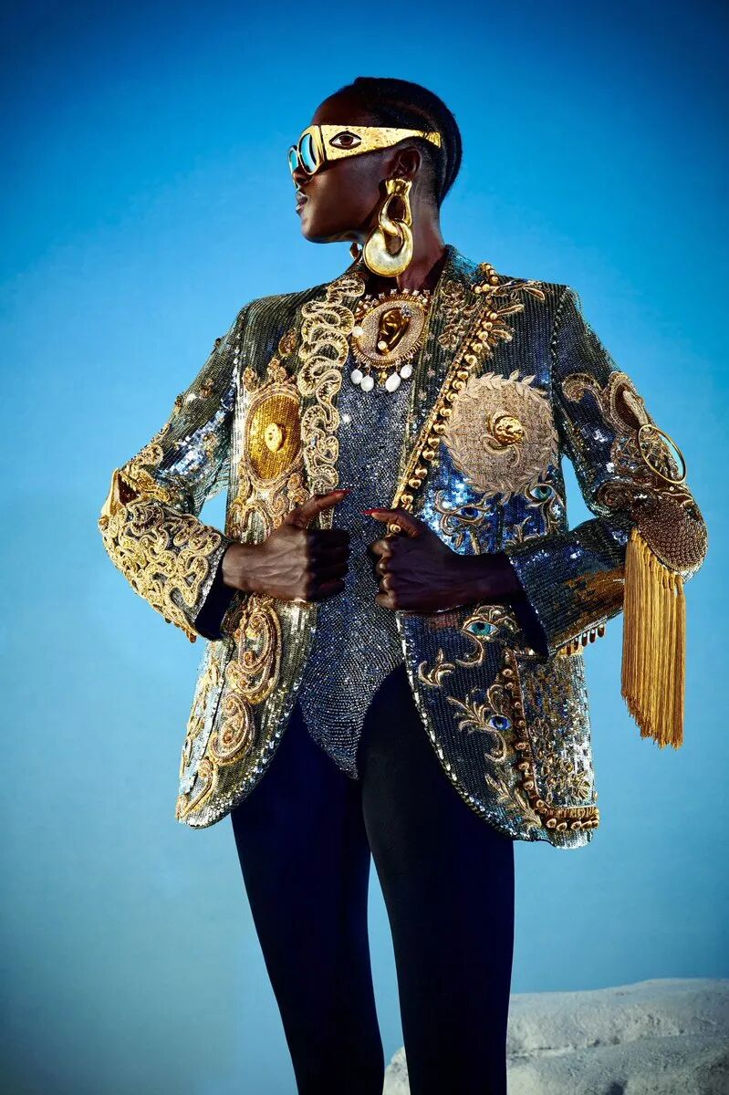 在设计师 Daniel Roseberry 手下重获新生的 Schiaparelli,一直是游走在时尚与艺术之间的平衡高手。时装屋创始人 Elsa Schiaparelli 就曾将达利的超现实主义艺术品带入时装设计之中,而如今,Daniel Roseberry 则把金色的金属模块作为强调女性身材的部件“镶嵌”在衣服上面,此外还有钥匙和眼睛等超现实主义艺术的符号式立体图案,Daniel Roseberry 在为时装注入幽默感的同时,也对当下时代的荒诞带来了反思。